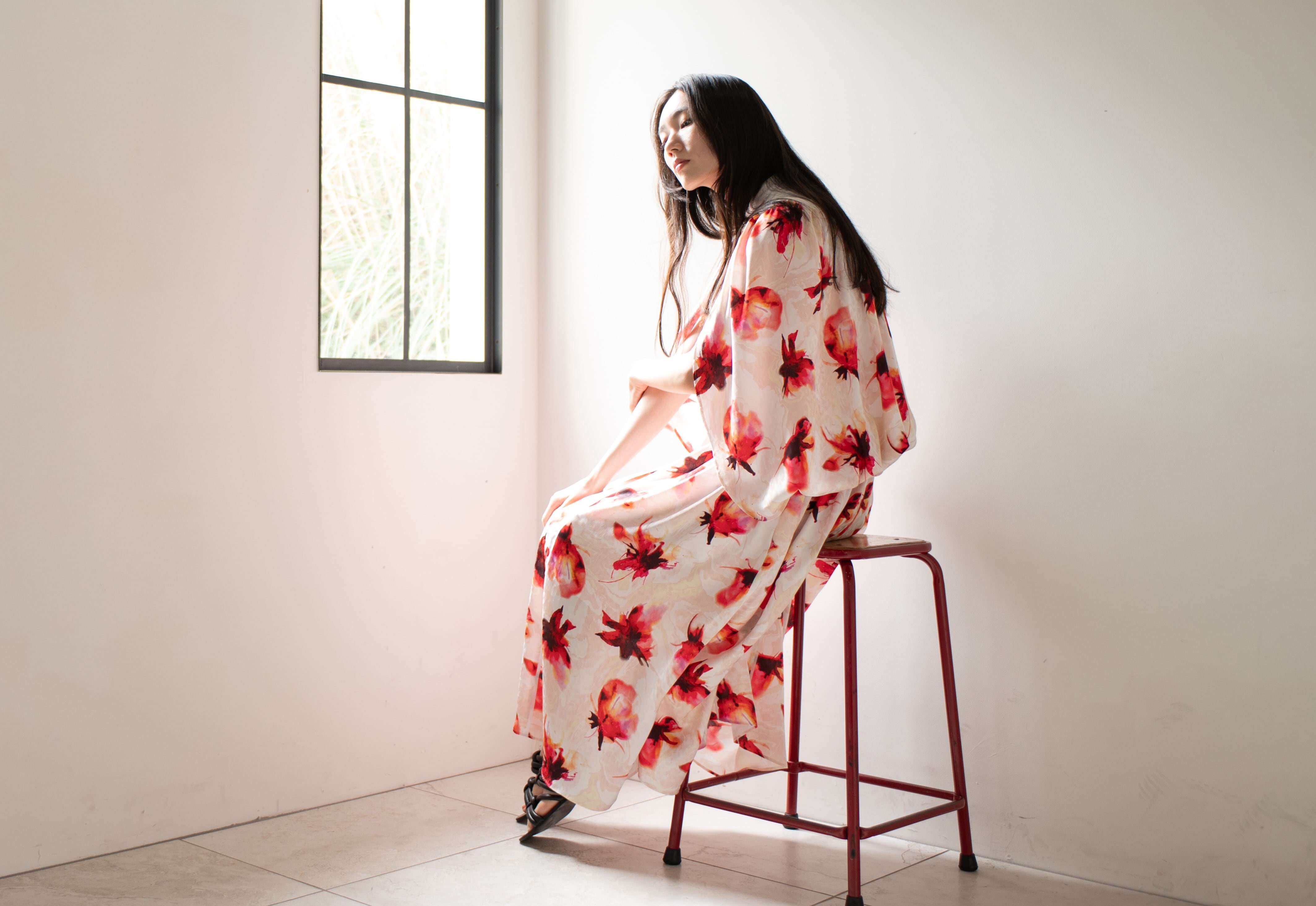 まるで花びらがそっと重なり合うような袖と裾のデザインが印象的なドレス。