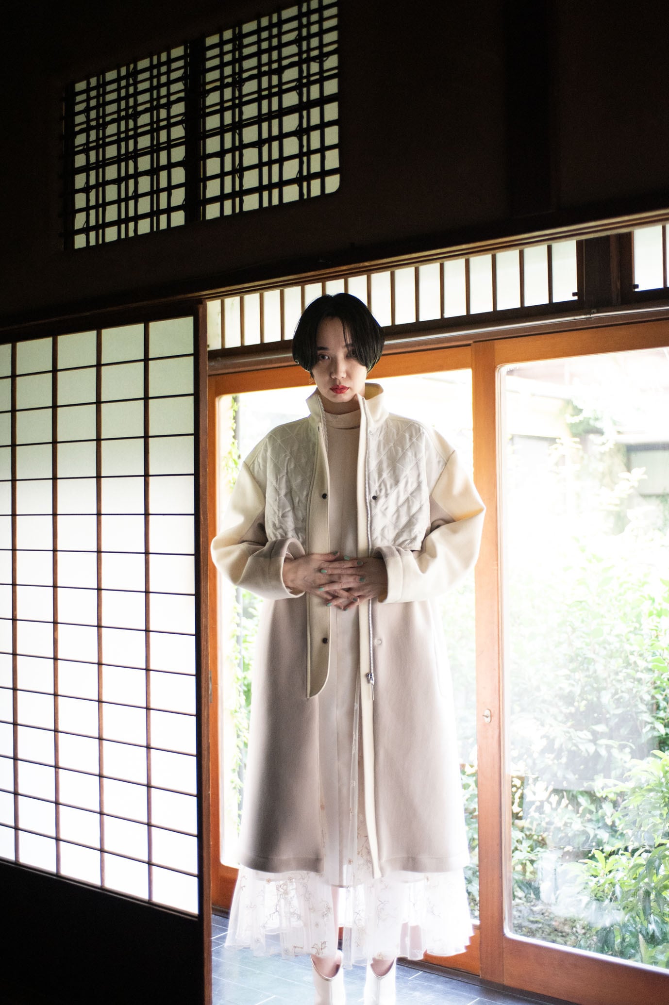 キルティングの切り替えがさりげない表情を添えたやわらかなニュアンスカラーのコートは、ミニマルでありながら奥行きのある佇まいに。