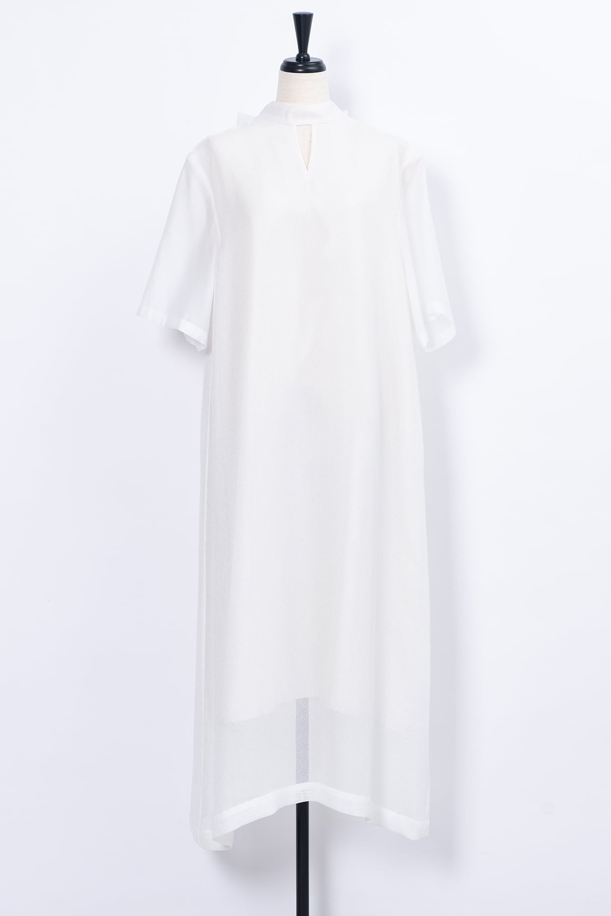 肌に張りつかず、さらりと風をまとう凹凸素材と、ハリのある生地を組み合わせ、シンプルながらも視線を惹きつけるデザインに仕立てました。
