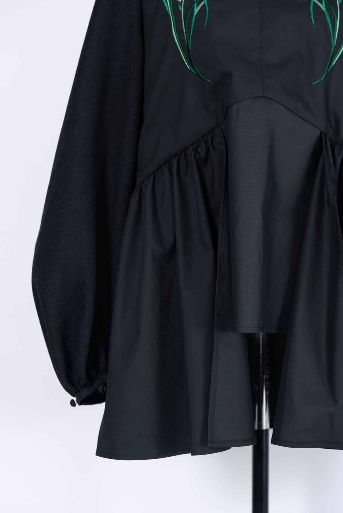 凹凸感のあるジャガード生地と、ハリのある高密のブロードを異素材で切り替えた刺繍ブラウス。