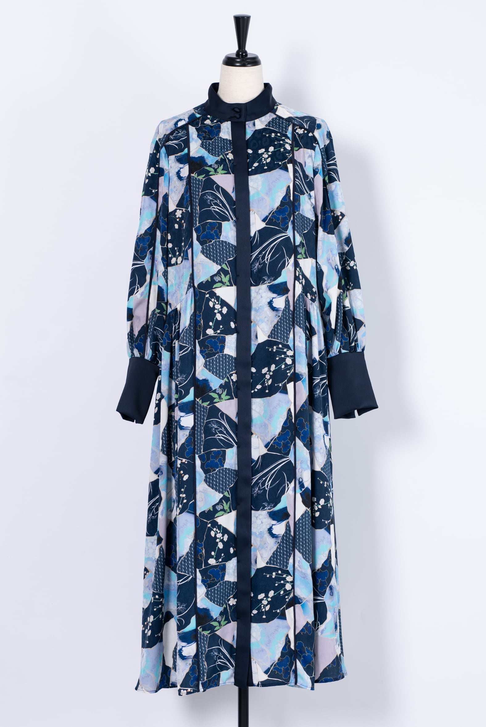 華やかなオリジナルプリントと、表情のあるサテン生地の異素材ドッキングが美しいドレス。