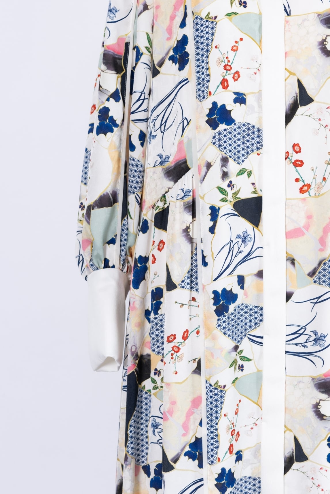 華やかなオリジナルプリントと、表情のあるサテン生地の異素材ドッキングが美しいドレス。