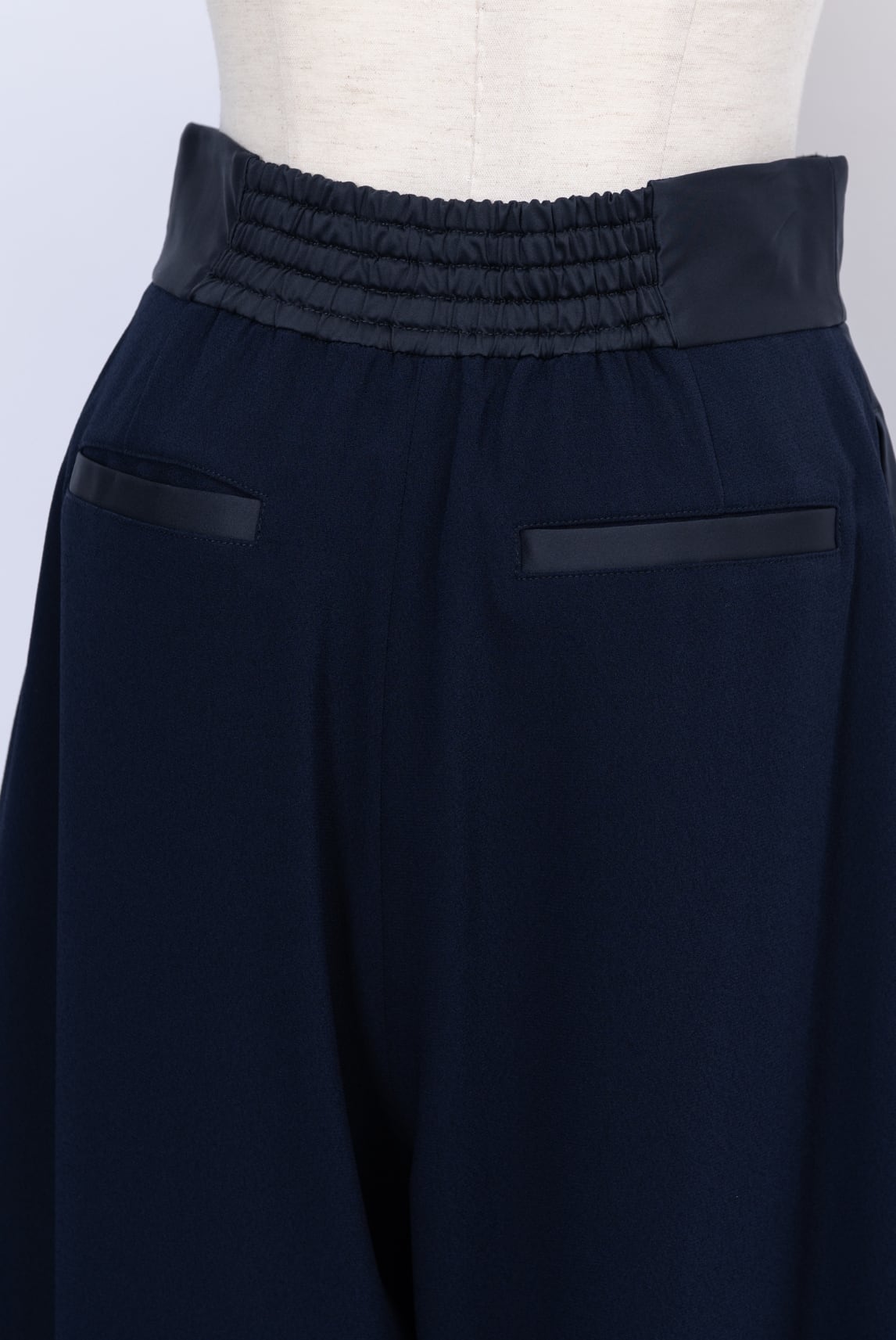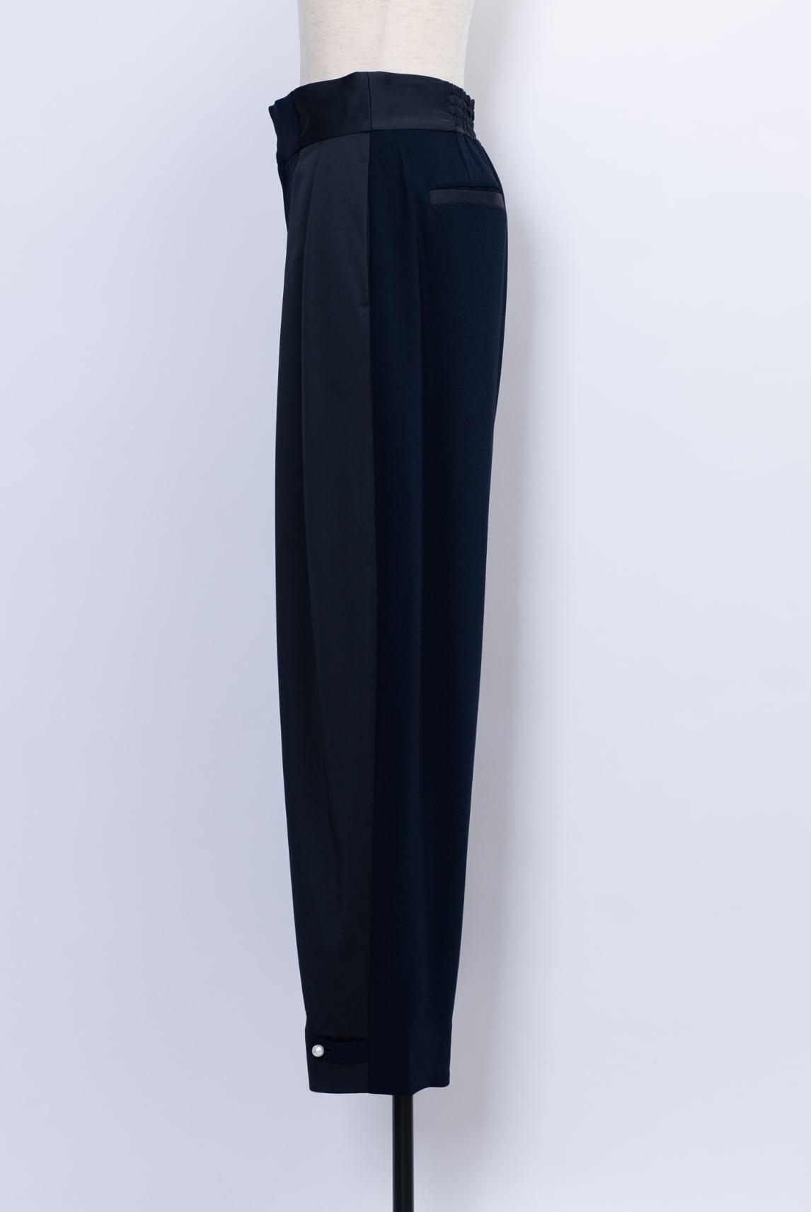 上質なジョーゼット生地と光沢のあるサテン生地を異素材で組み合わせたリュクスな印象のタックパンツ。