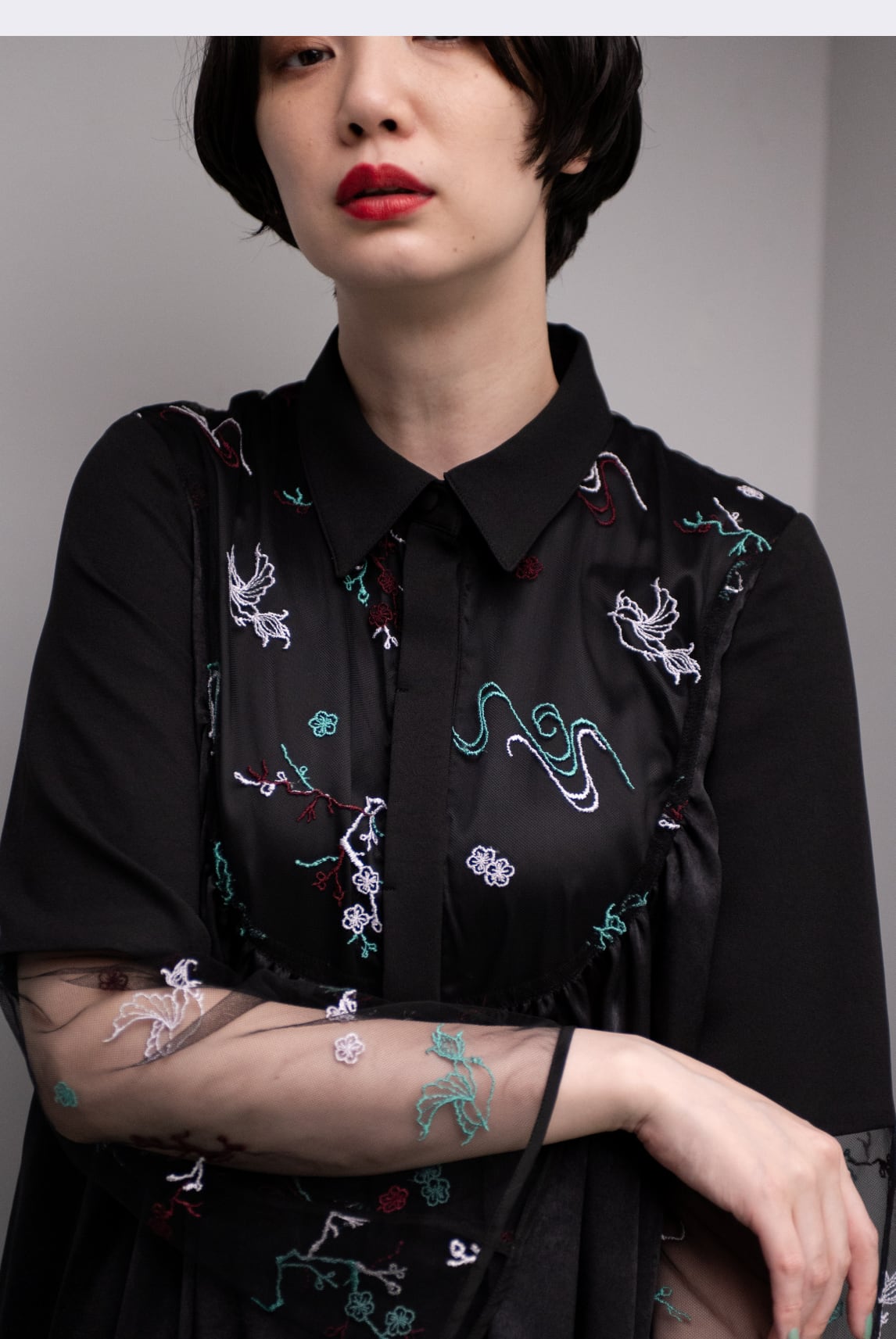 刺繍を贅沢に施したヨーク部分と、軽やかに透けるチュールスリーブが優雅でいて印象的なコントラストを生み出します。