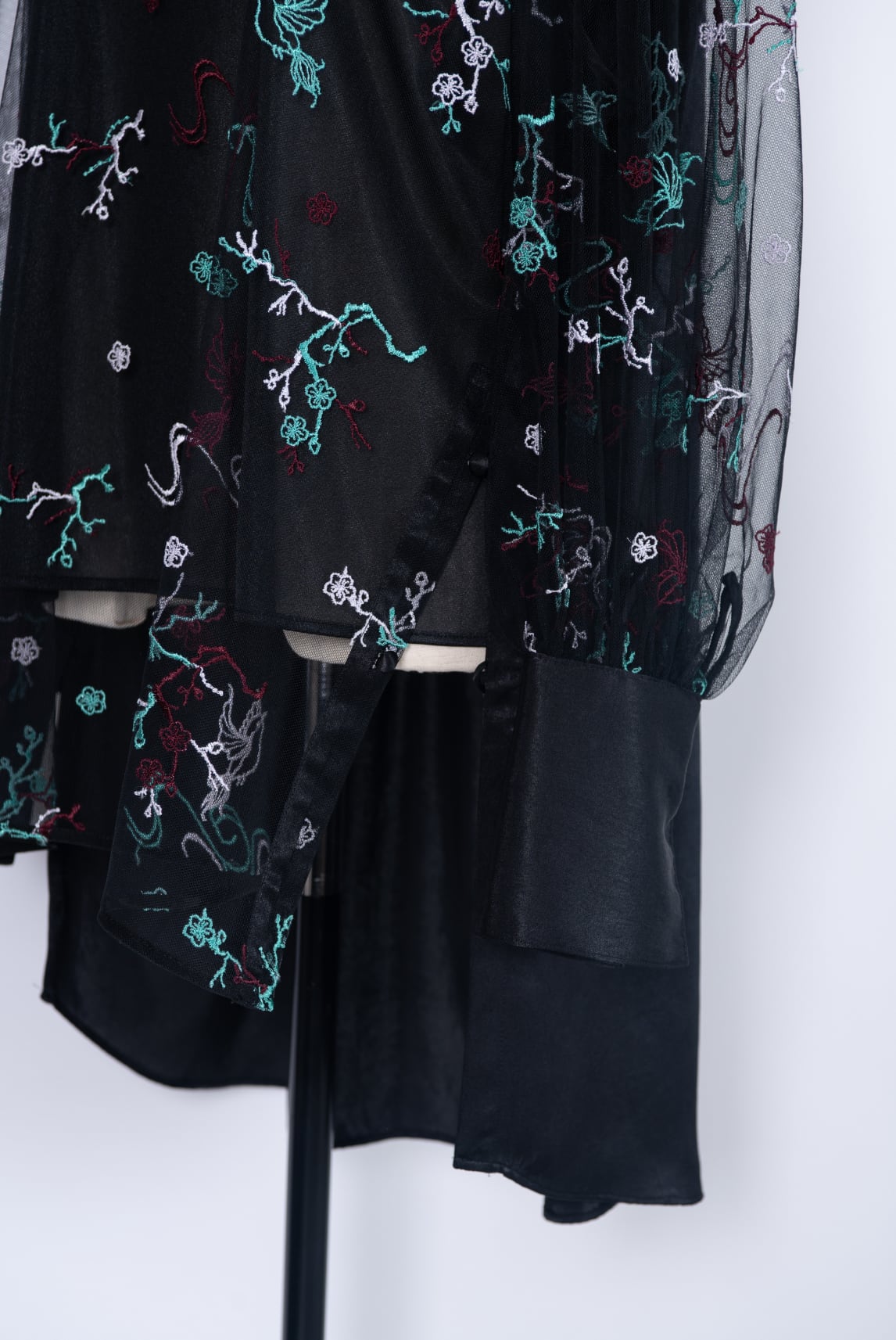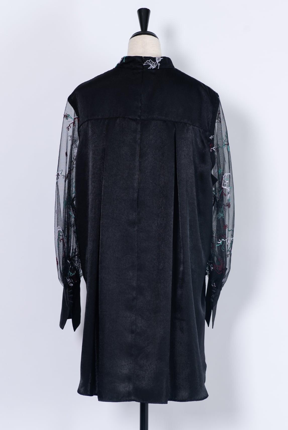 繊細な透け感をもつチュールに丹念に重ねられた刺繍生地と、クラッシュした光沢感のある滑らかなサテン生地の異素材で仕立てたブラウス。