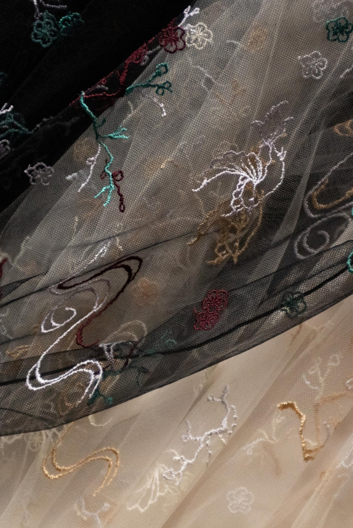 繊細な透け感をもつチュールに丹念に重ねられた刺繍生地と、クラッシュした光沢感のある滑らかなサテン生地の異素材で仕立てたブラウス。