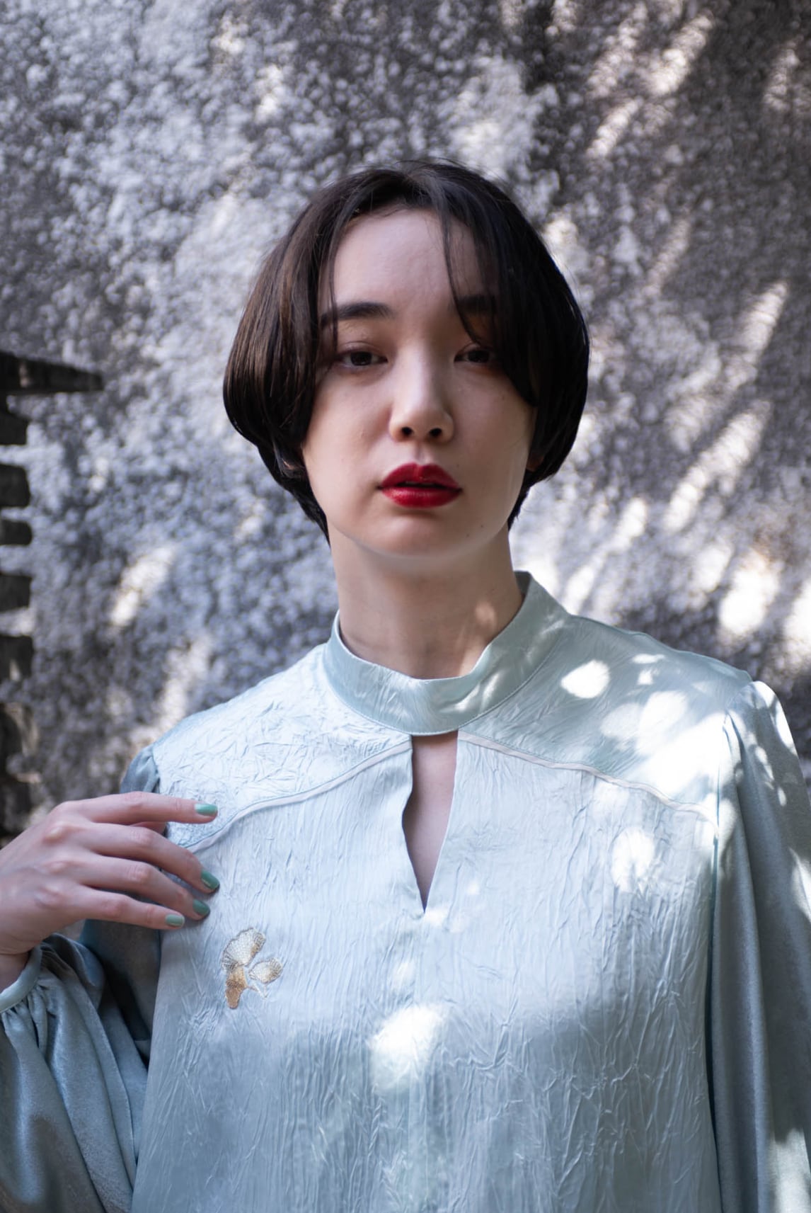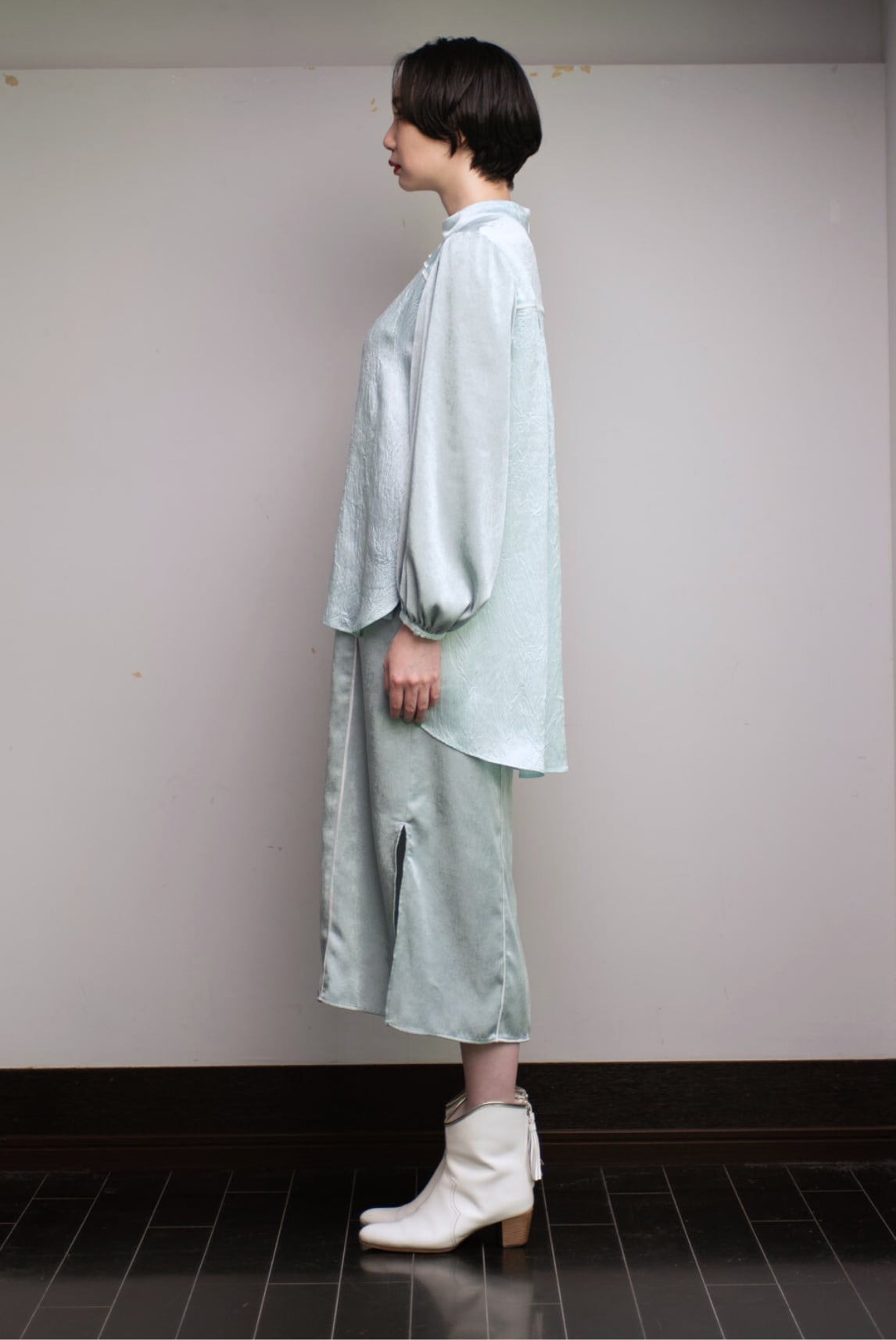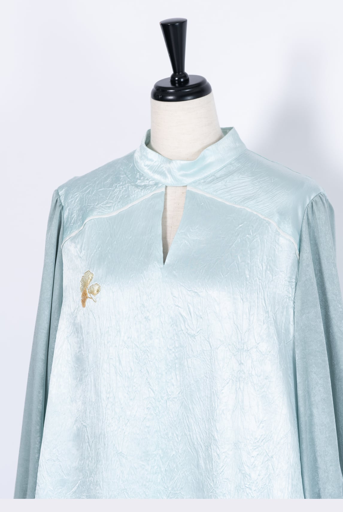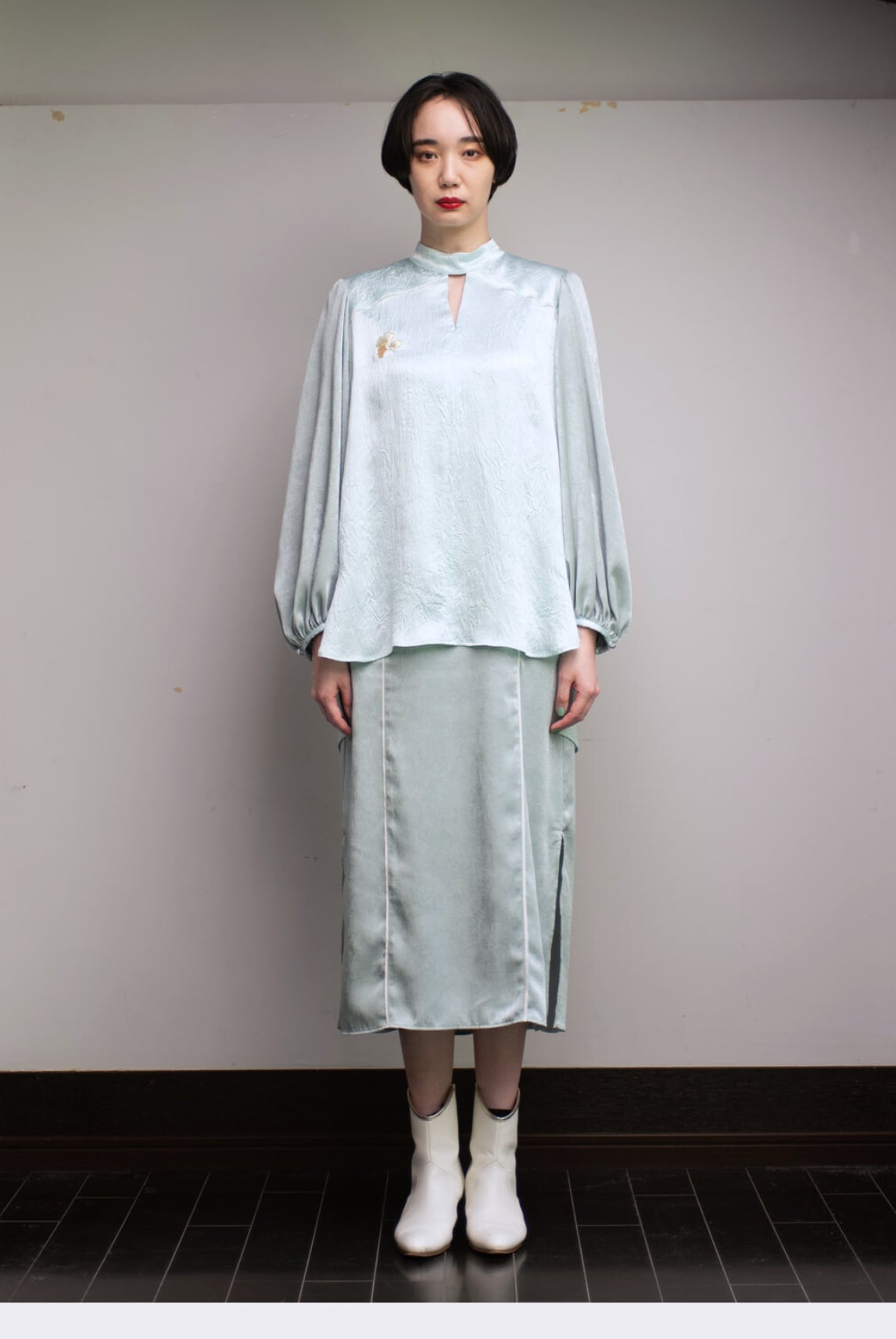 上見頃にはクラッシュ加工を施したサテン生地を、袖とスカート部分にはビンテージ感のある滑らかなサテン生地を使用。