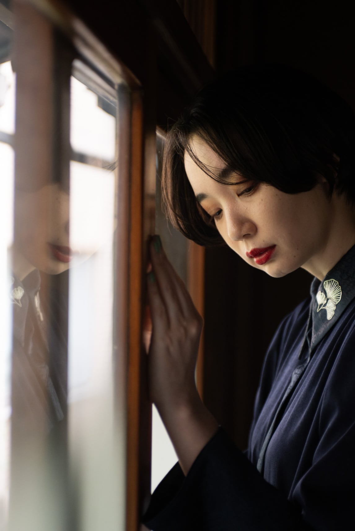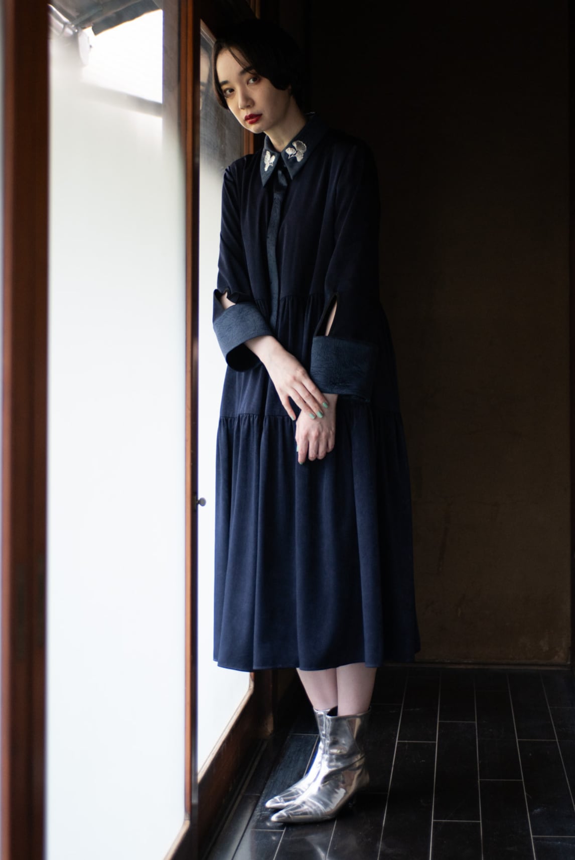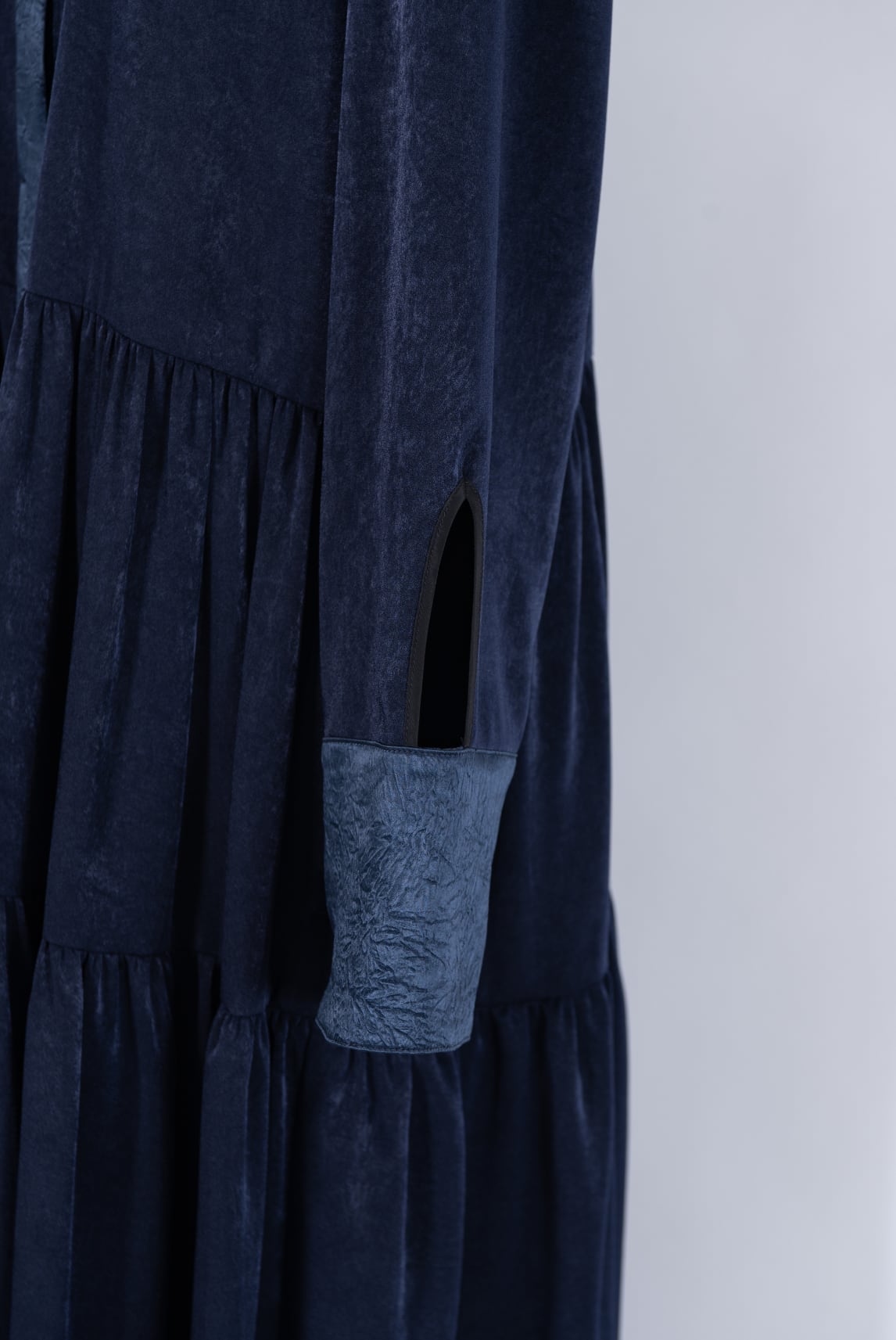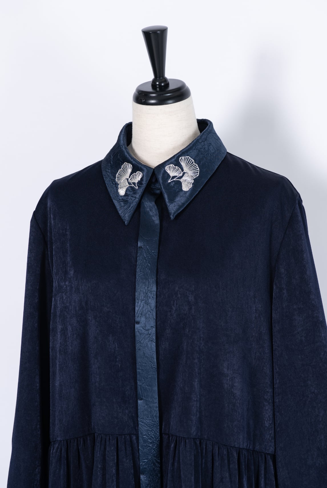 襟と前立て、カフスにはクラッシュ加工を施したサテン生地を、見頃にはビンテージ感のある滑らかなサテン生地を使用。