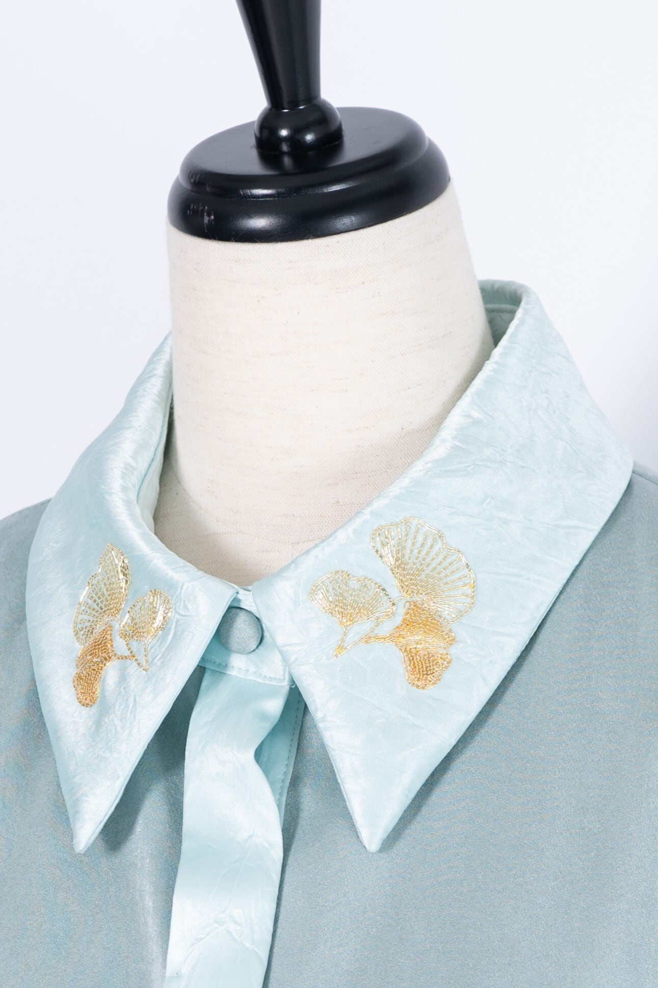 襟と前立て、カフスにはクラッシュ加工を施したサテン生地を、見頃にはビンテージ感のある滑らかなサテン生地を使用。
