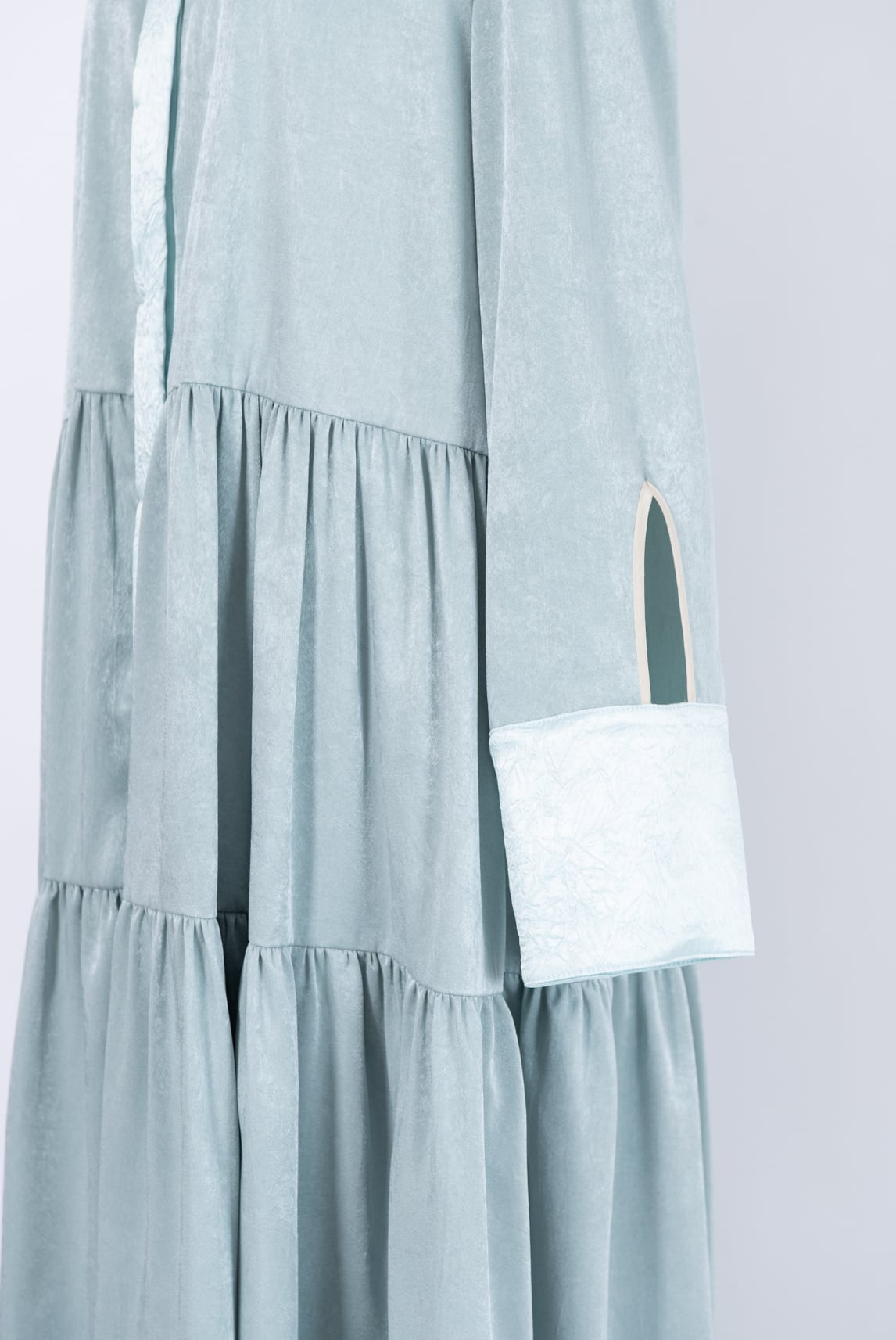 たっぷりとギャザーを入れたティアードデザインのドレスは、動いたときにドラマティックなシルエットに。