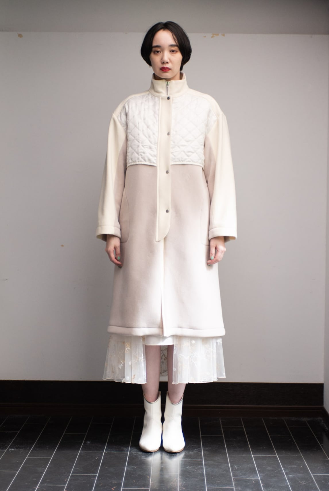柔らかな色調と異素材のコンビネーションが生み出す構築的なフォルムのコートは、冬の装いをやさしく包み込む洗練された一着です。