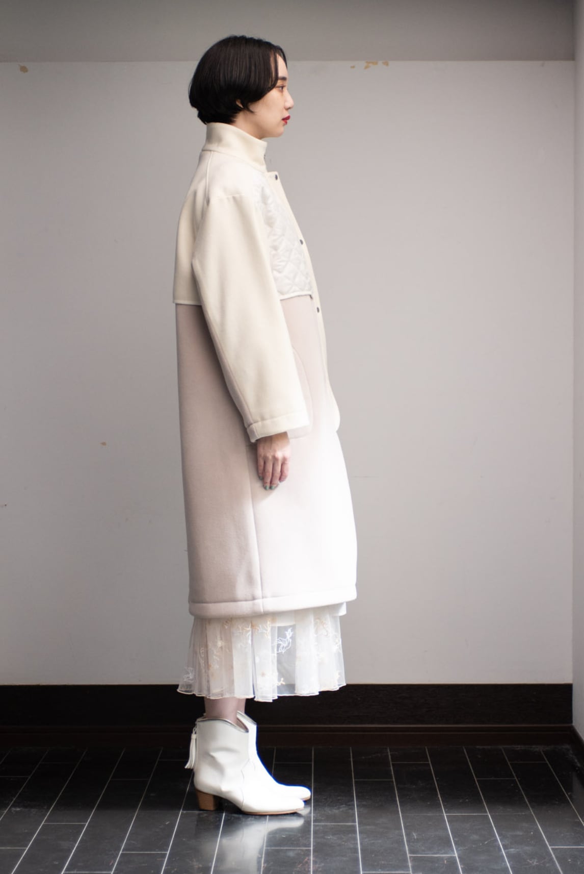ふっくらとしたフリース、上質なラムのメルトン、そして光沢が美しいキルティングの3素材を組み合わせた、Arobeらしい構築的なコート。