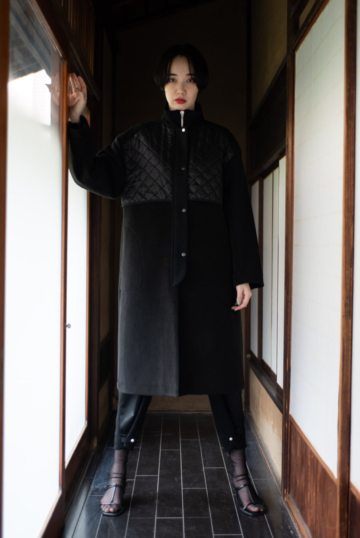 ふっくらとしたフリース、上質なラムのメルトン、そして光沢が美しいキルティングの3素材を組み合わせた、Arobeらしい構築的なコート。