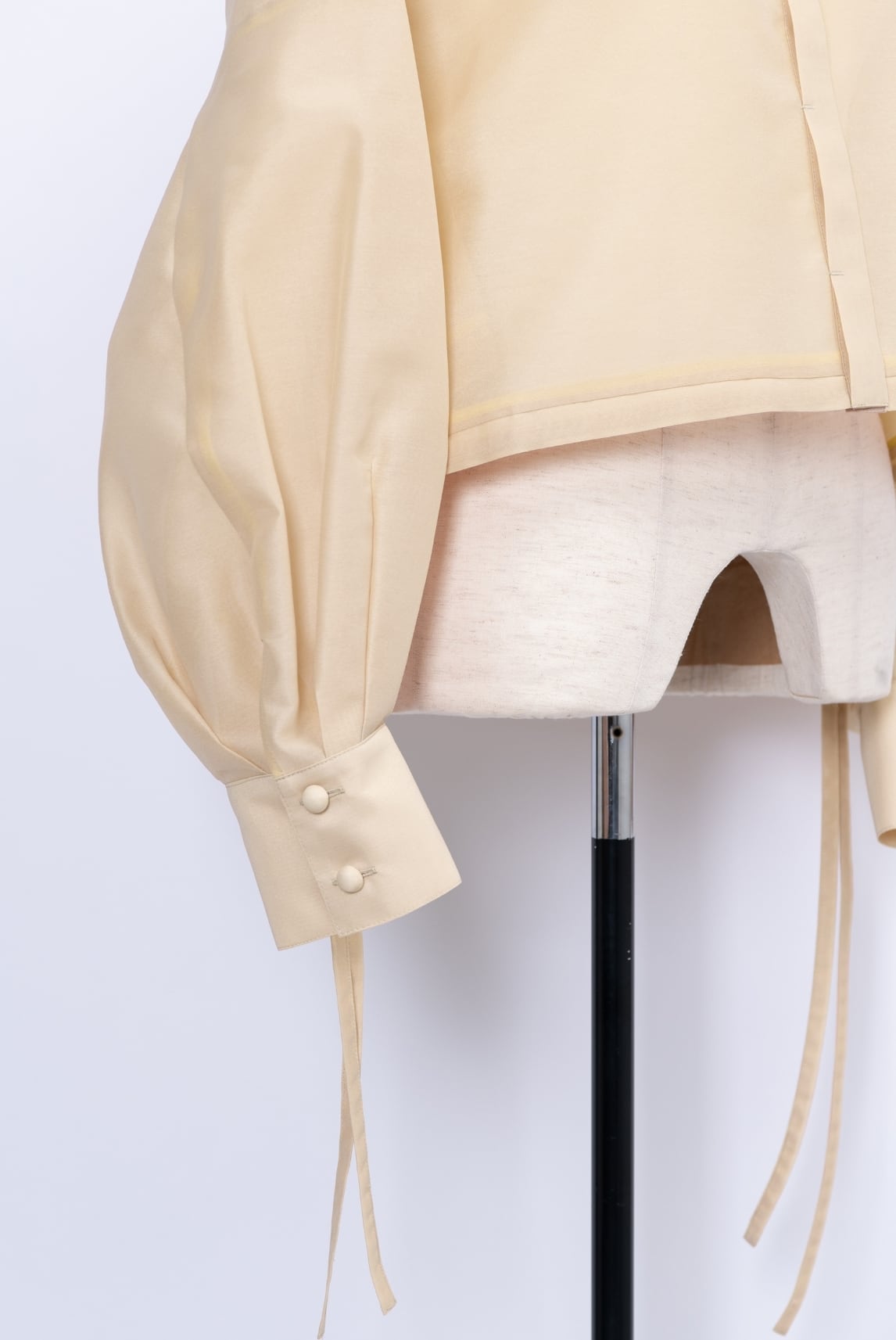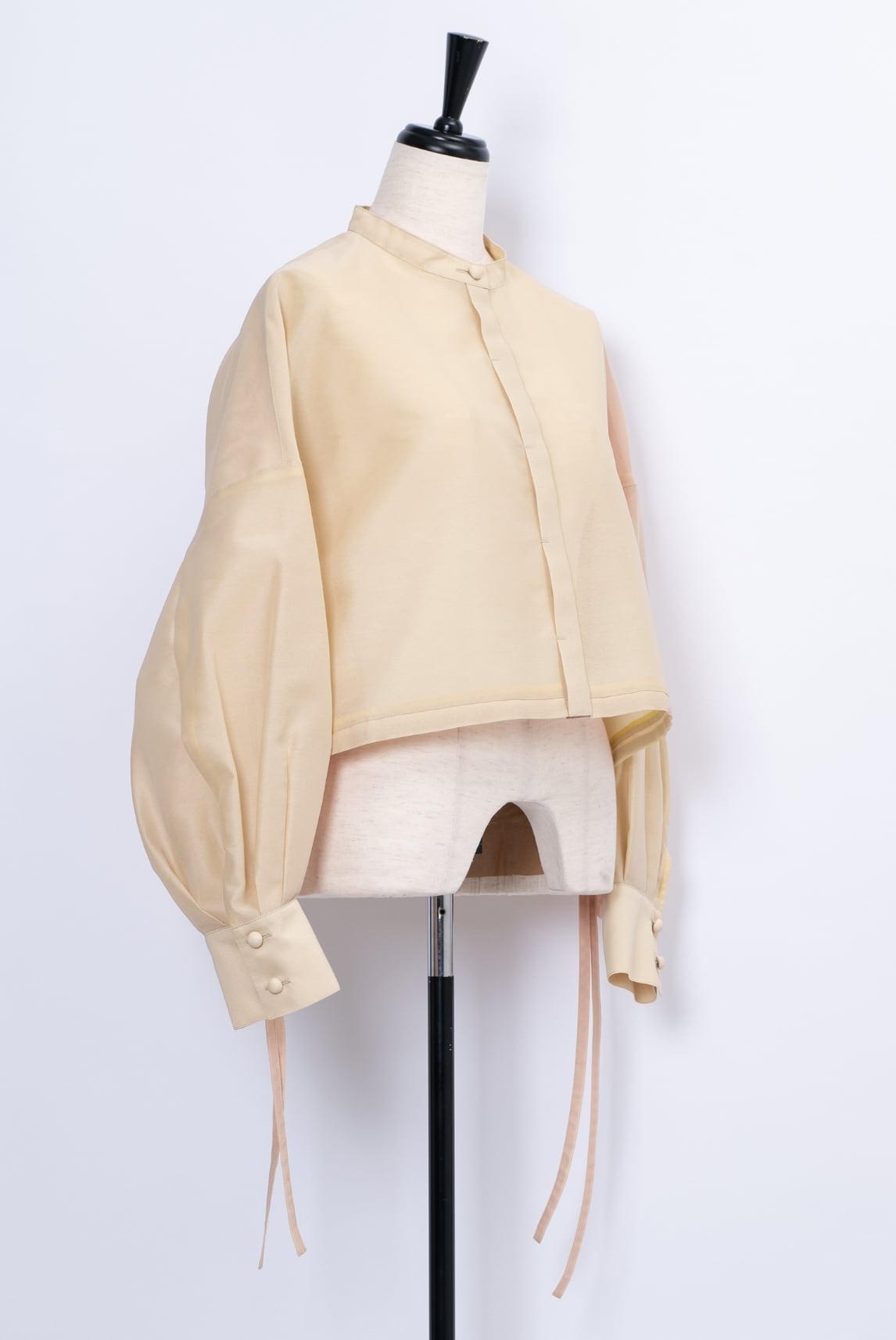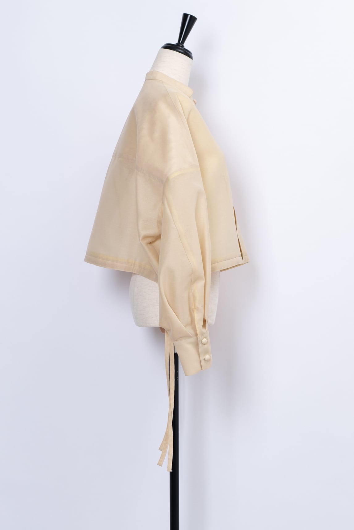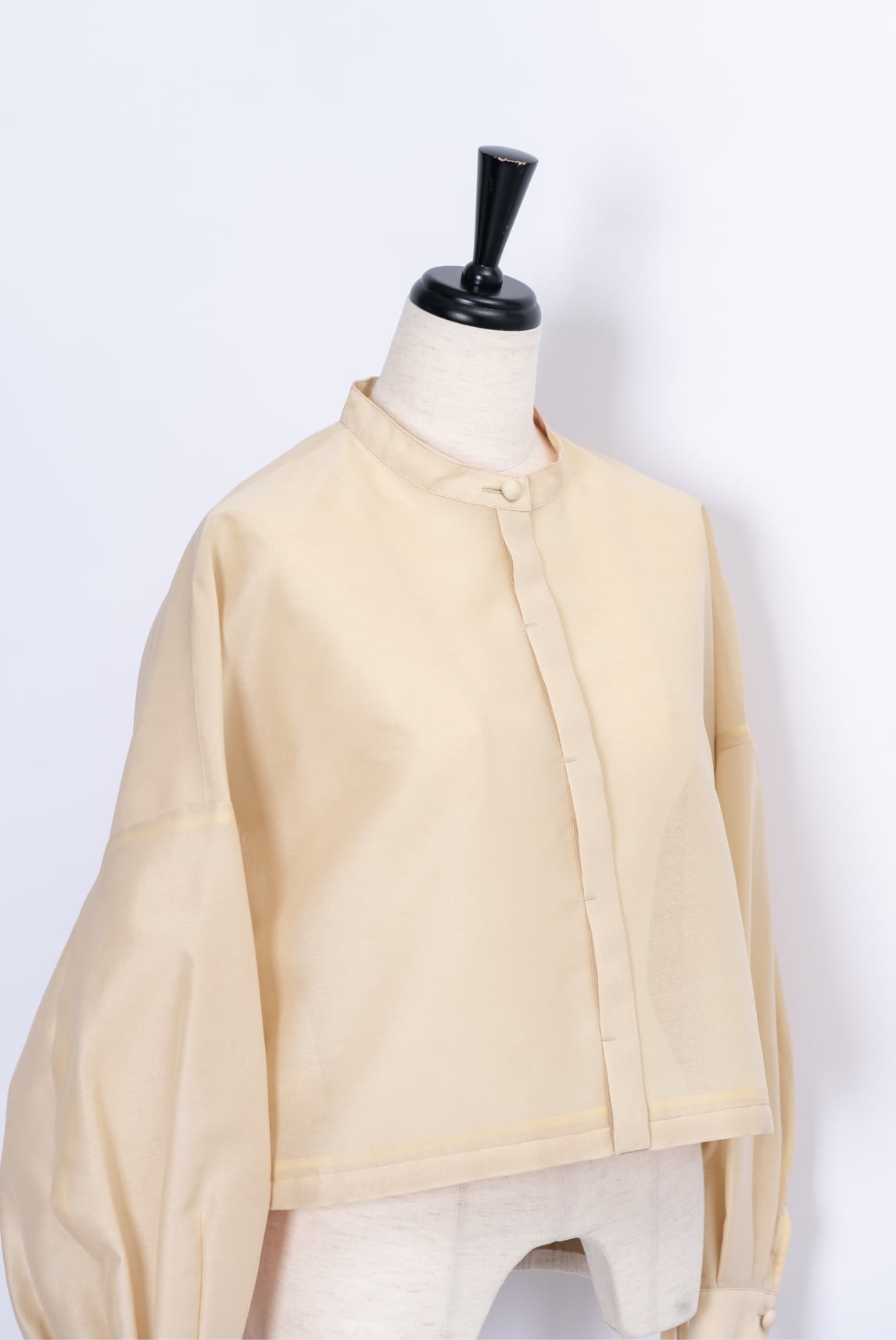 ワイドなゆったりシルエットと袖口のタックでふくらみをもたせた立体的なスリーブは、羽織るだけで洗練された印象に。