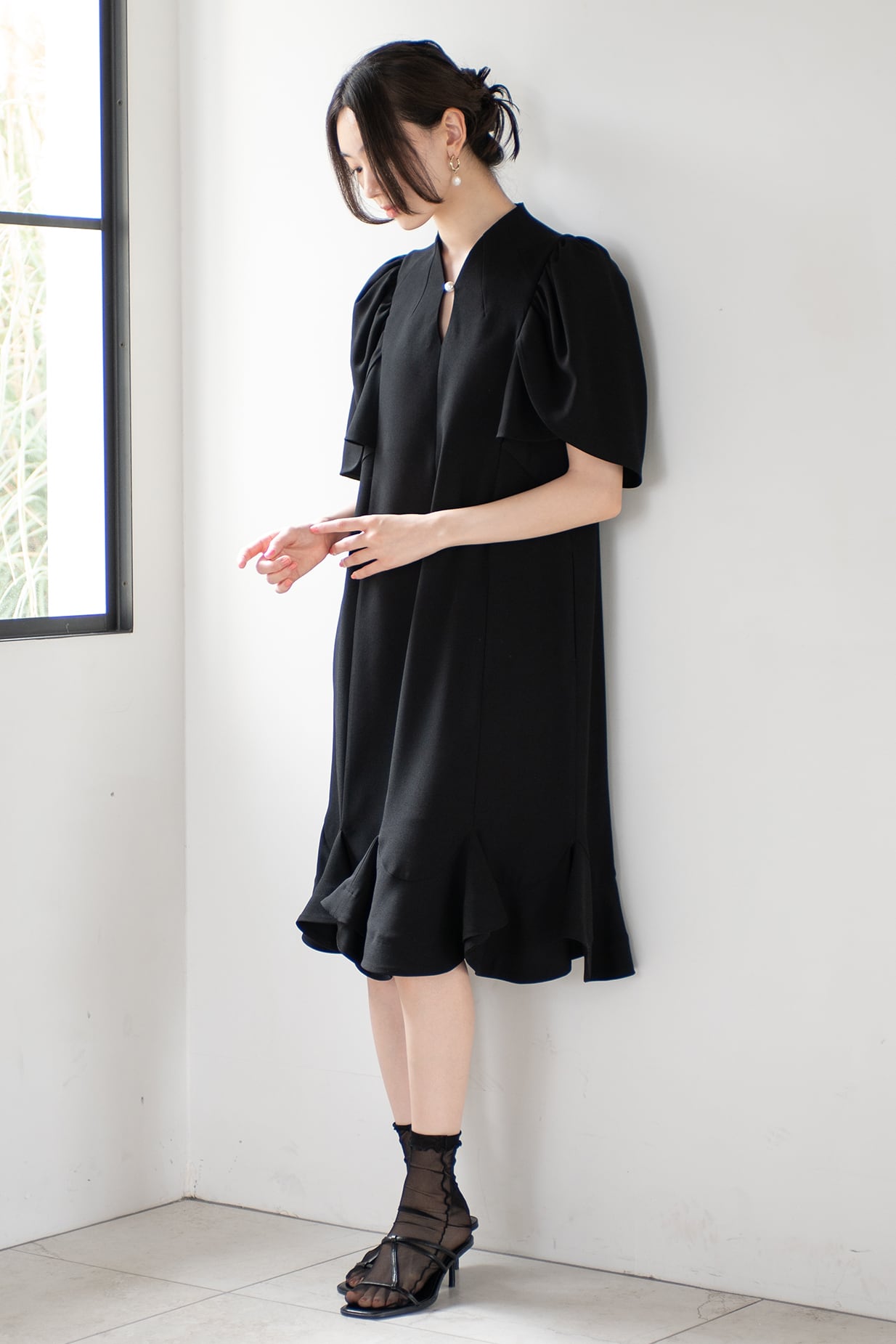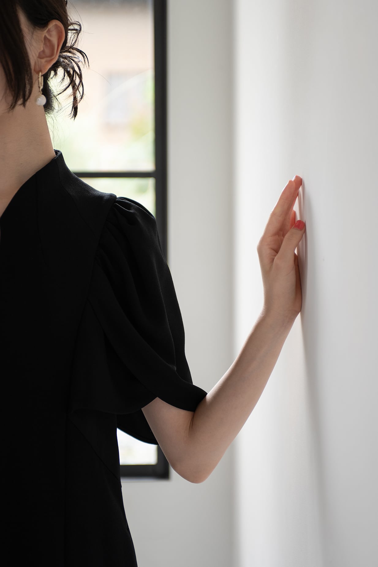 ゆるやかに首に沿ったボトルネックをベースに、スリットを入れたカーブネックのフロントには一粒のパールがあしらわれ優雅でクラシックな雰囲気をプラス。