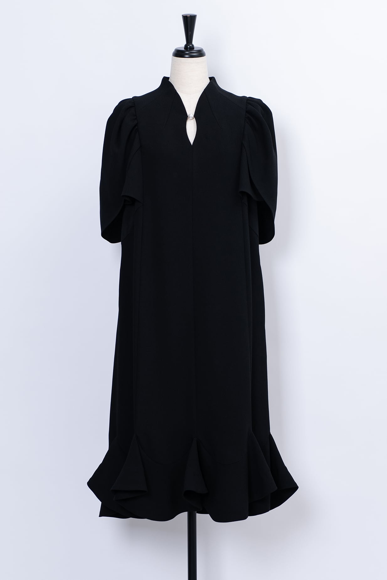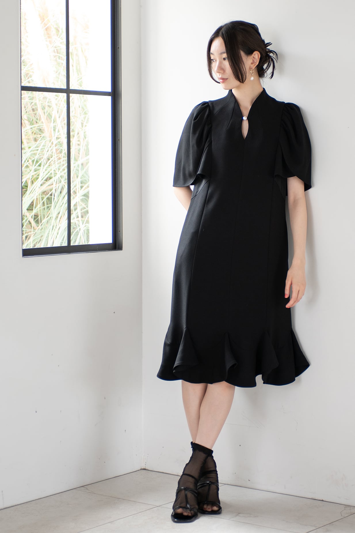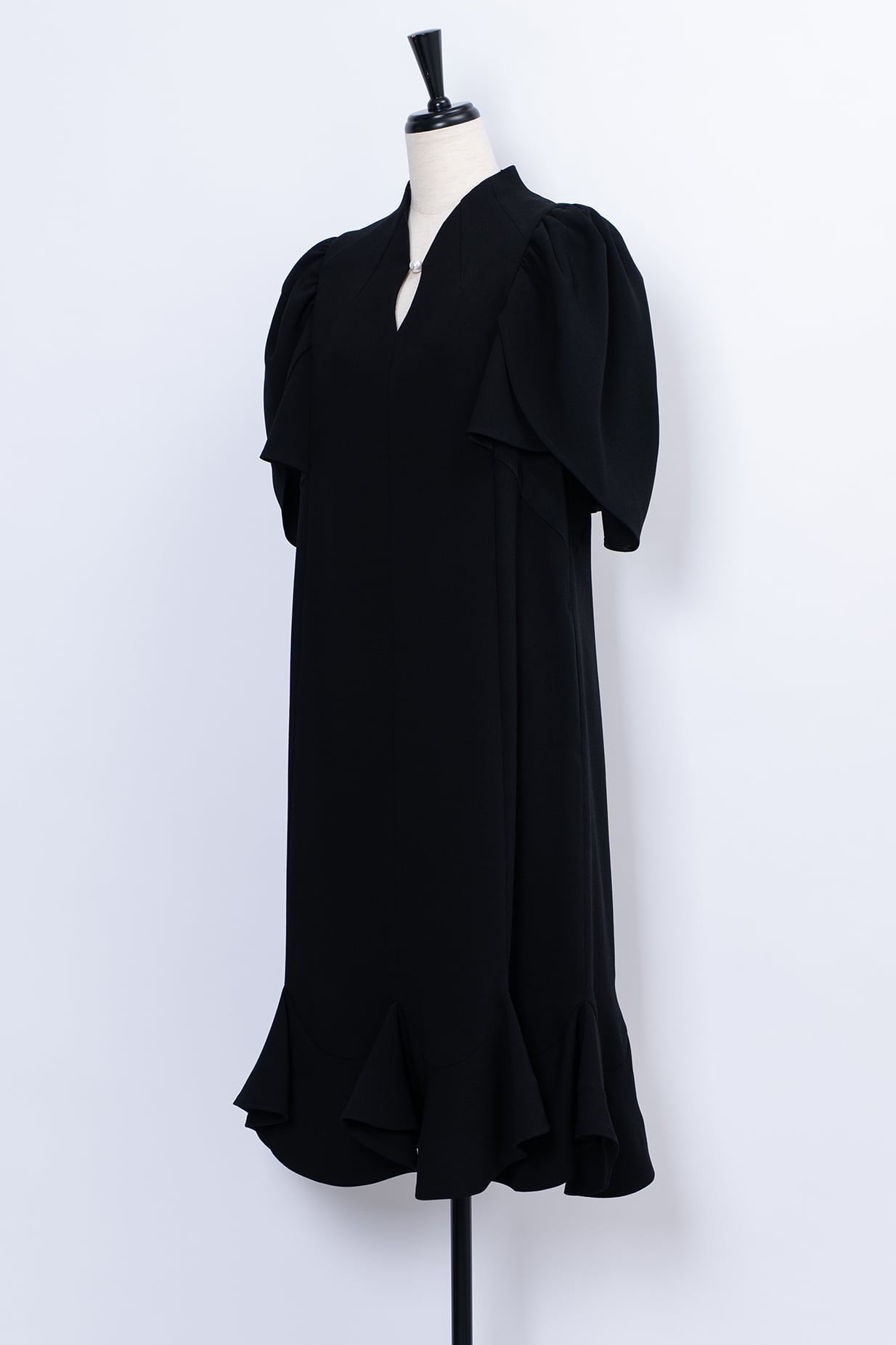 まるで花びらがそっと重なり合うような袖と裾のデザインが印象的なドレス。