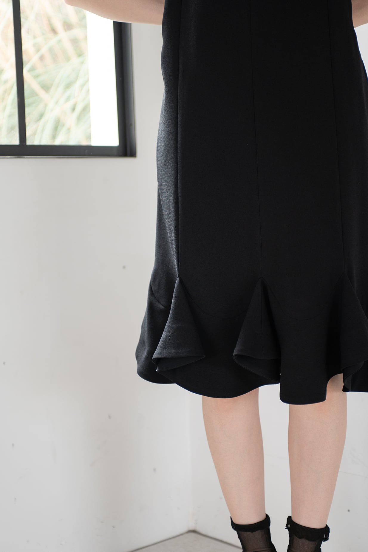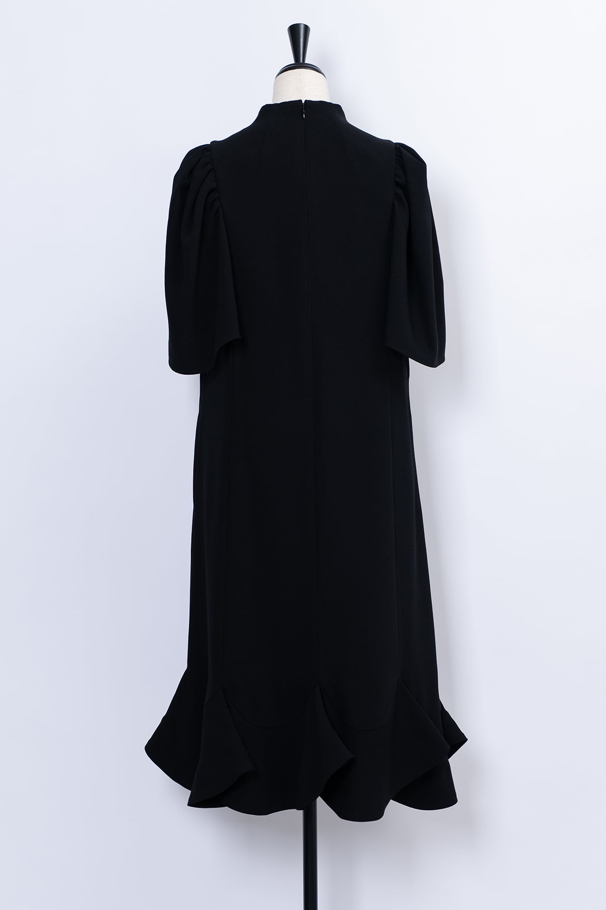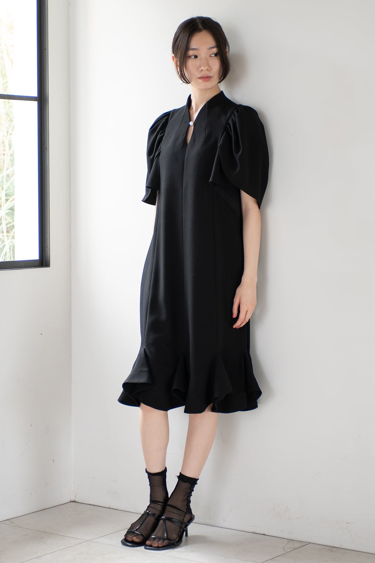まるで花びらがそっと重なり合うような袖と裾のデザインが印象的なドレス。