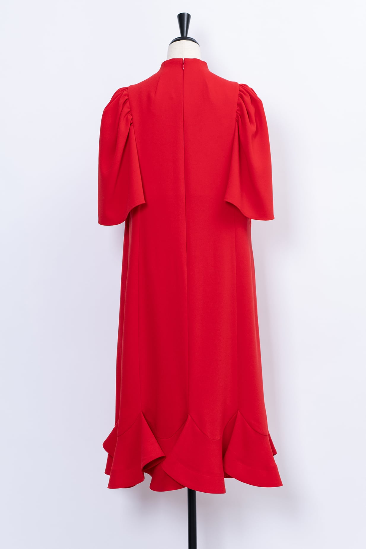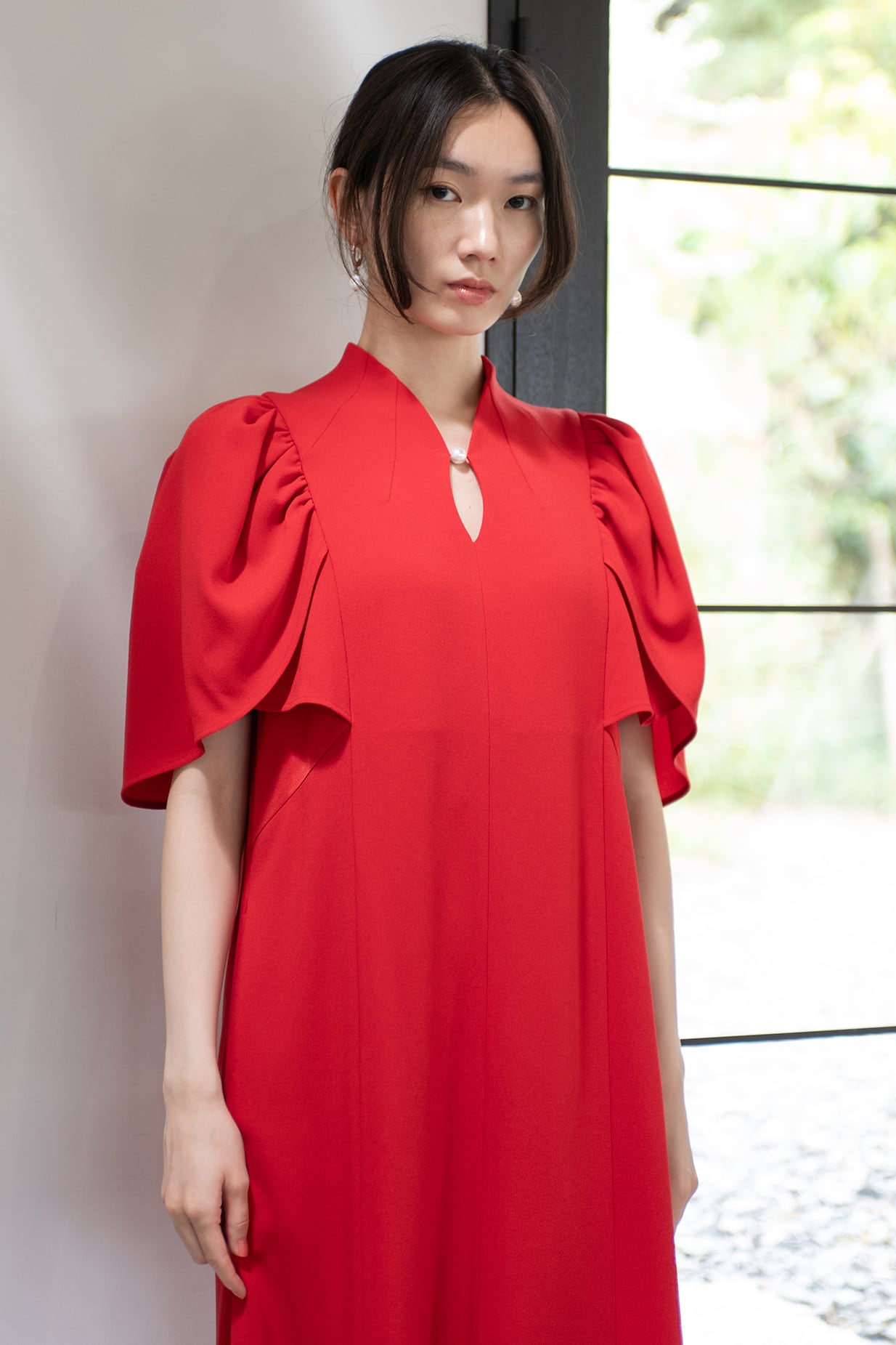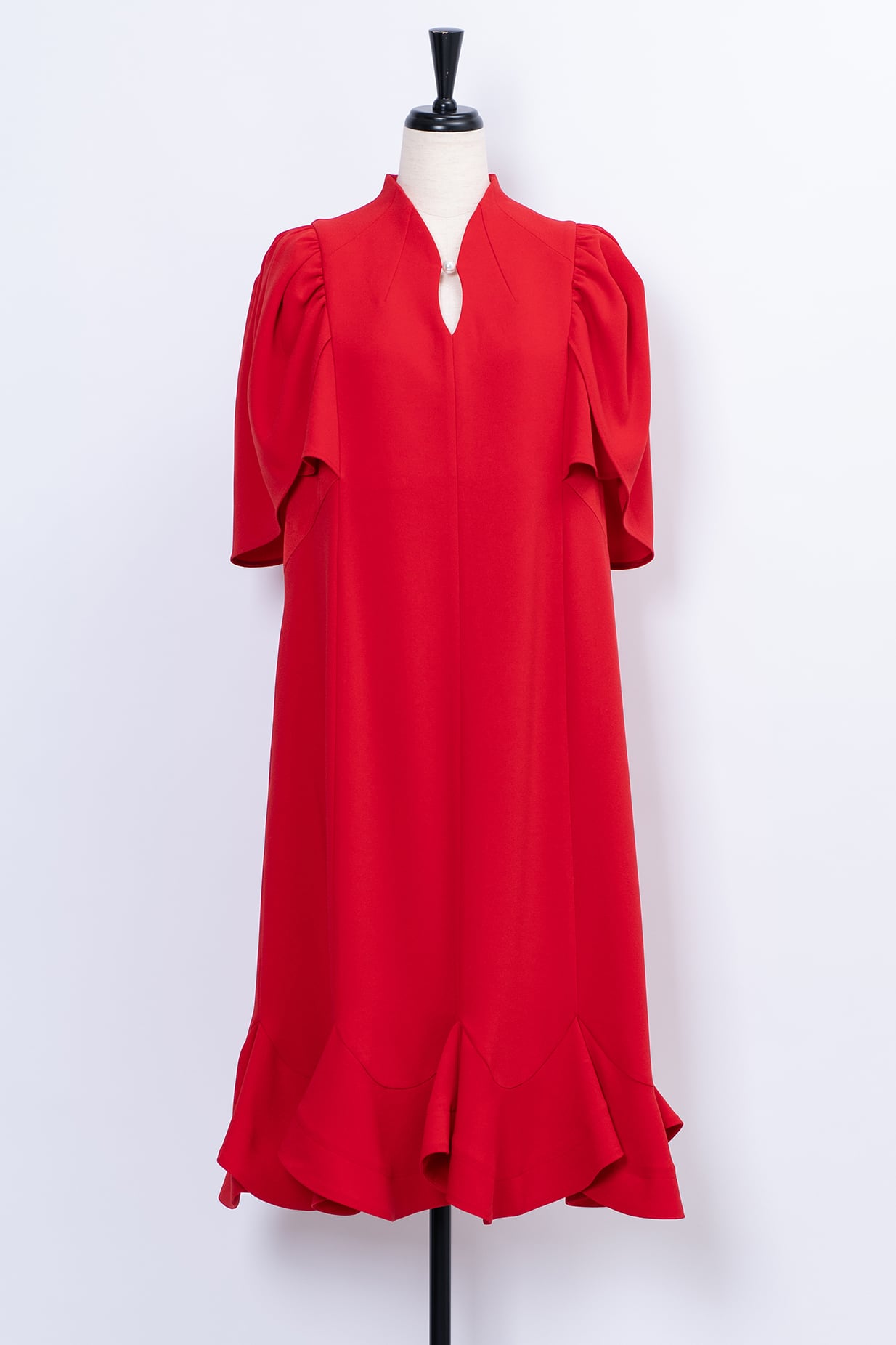 まるで花びらがそっと重なり合うような袖と裾のデザインが印象的なドレス。