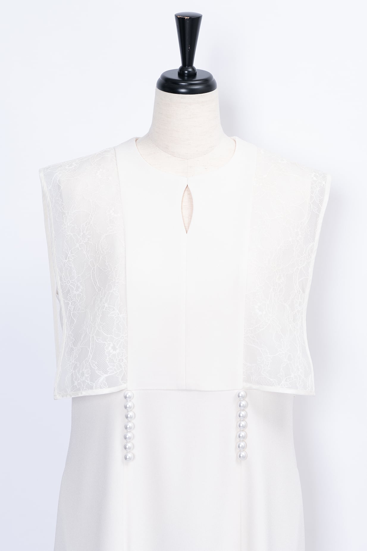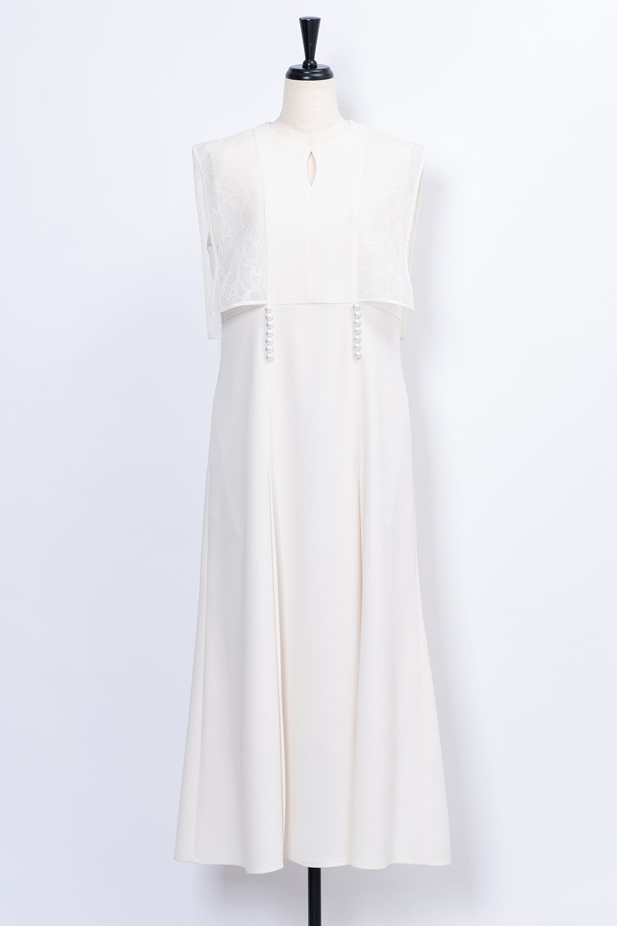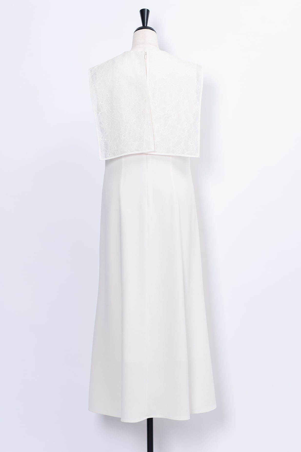繊細なフラワーレースを重ねたボックスカラーが印象的なロングドレス。
