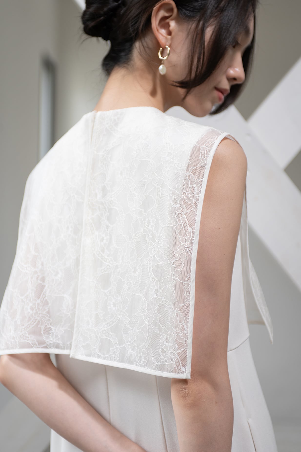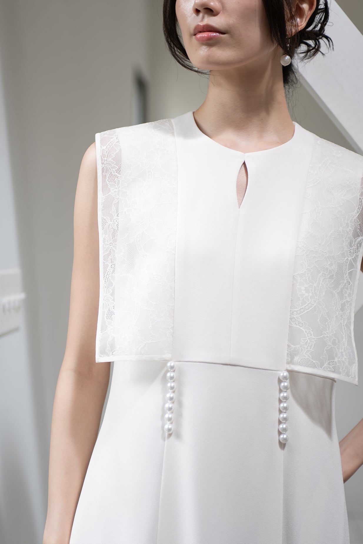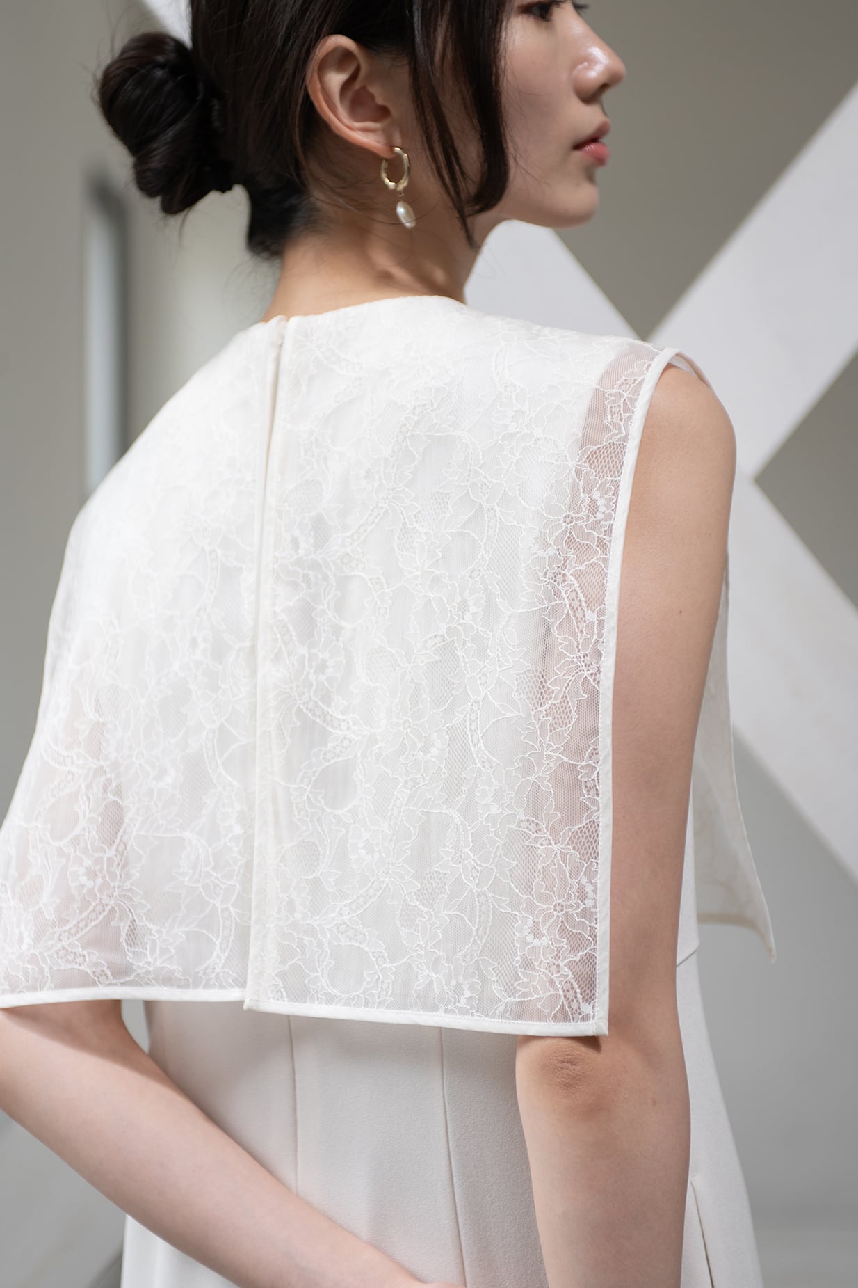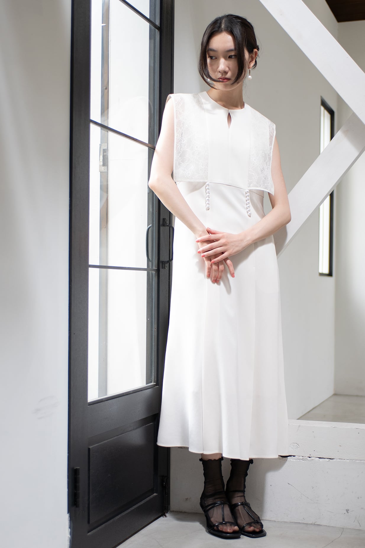 繊細なフラワーレースを重ねたボックスカラーが印象的なロングドレス。