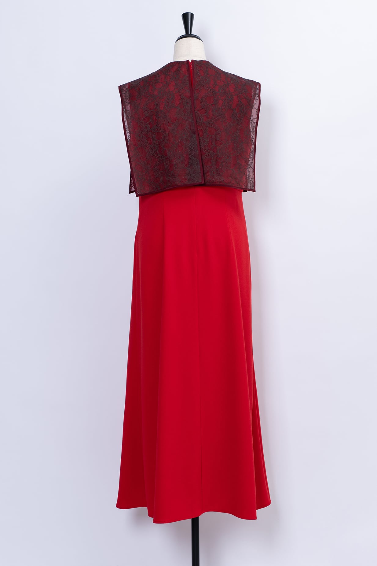 繊細なフラワーレースを重ねたボックスカラーが印象的なロングドレス。