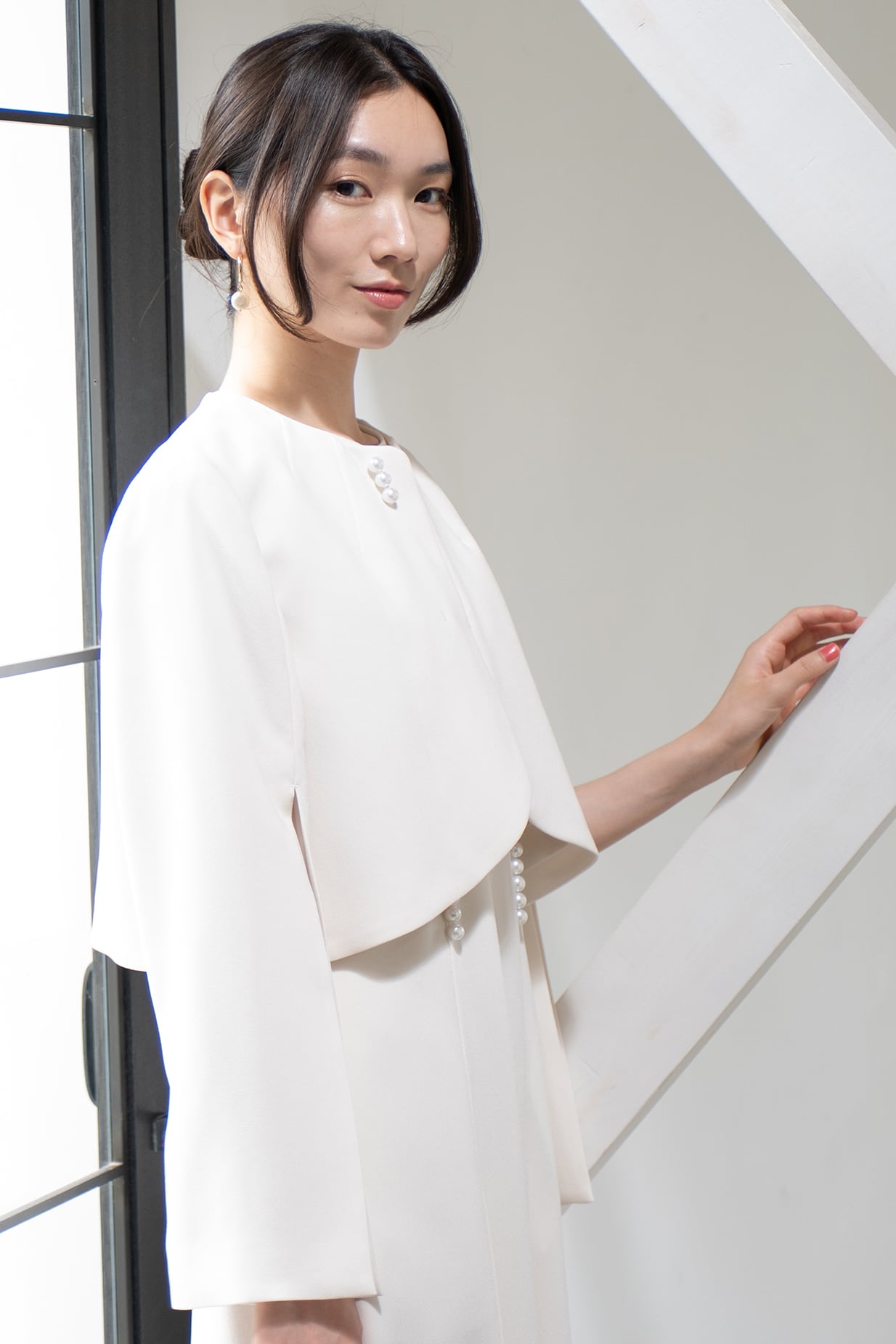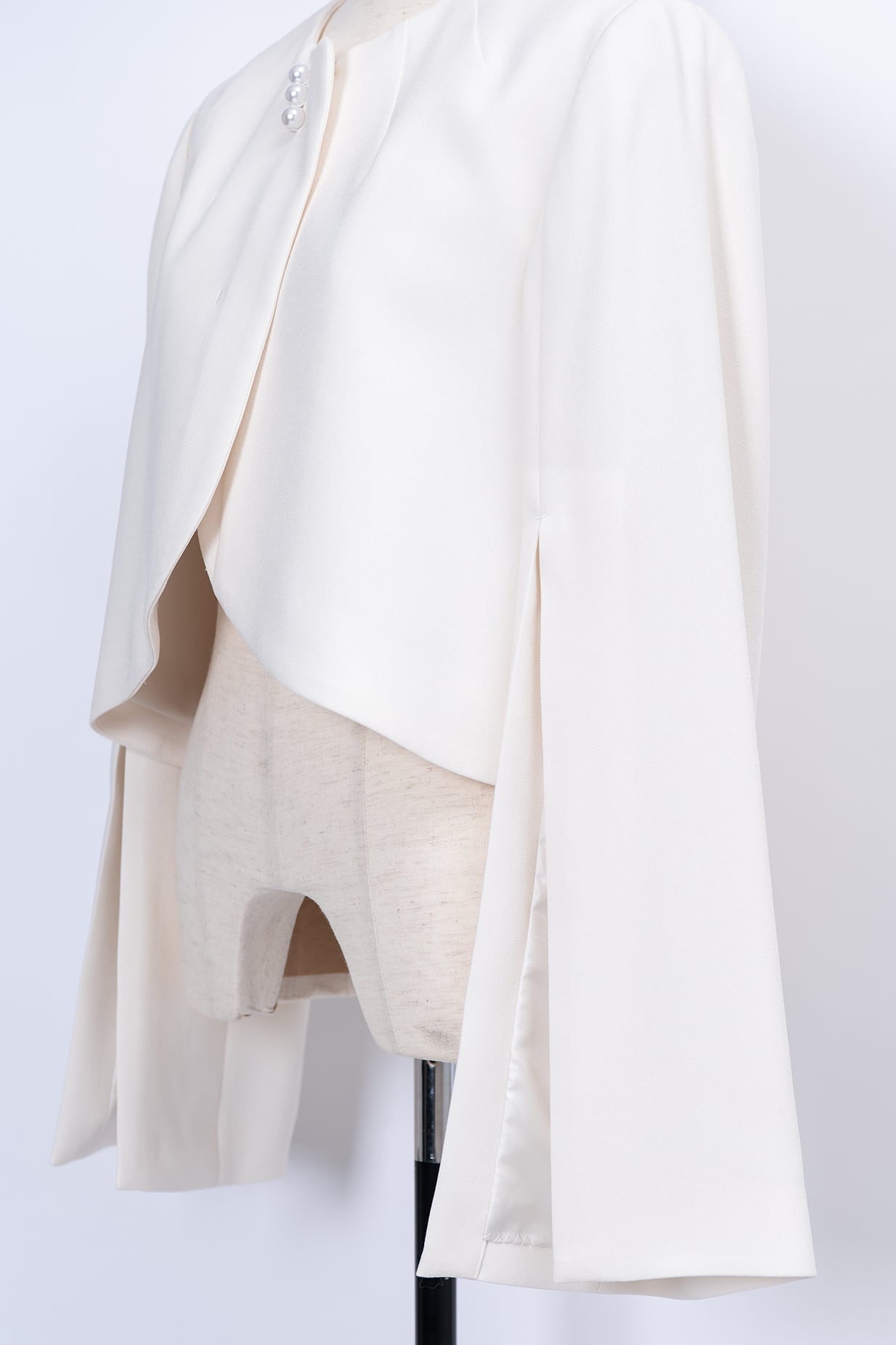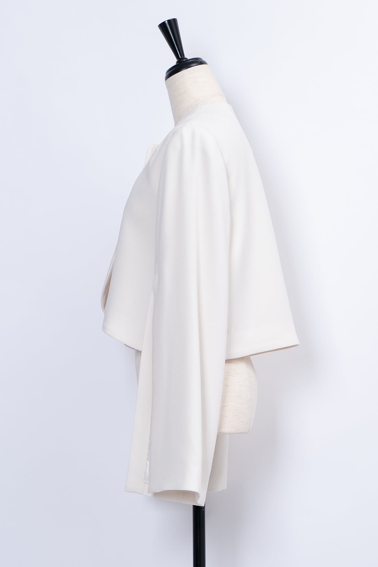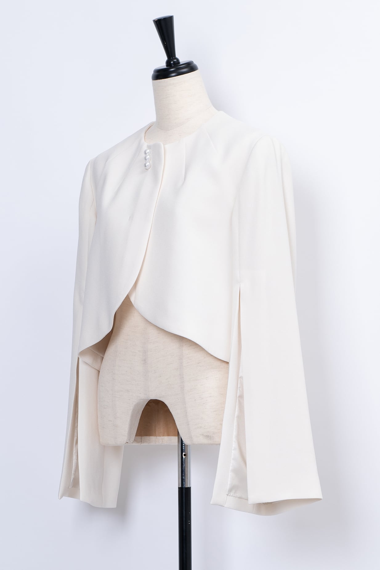 しなやかに流れるケープのようなシルエットに、袖スリットを施したショートジャケット。