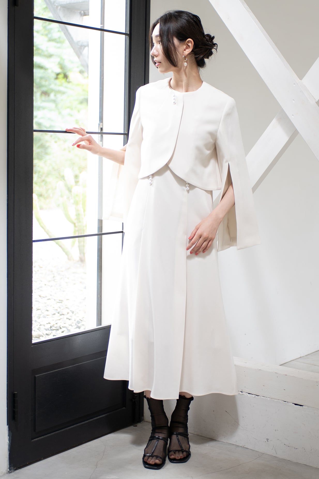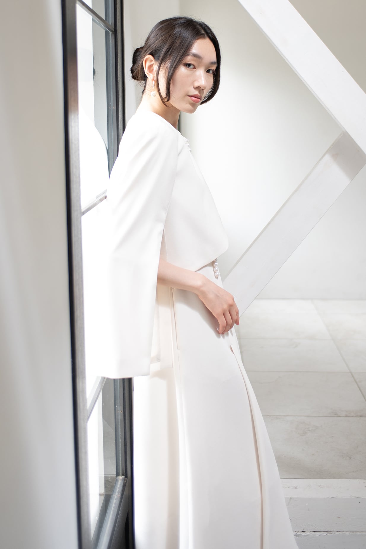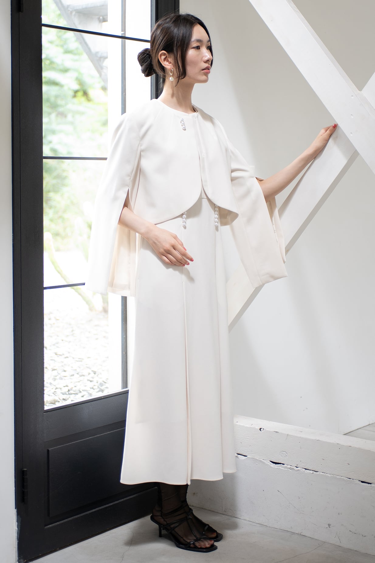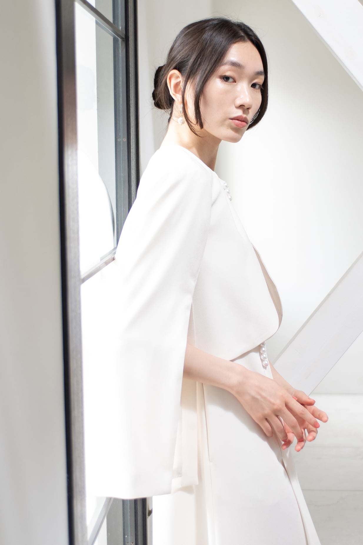 しなやかに流れるケープのようなシルエットに、袖スリットを施したショートジャケット。