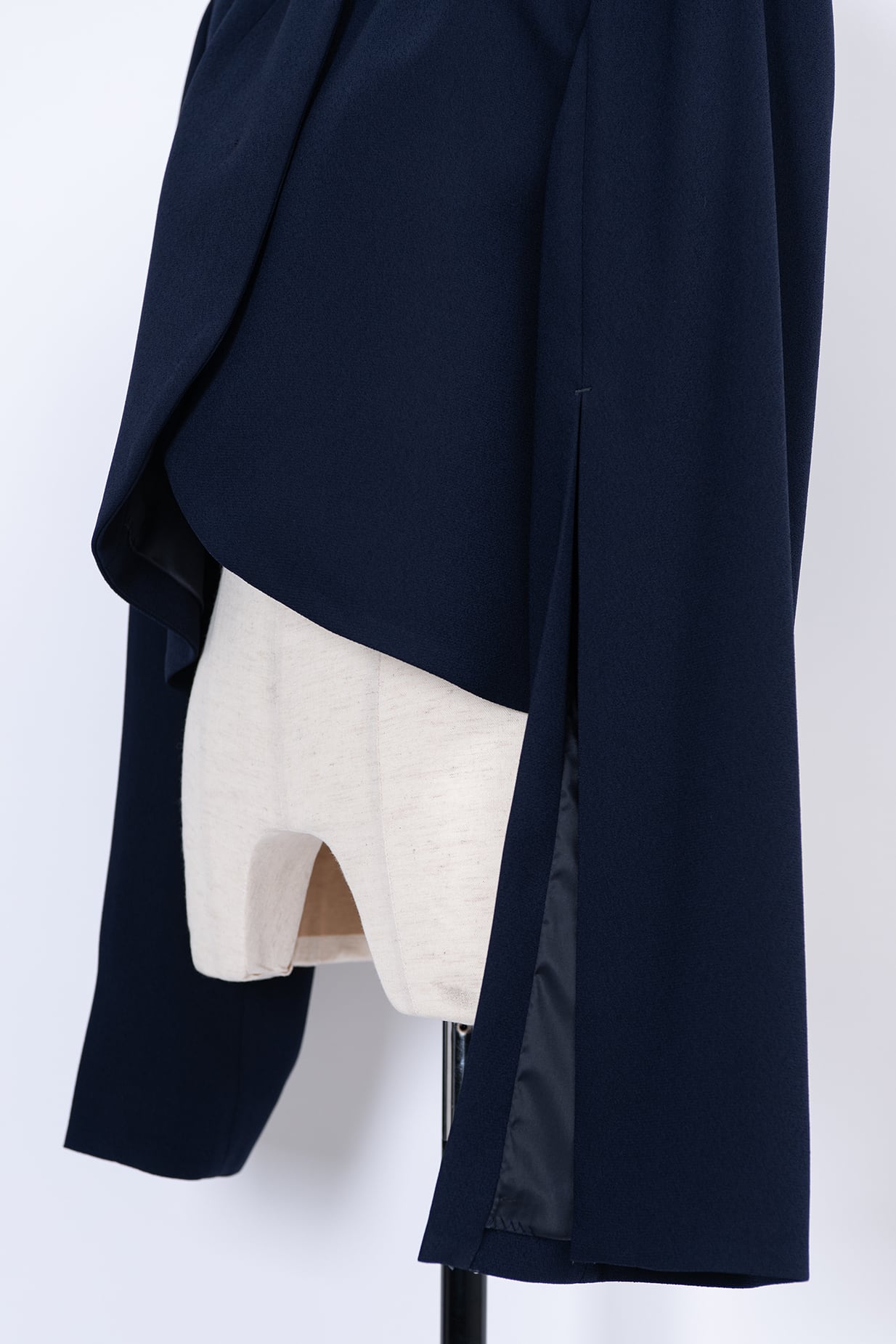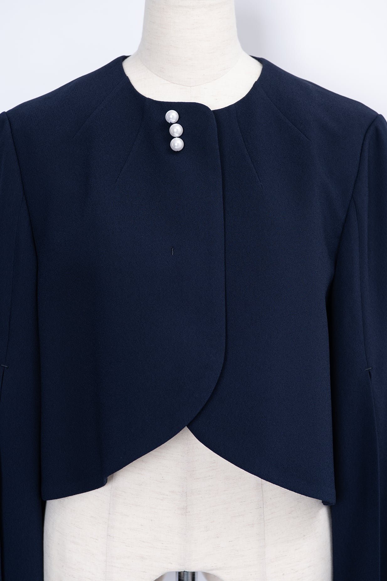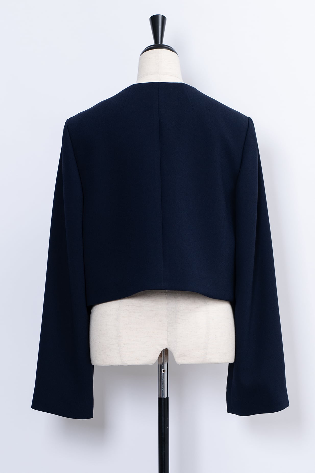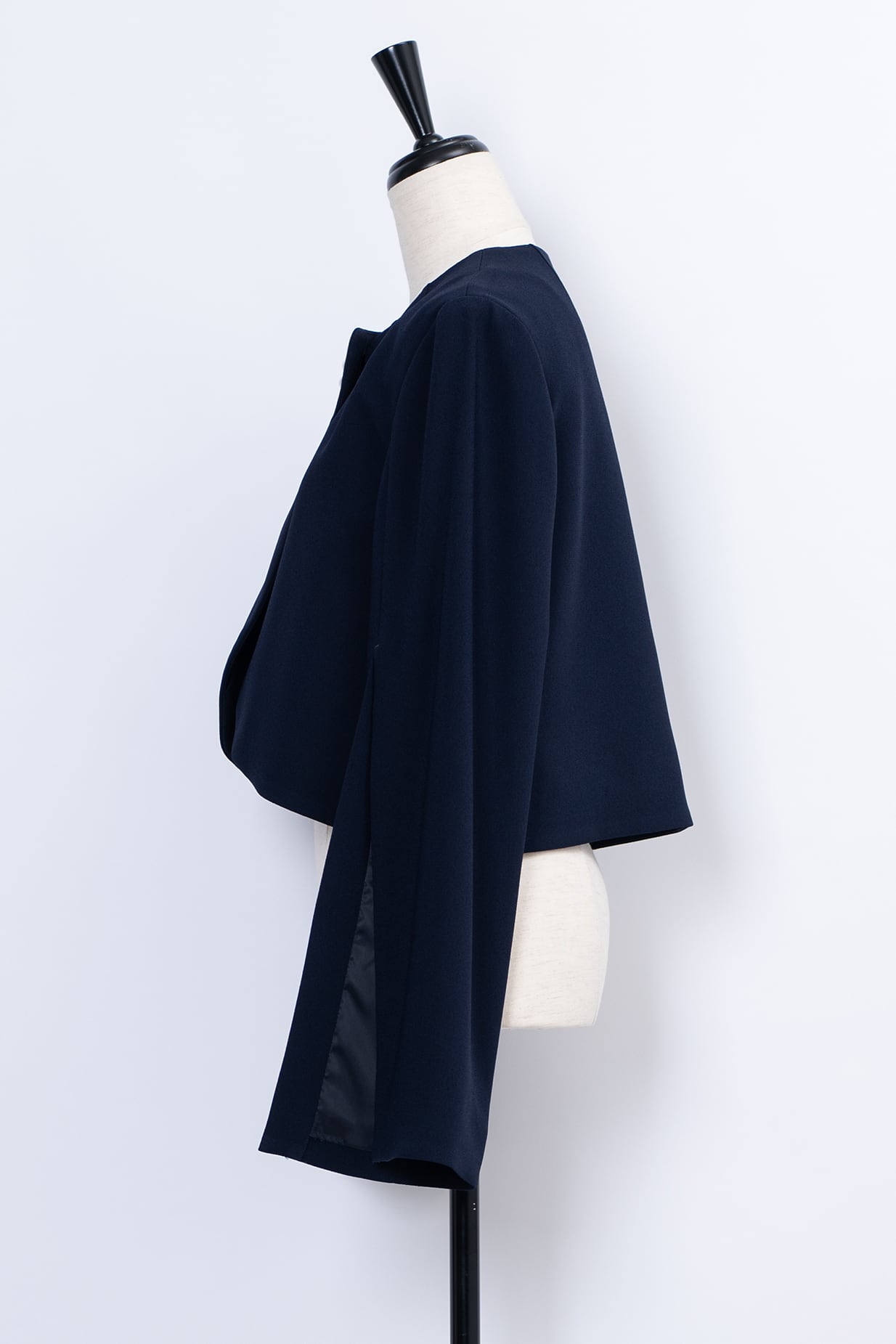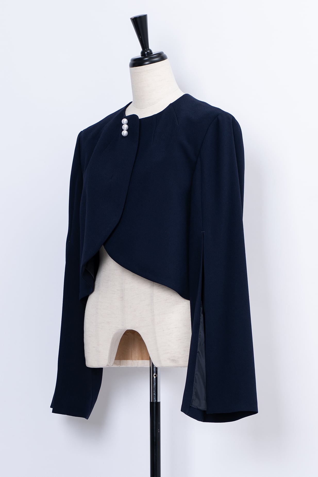 しなやかに流れるケープのようなシルエットに、袖スリットを施したショートジャケット。