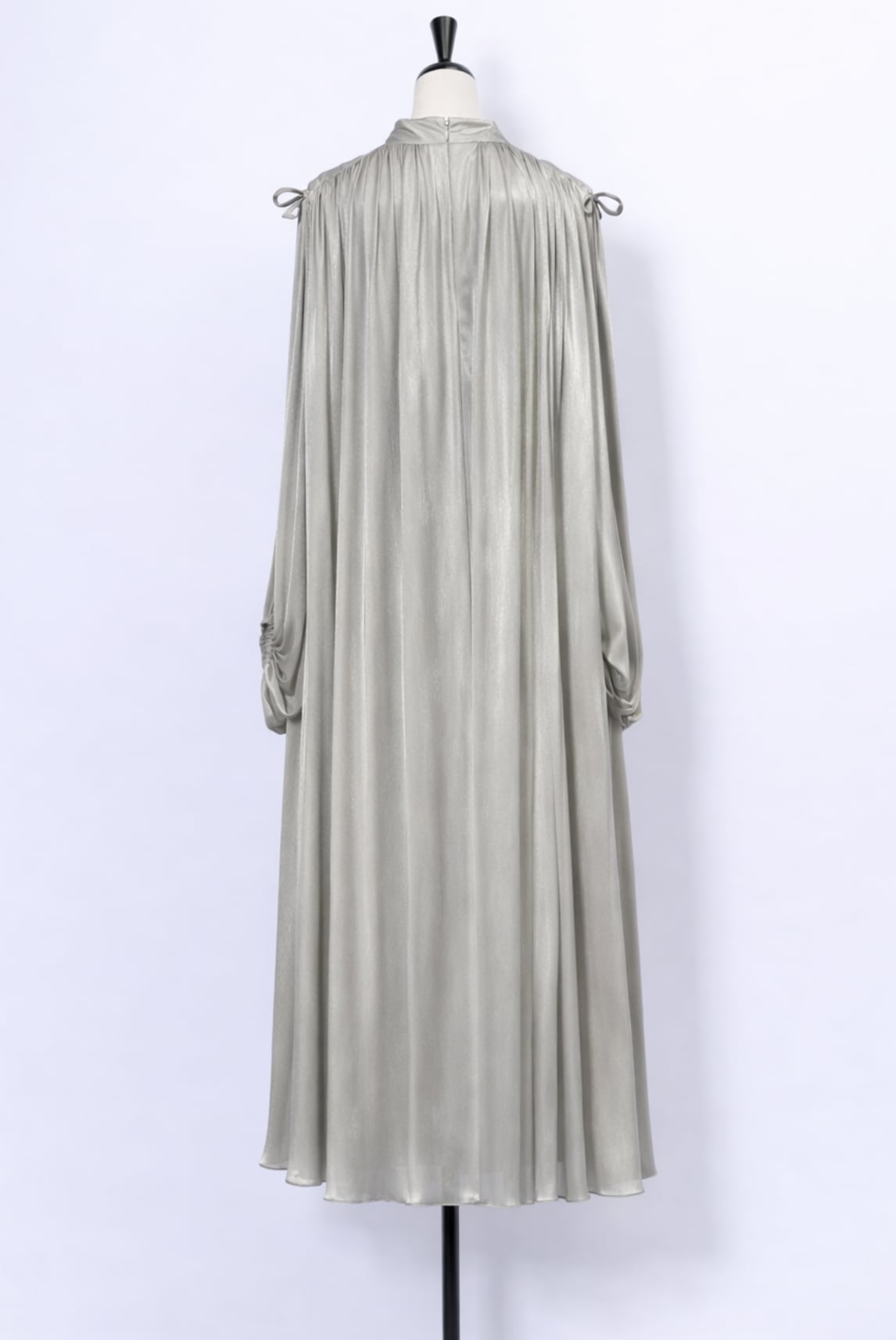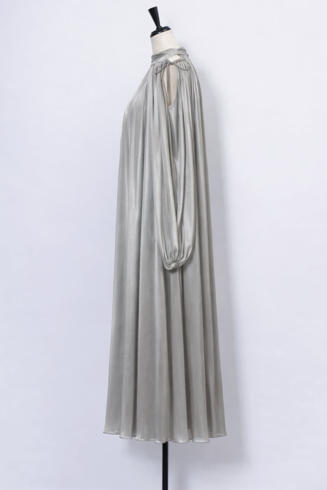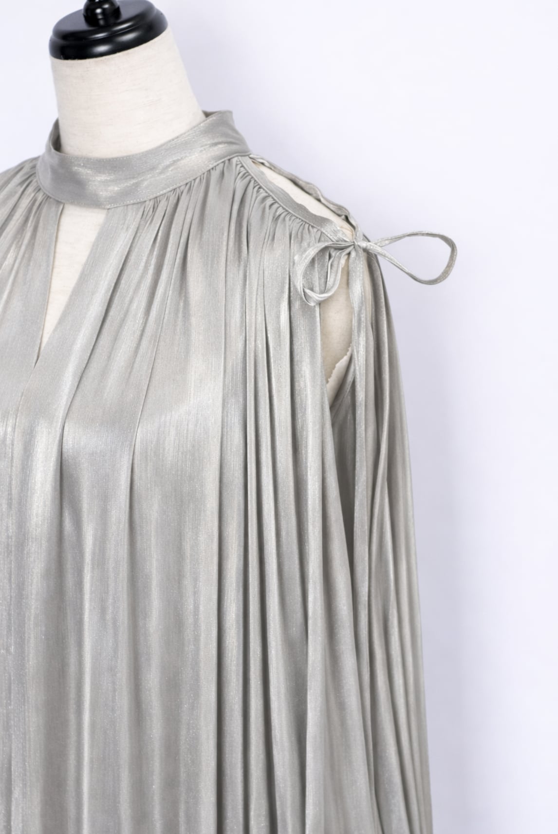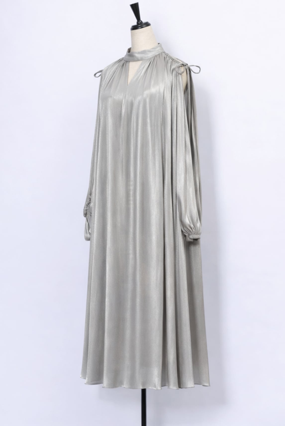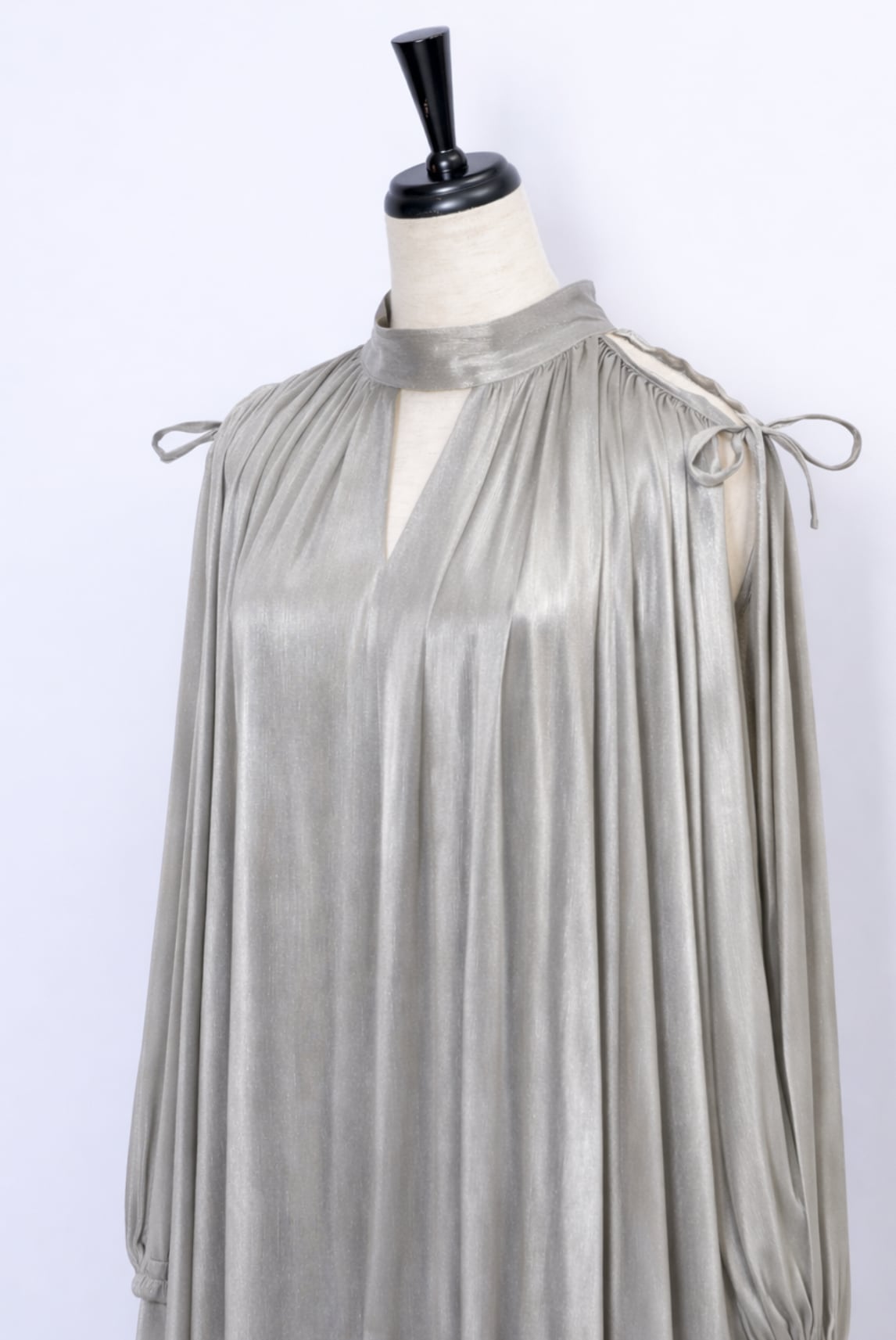 縦のラインを強調するシルエットが身体をすっきりと美しくみせ、肩先をさりげなく覗かせるショルダーディテールと華奢なリボンが女性らしいアクセントに。
