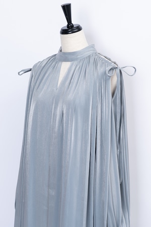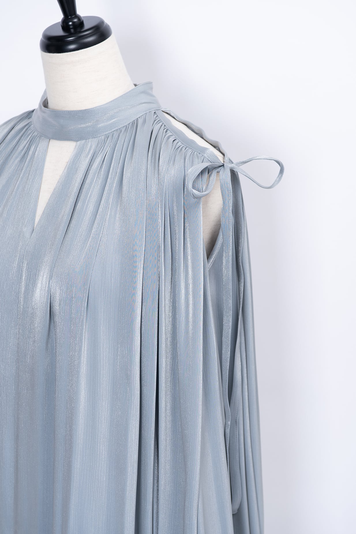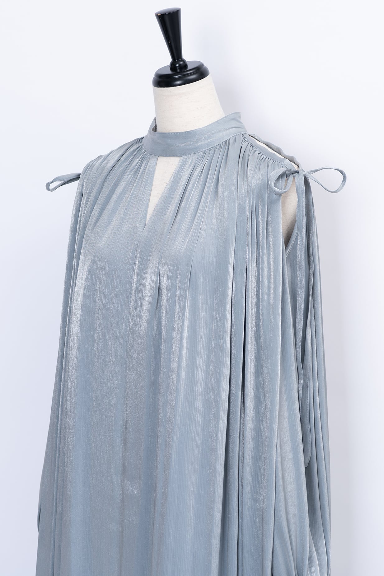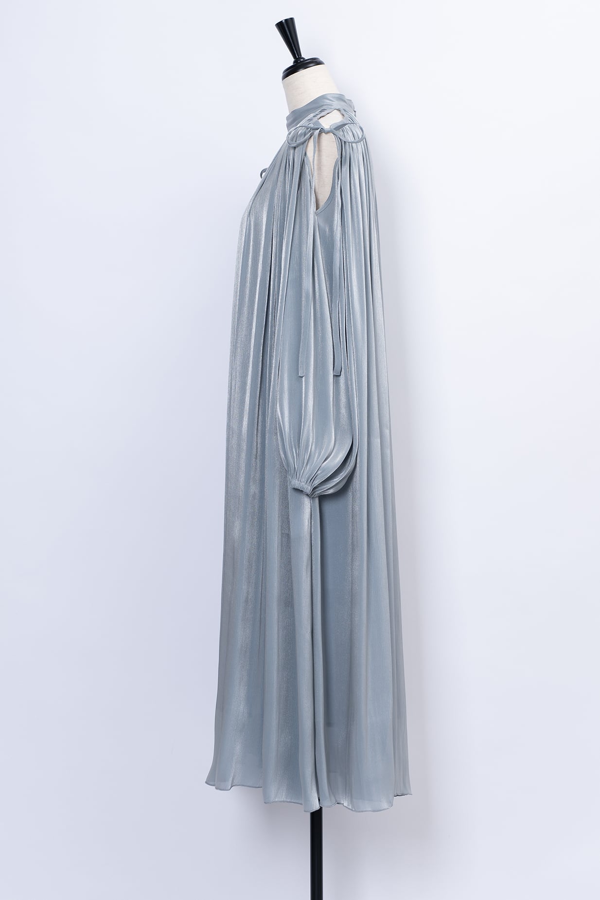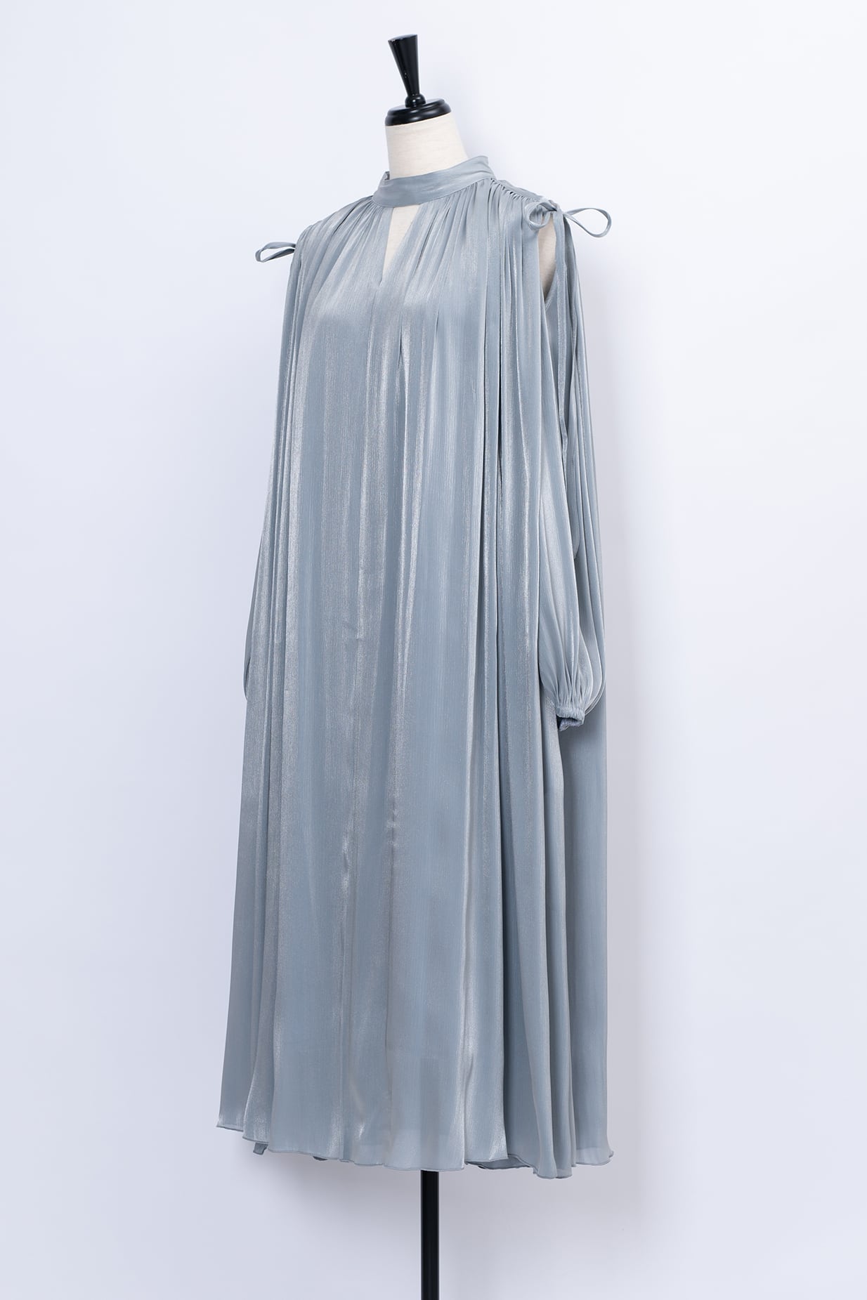 縦のラインを強調するシルエットが身体をすっきりと美しくみせ、肩先をさりげなく覗かせるショルダーディテールと華奢なリボンが女性らしいアクセントに。