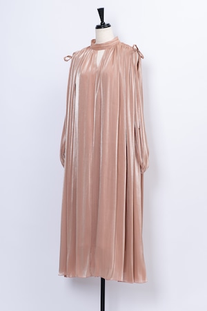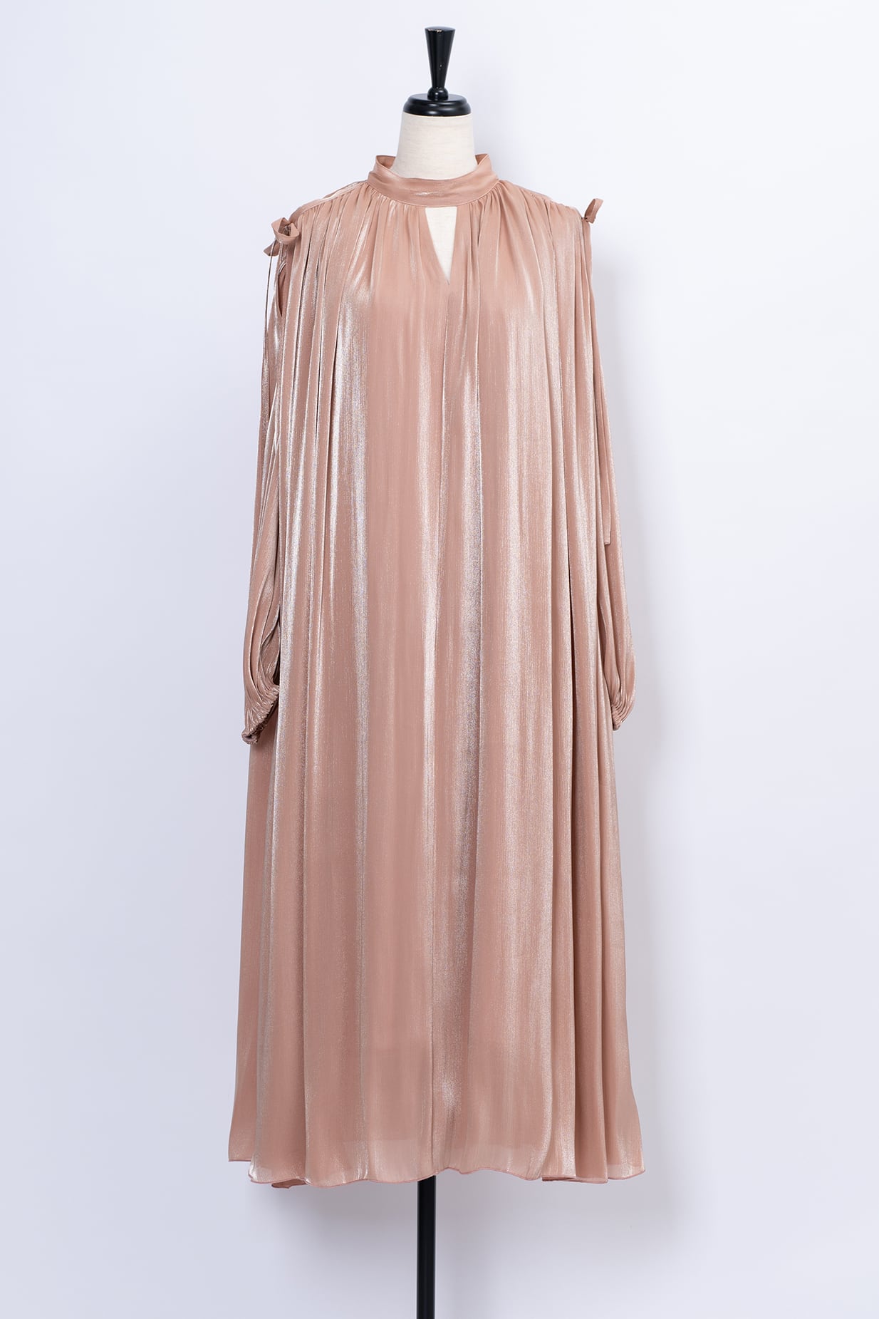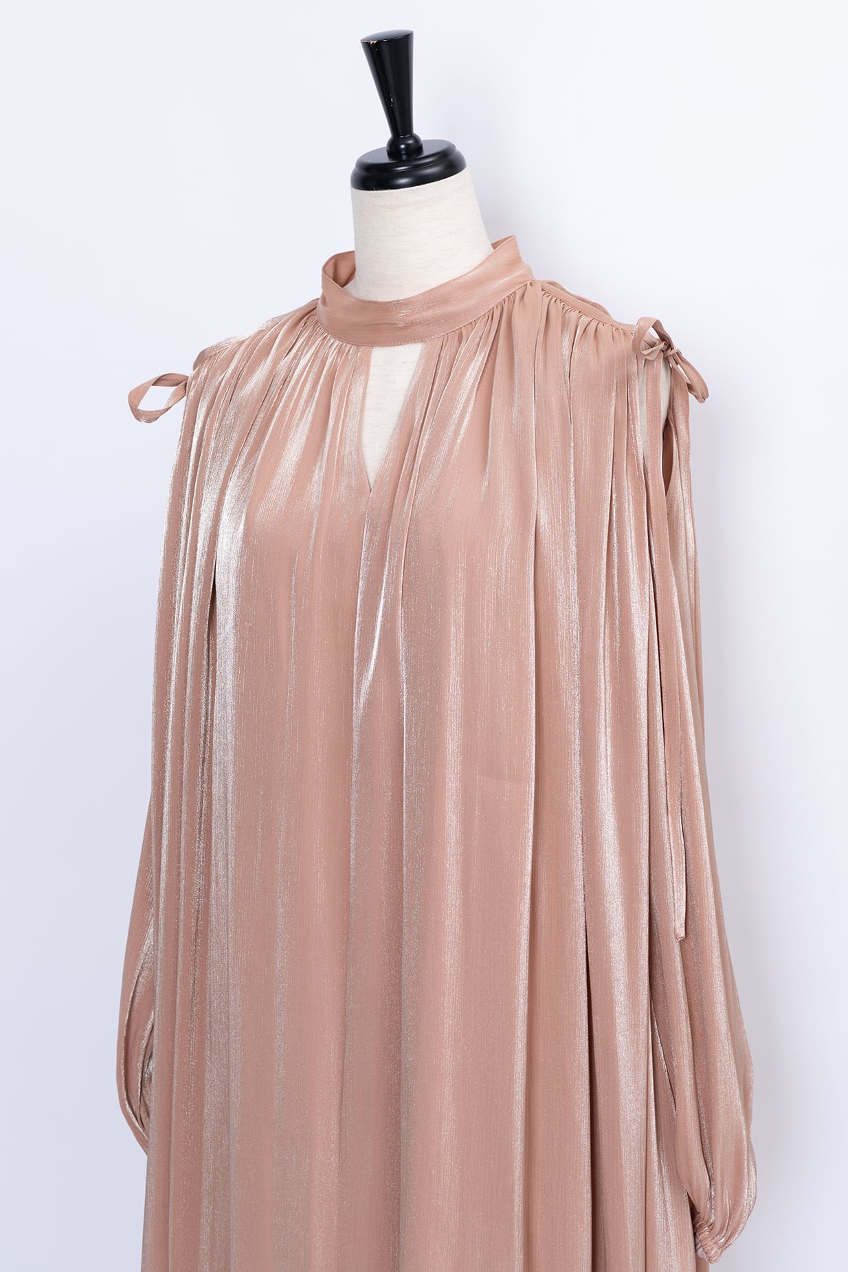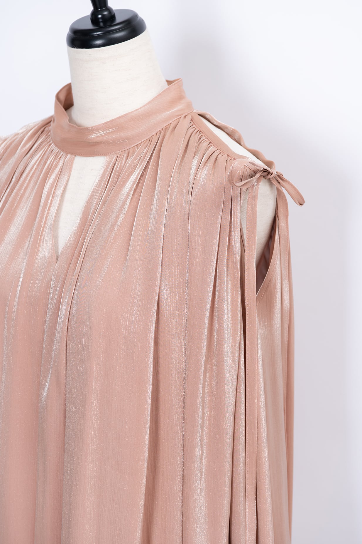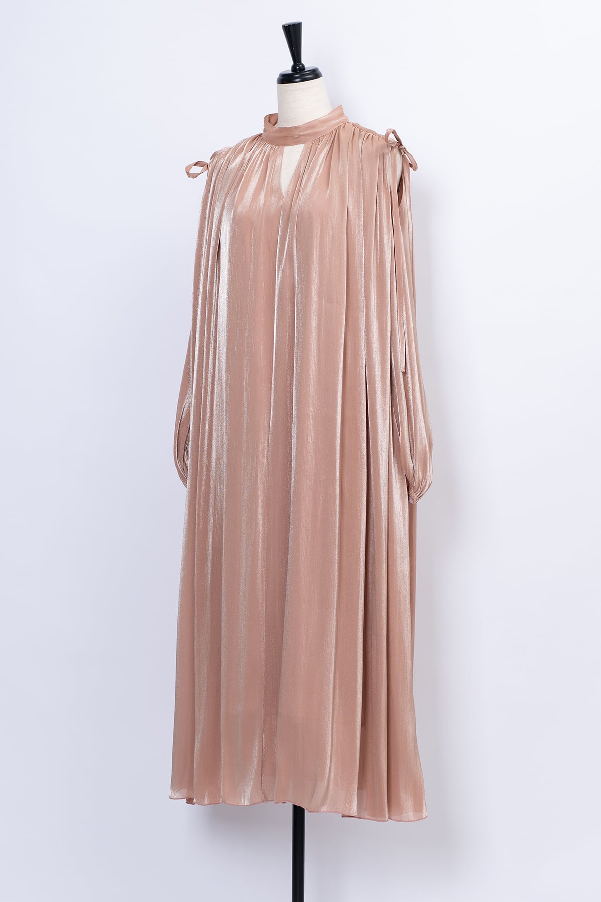 縦のラインを強調するシルエットが身体をすっきりと美しくみせ、肩先をさりげなく覗かせるショルダーディテールと華奢なリボンが女性らしいアクセントに。