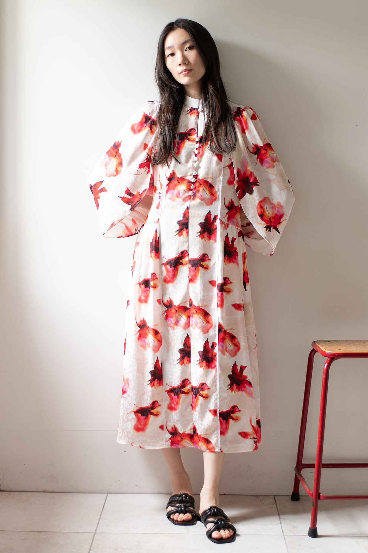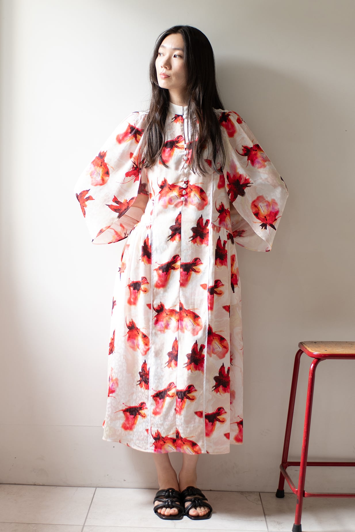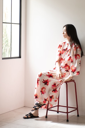 デザイナー自らが水彩で描いたハイビスカスに“すみ流し”の意匠を重ね合わせたArobeオリジナルプリント。