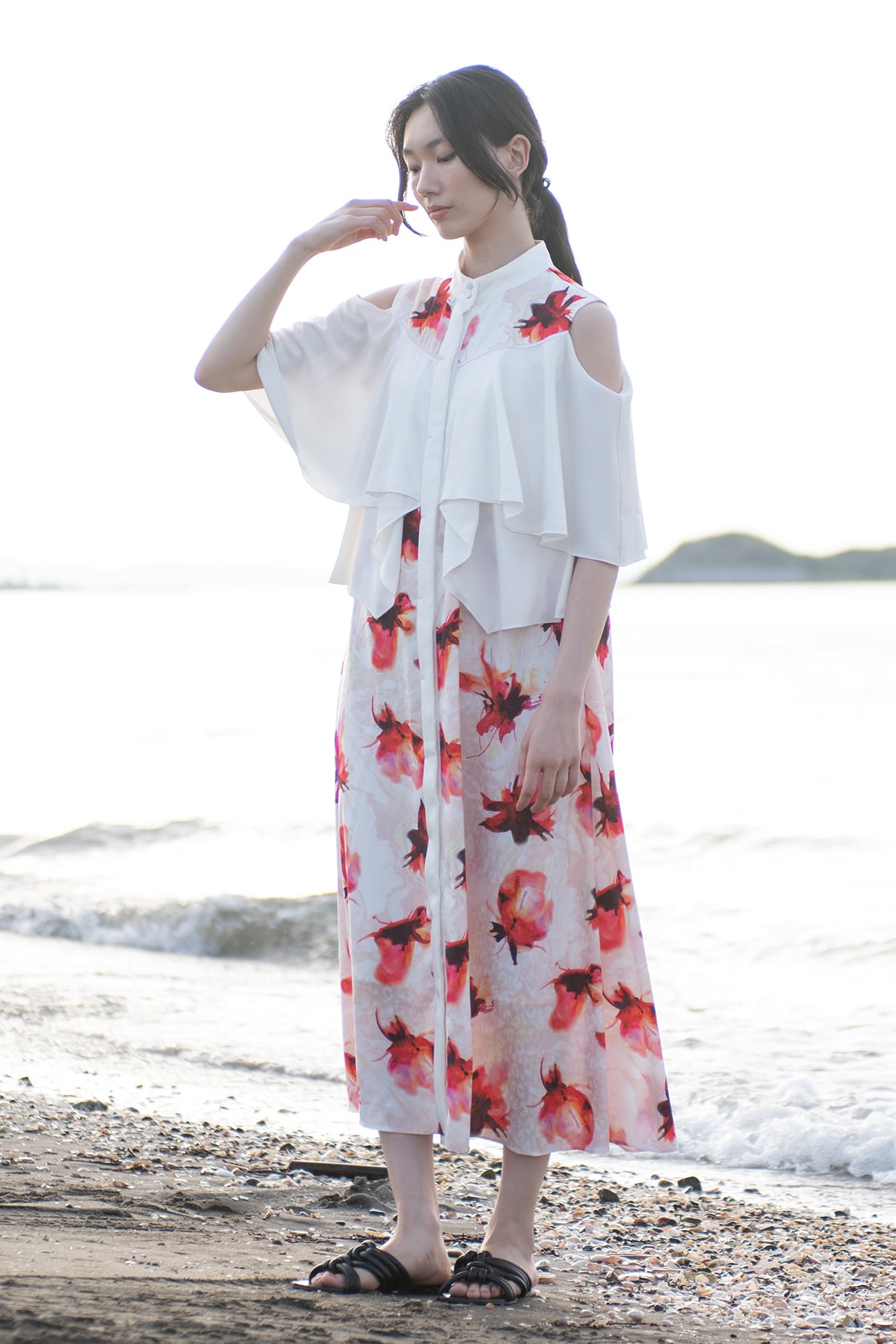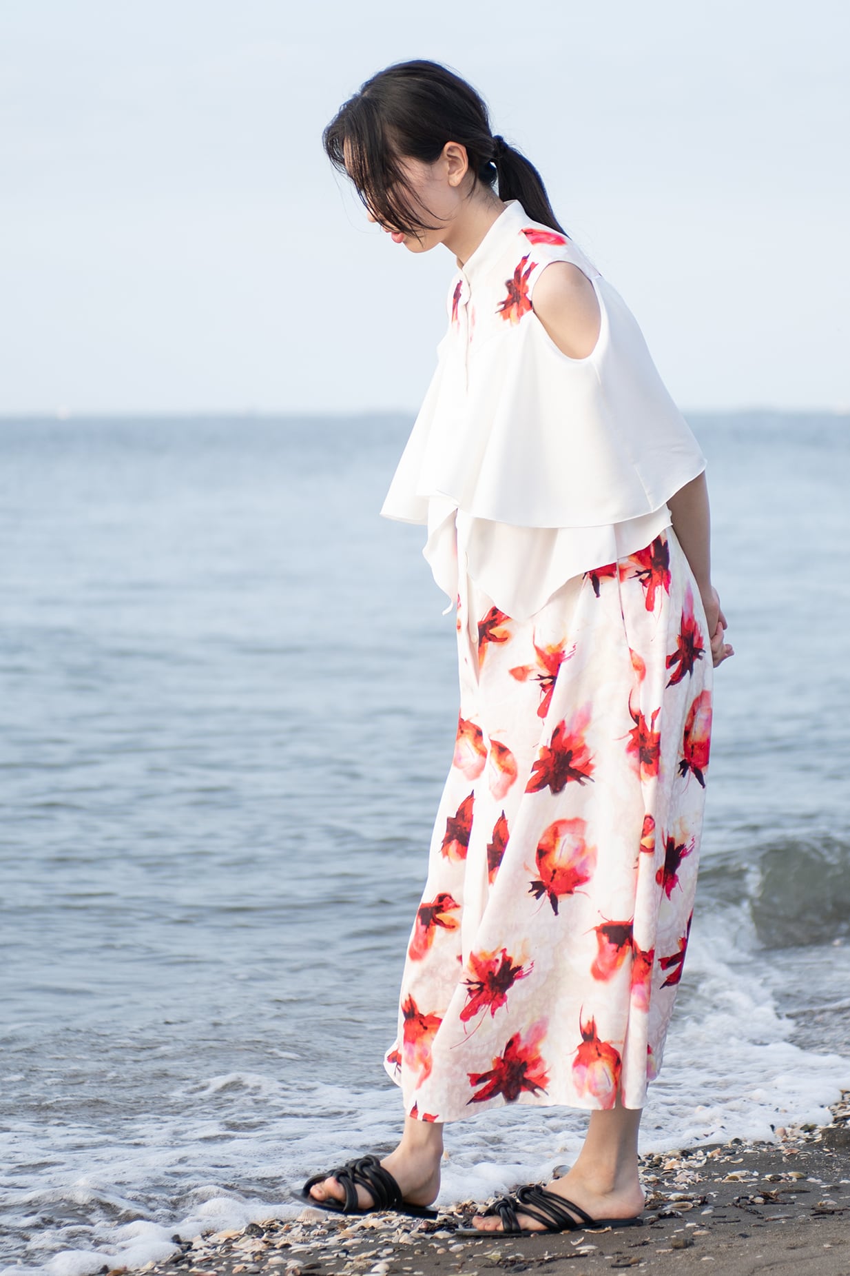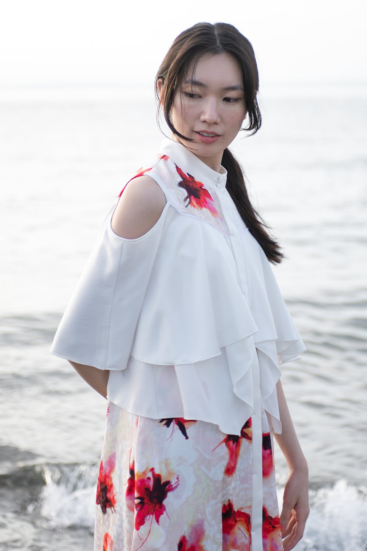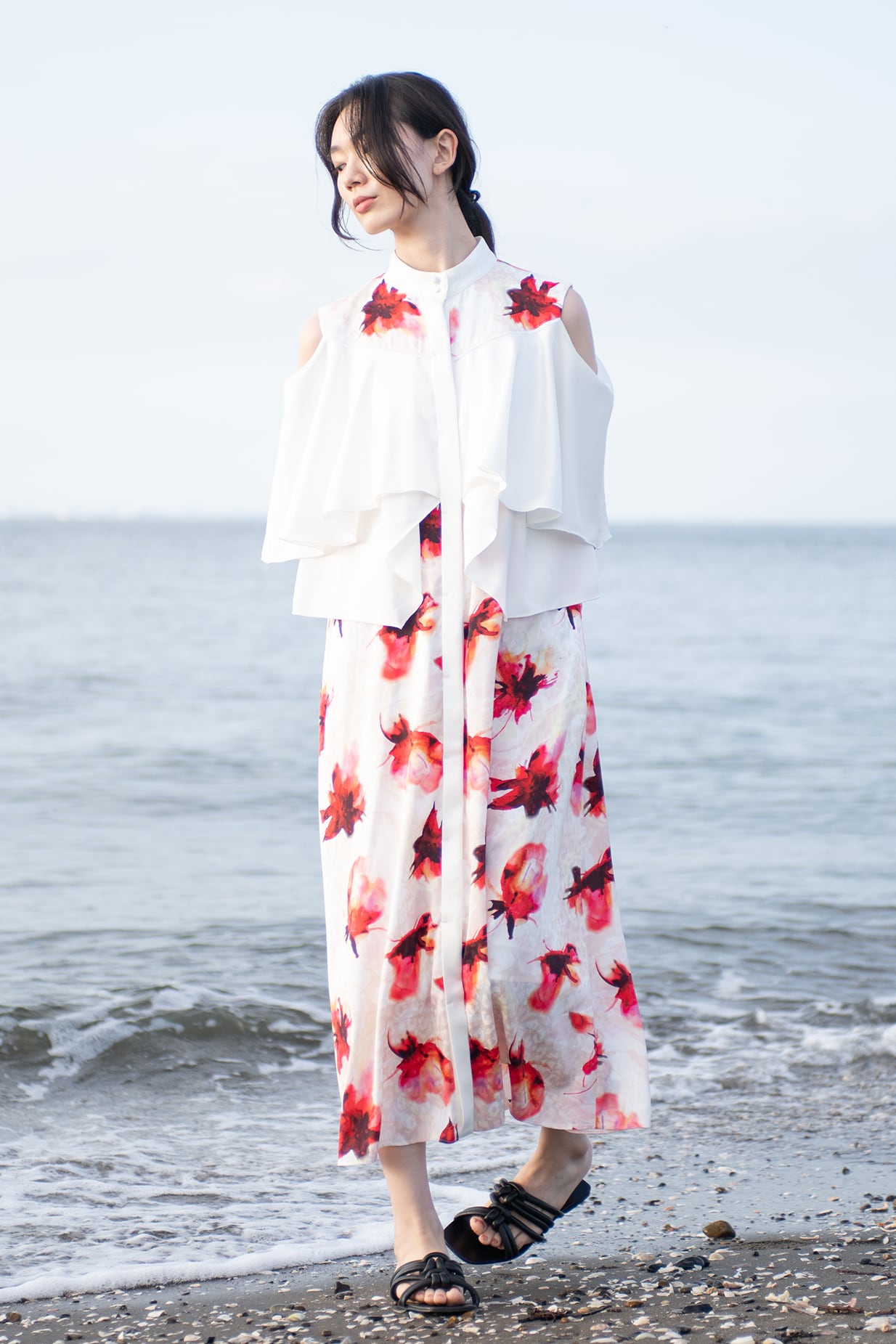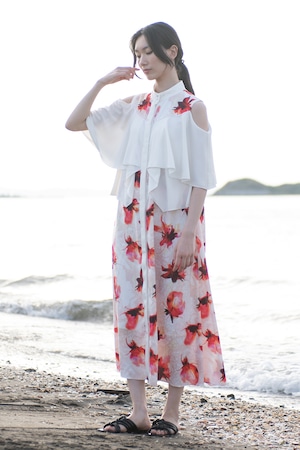 肩を覗かせた抜け感のあるデザインは女性らしさを一層引き立て、動くたびに見ごろのフリルが揺れ、リゾートの光を纏うような佇まいに。