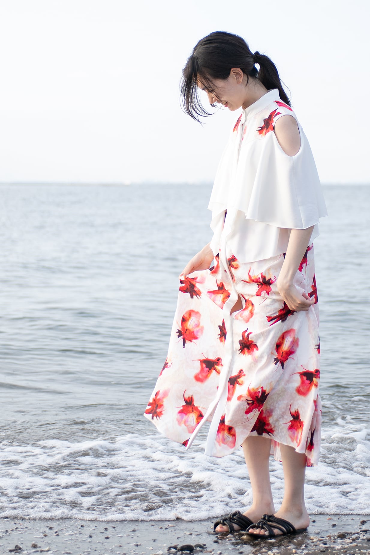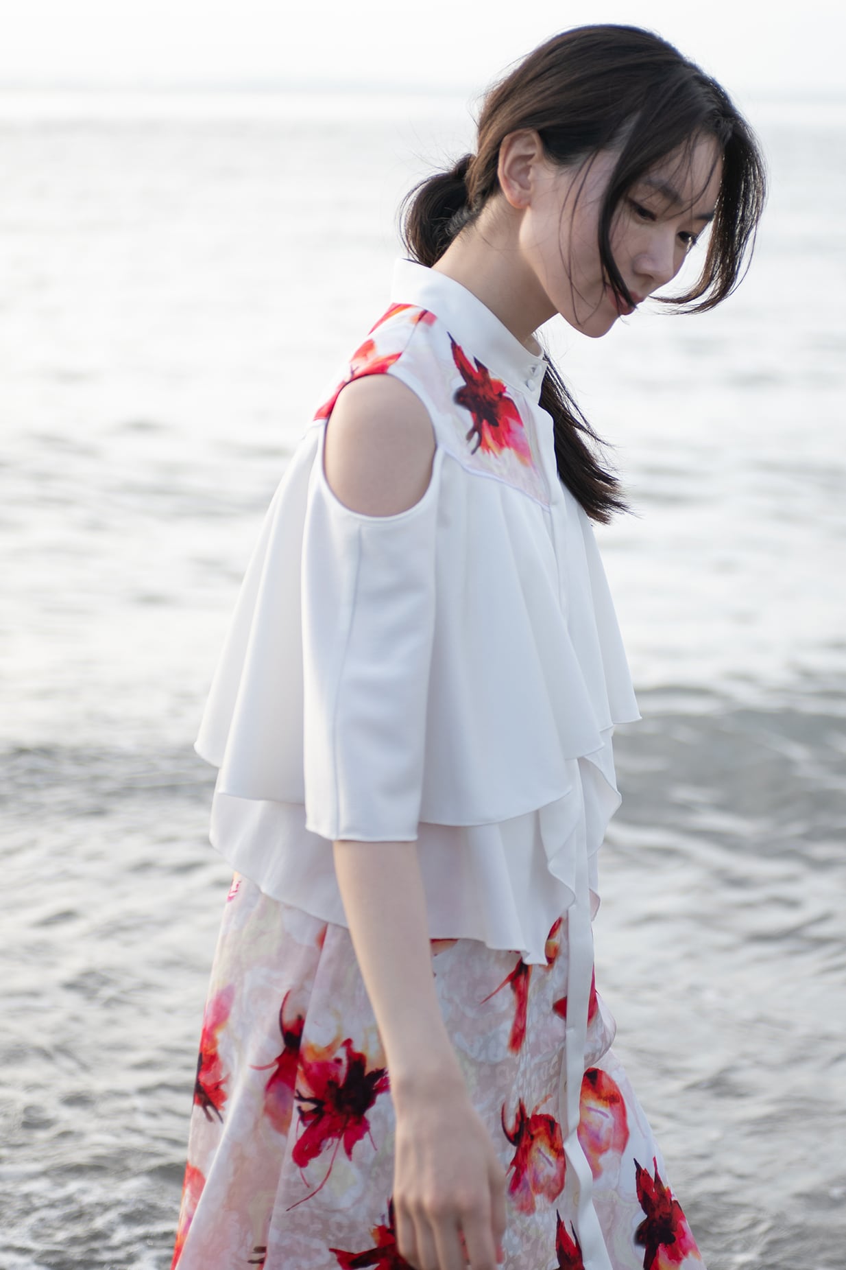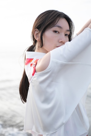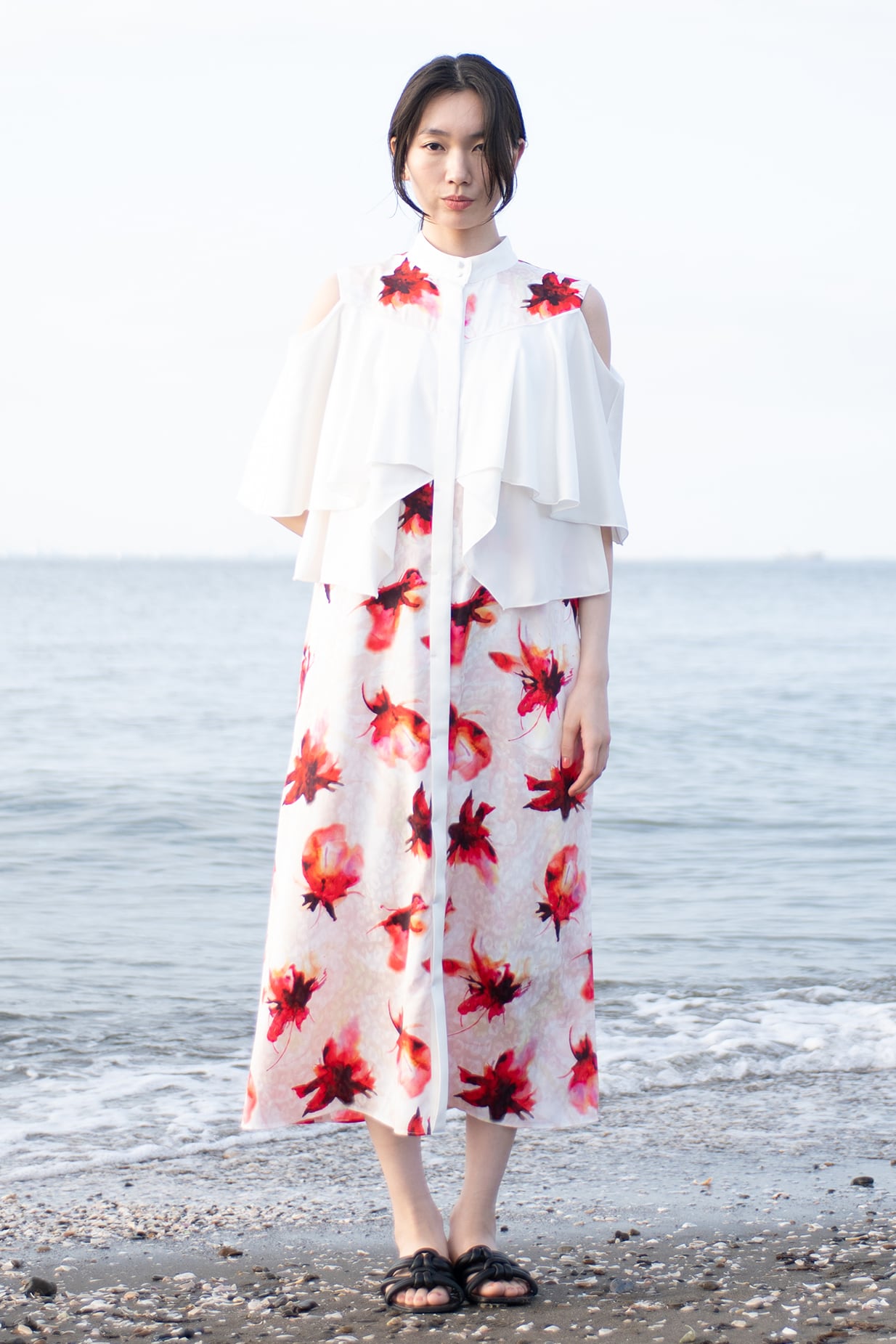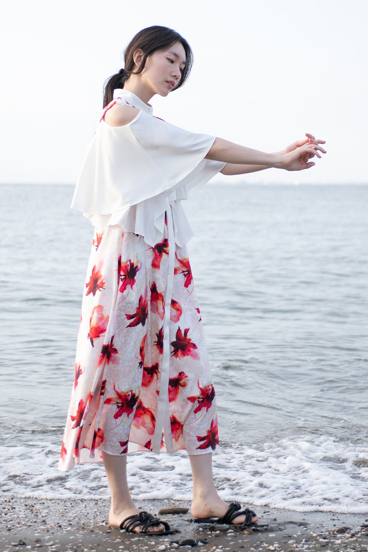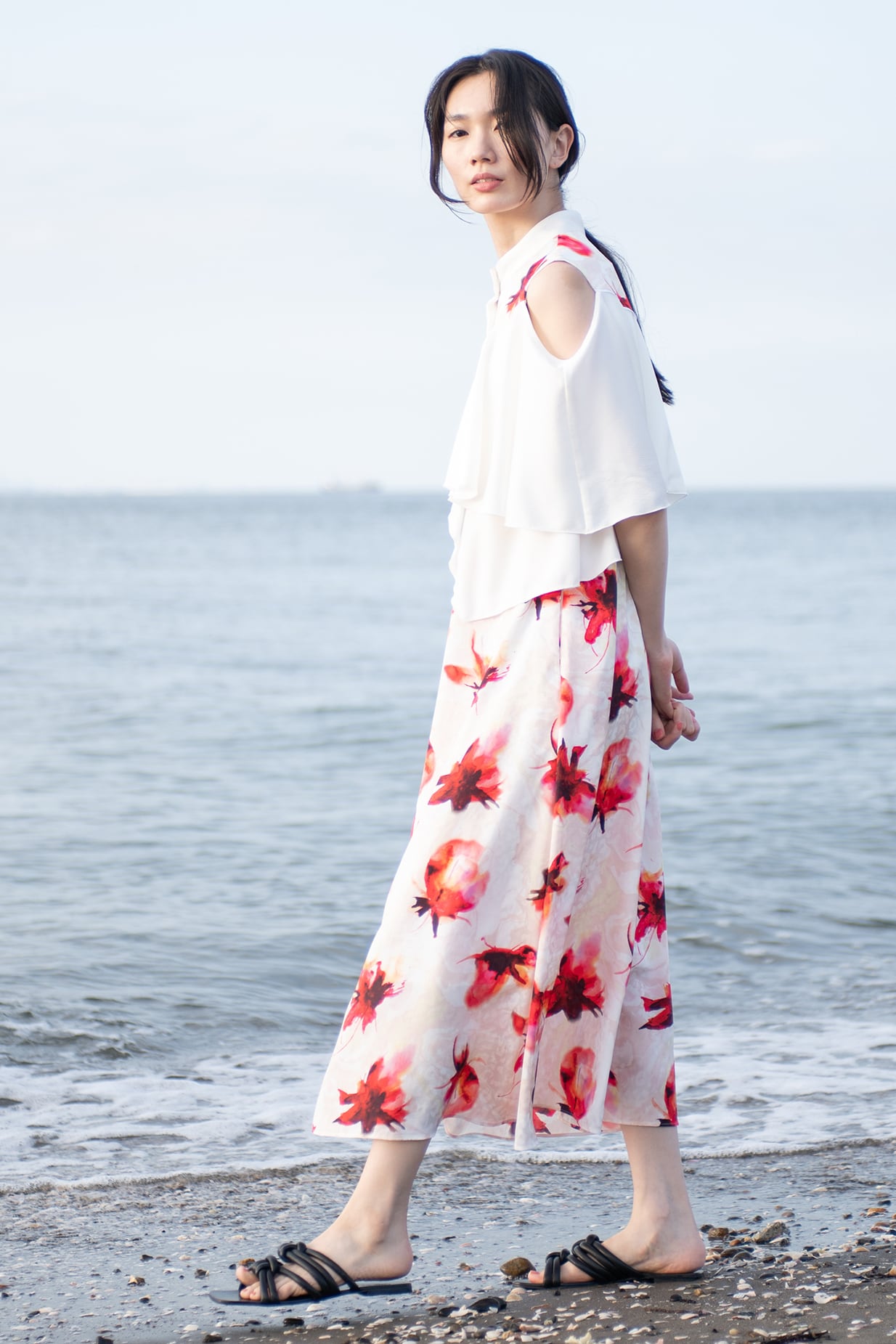 肩を覗かせた抜け感のあるデザインは女性らしさを一層引き立て、動くたびに見ごろのフリルが揺れ、リゾートの光を纏うような佇まいに。