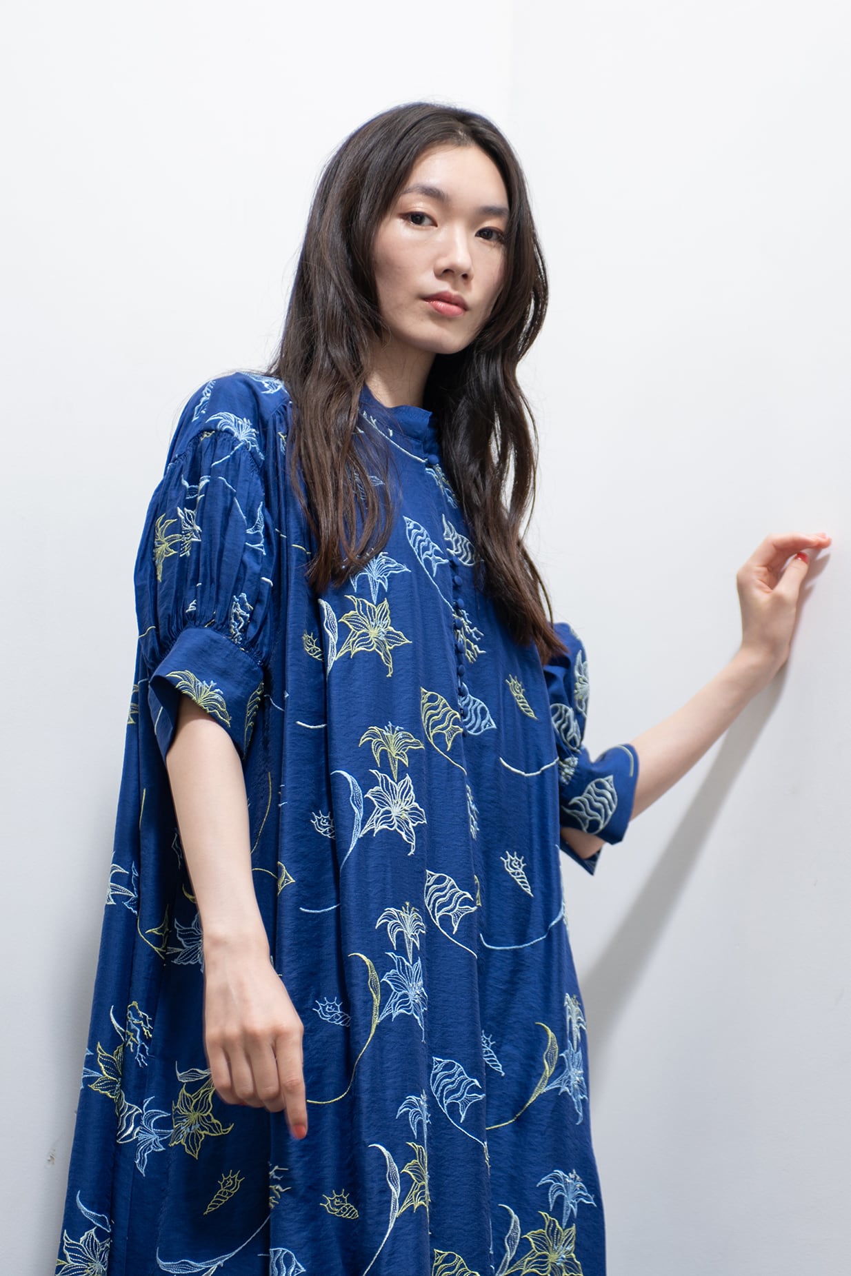 ボディ全体を包み込むリラックス感のあるシルエットでありながらも、贅沢に施された刺繍が華やかに彩る優美な一着です。