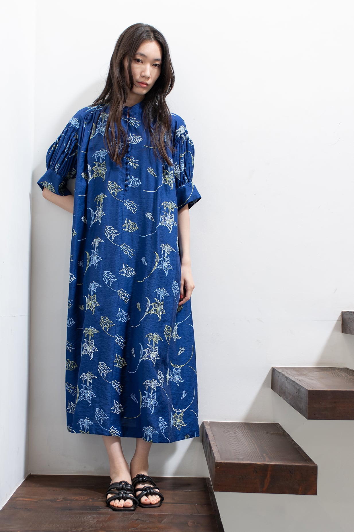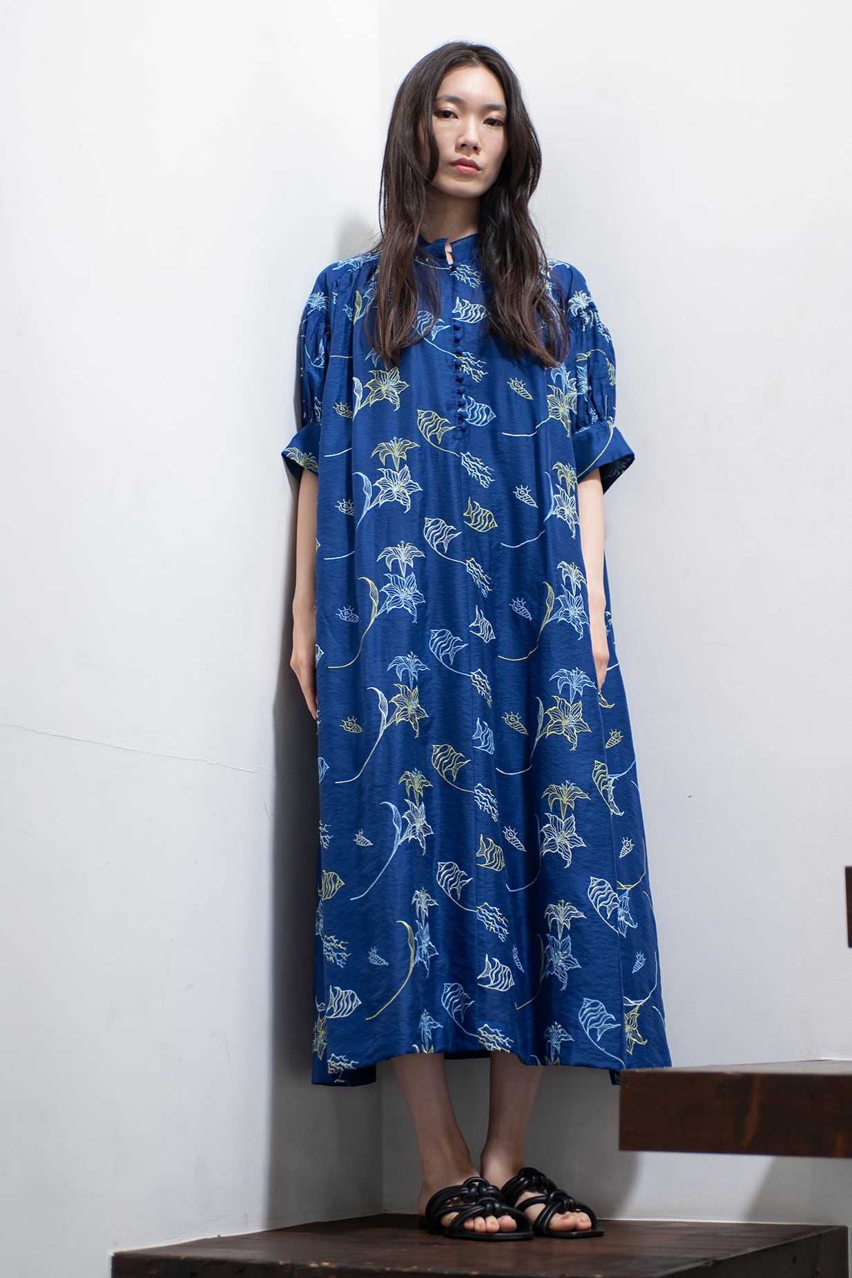 Sea&Lily Embroidery Gathered dress ROYAL BLUE
