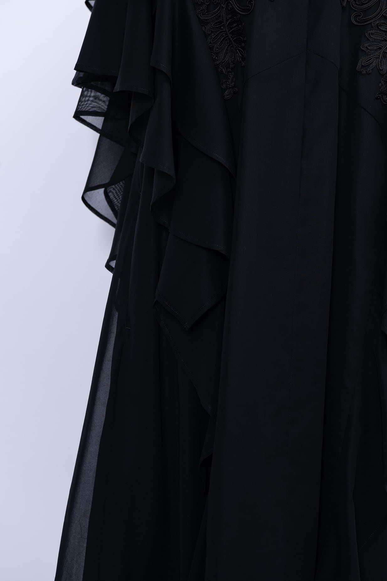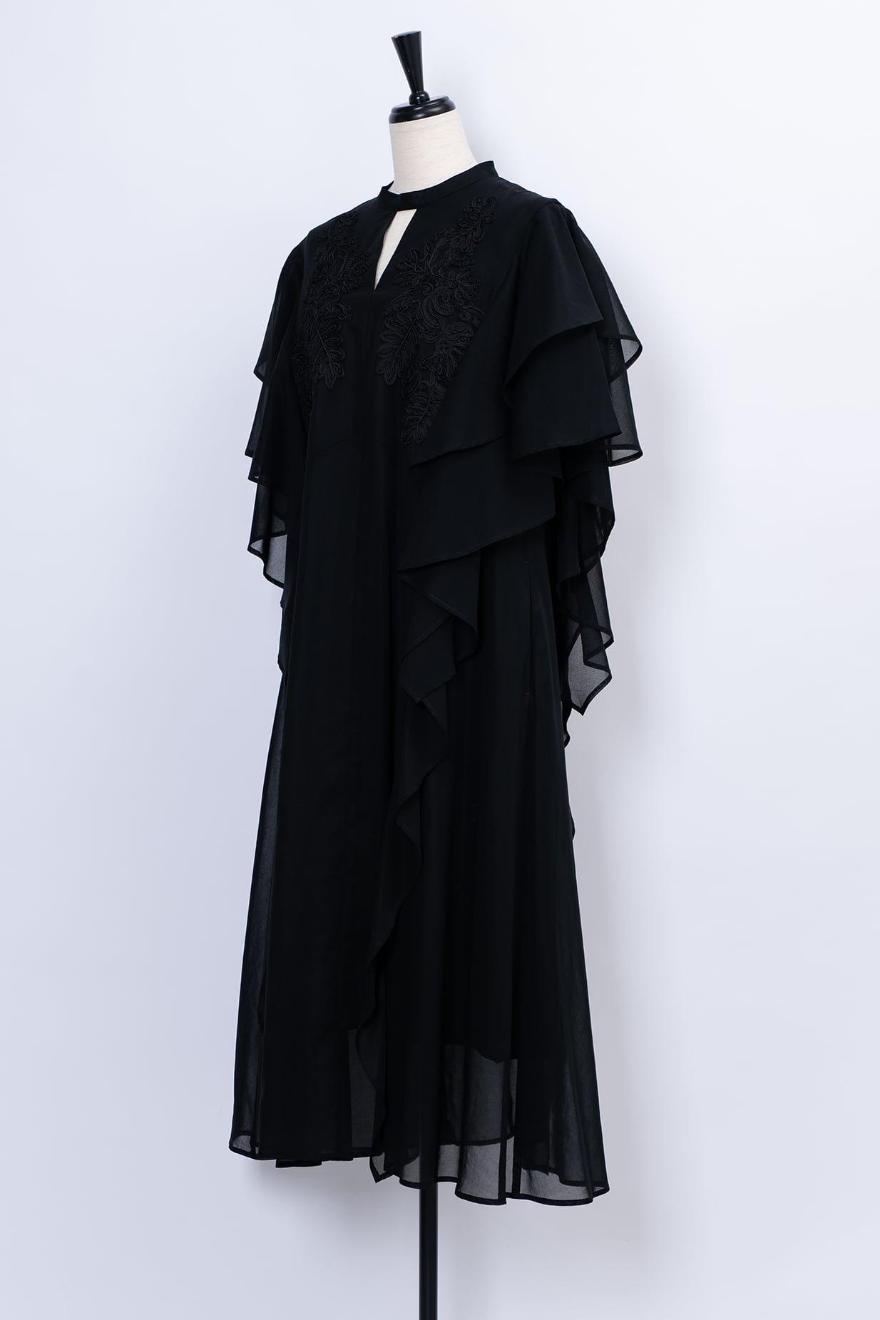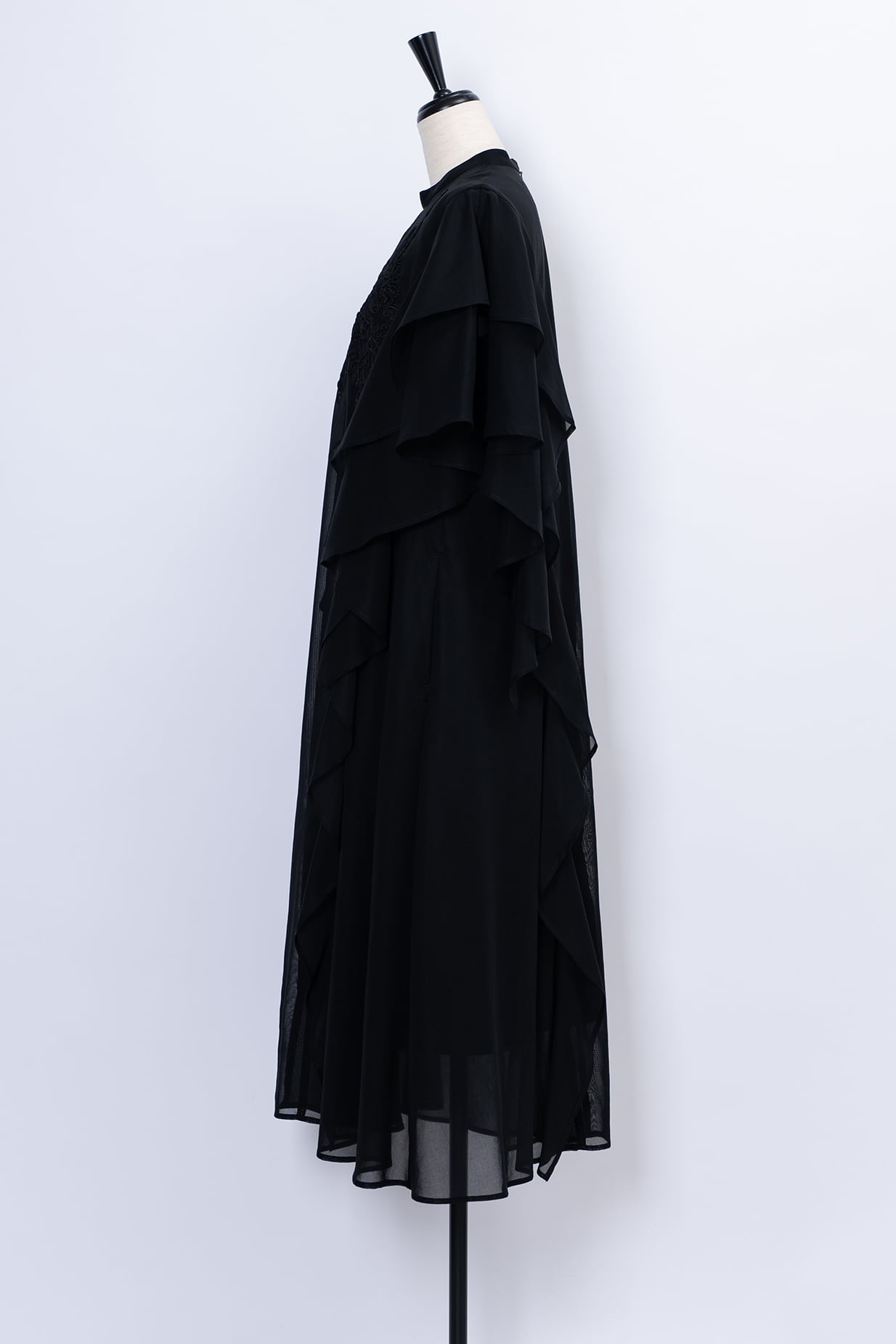 肩から流れるように重なるフリルは動くたびに優雅な揺れを生み出し、まるで花びらのような柔らかな表情に。