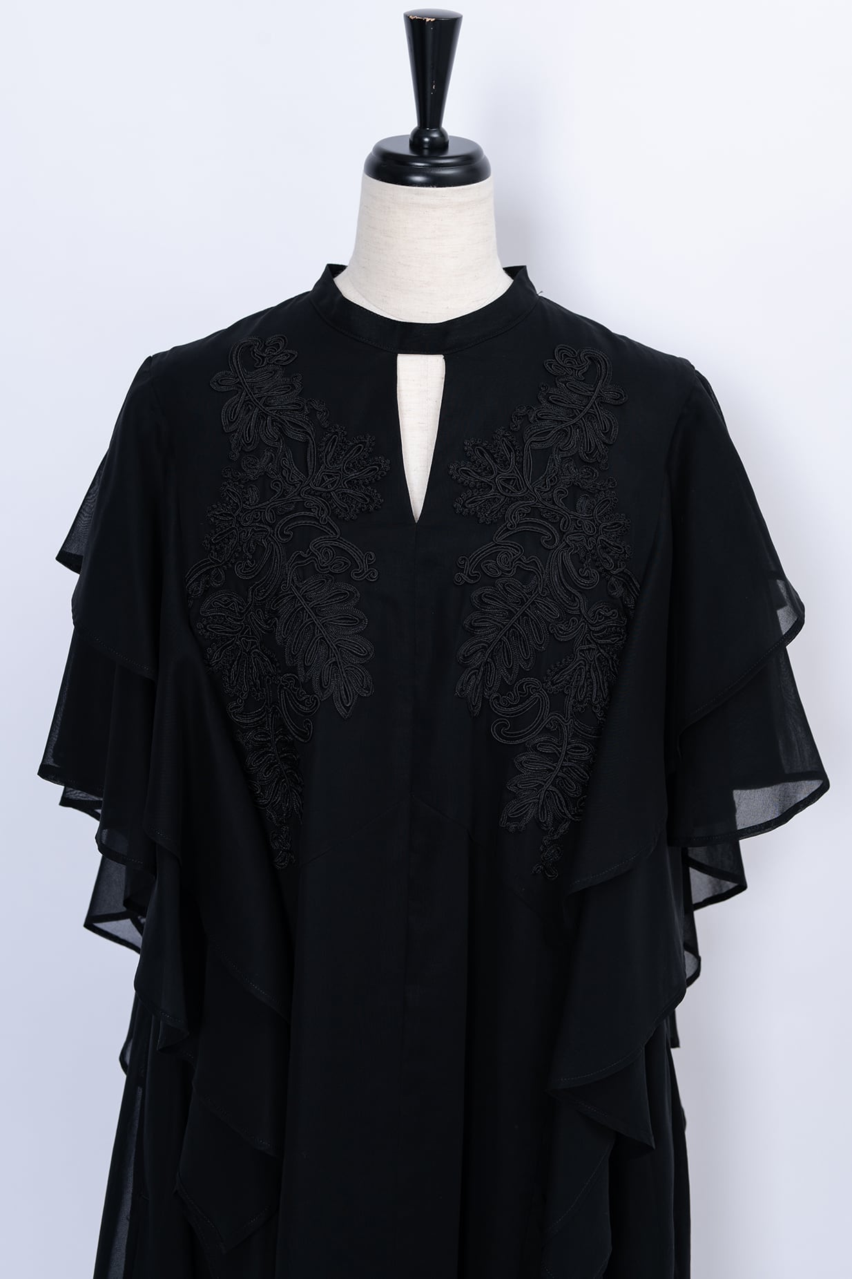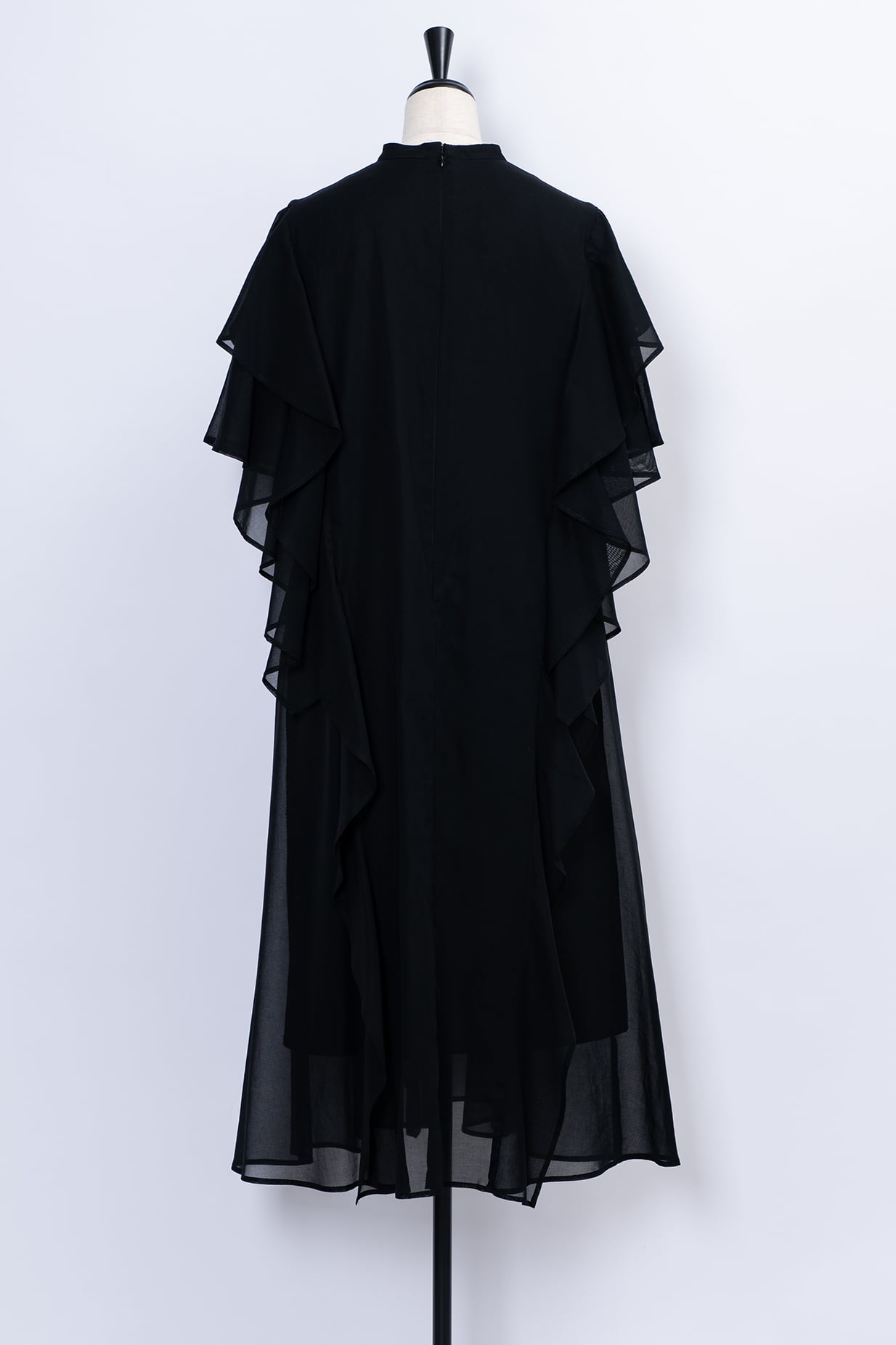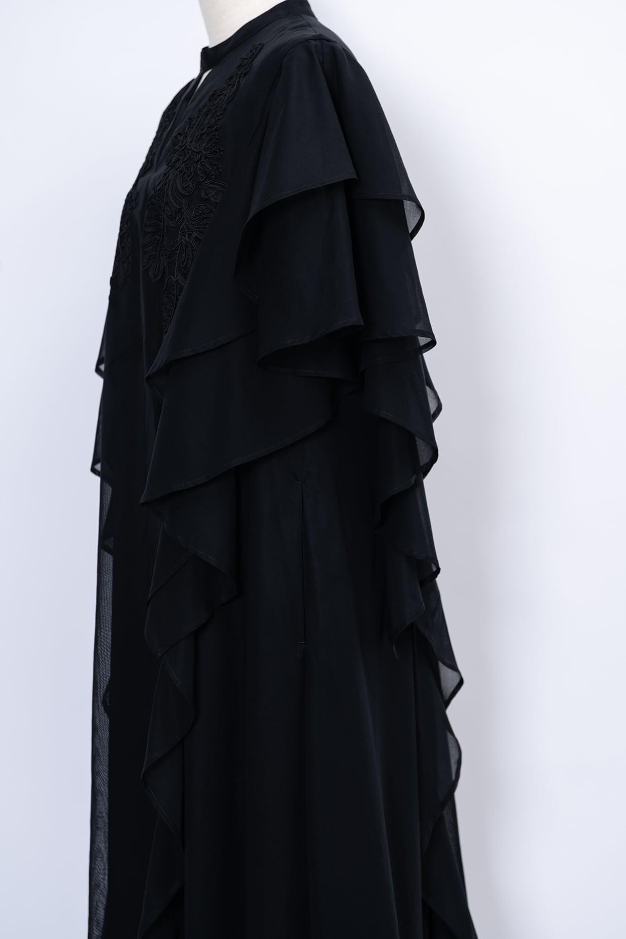 肩から流れるように重なるフリルは動くたびに優雅な揺れを生み出し、まるで花びらのような柔らかな表情に。