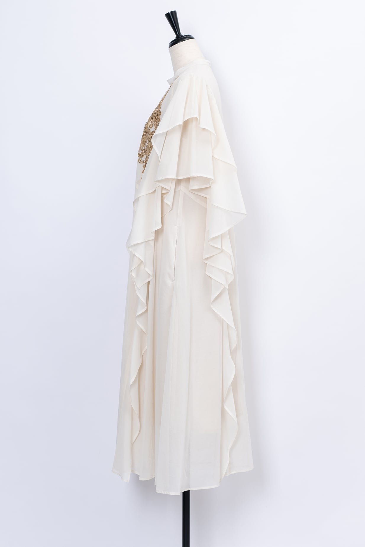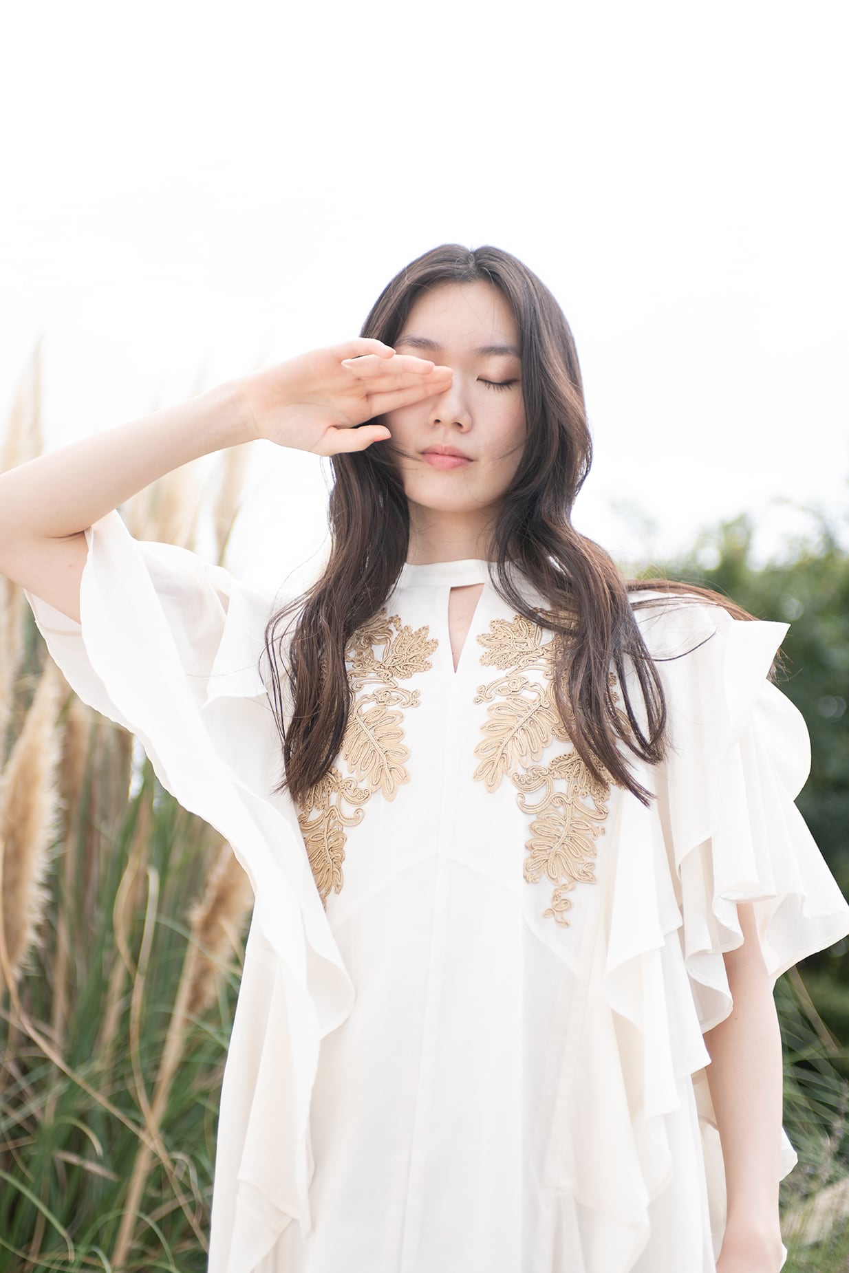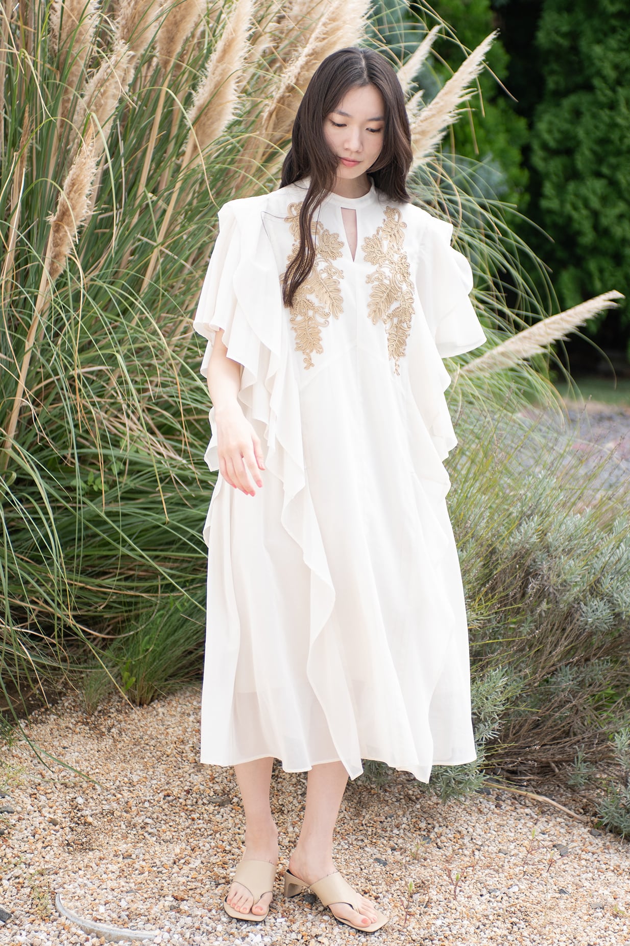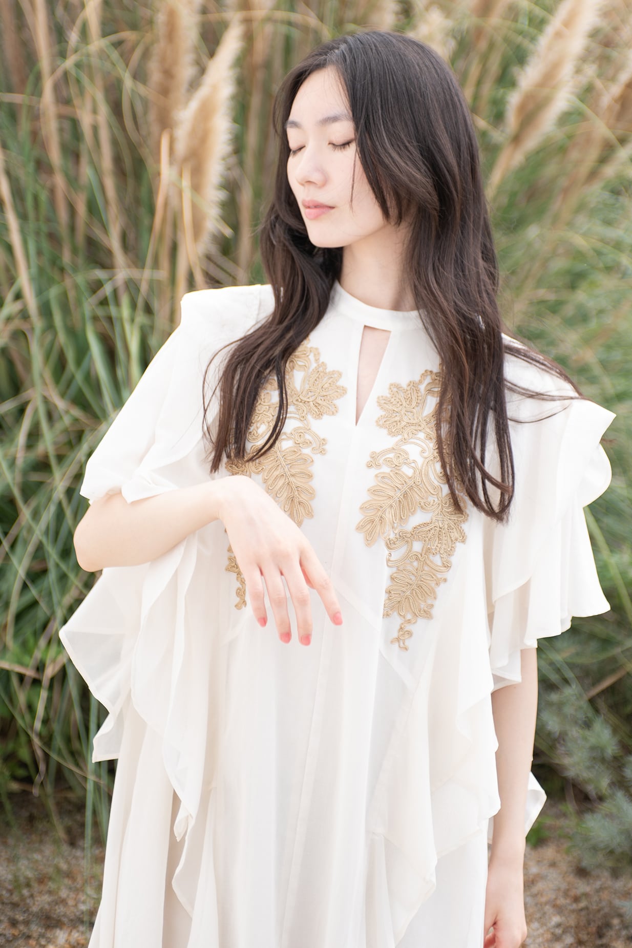 ゆったりとしたシルエットと風をまとうようなエアリーな美しさを演出する、繊細なクラフトマンシップと女性らしい優雅さが調和した一着です。