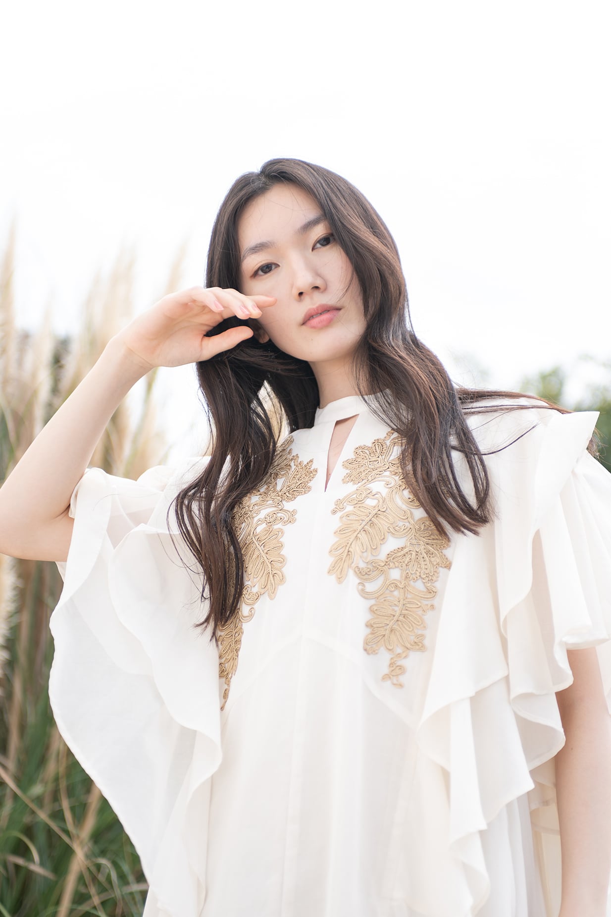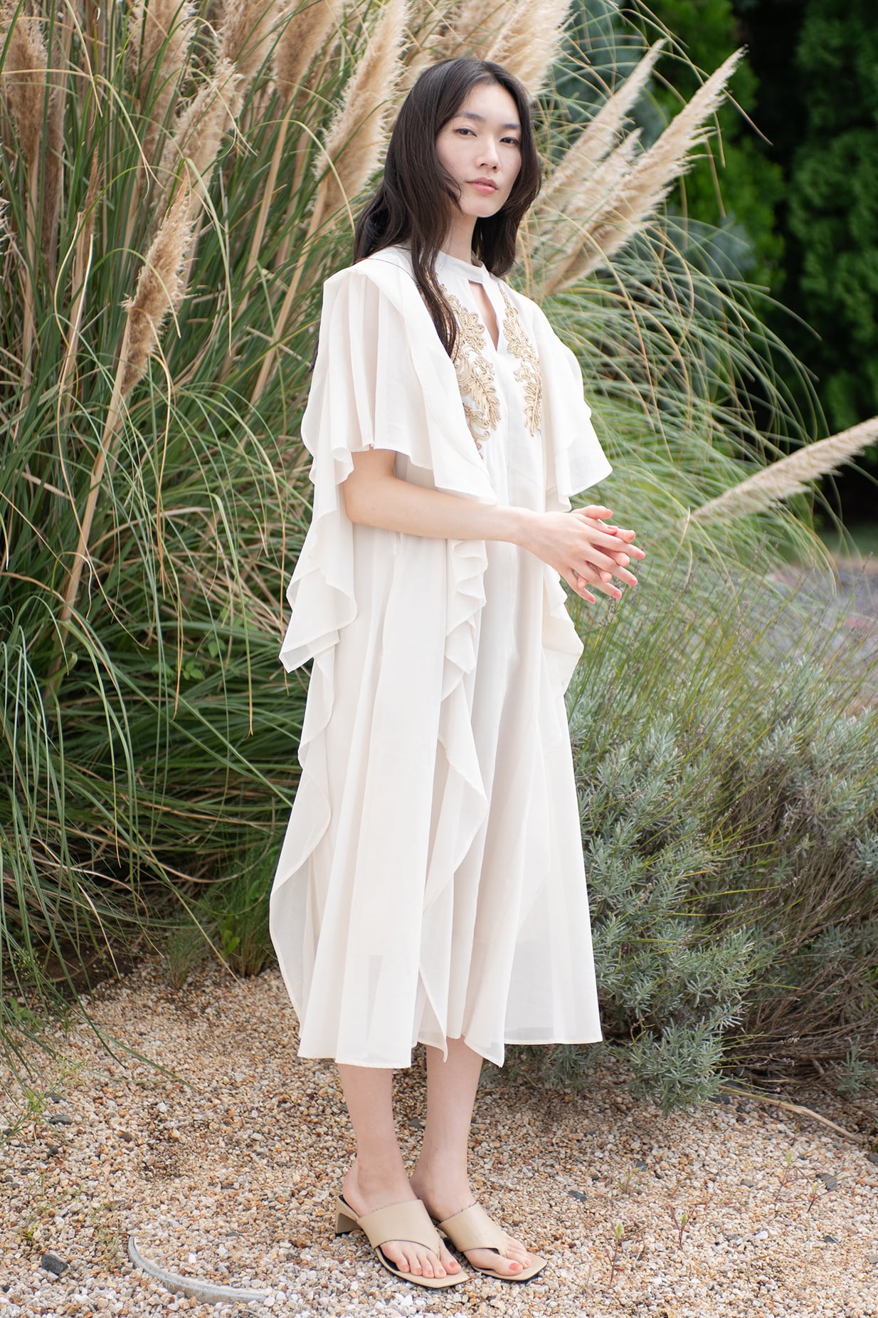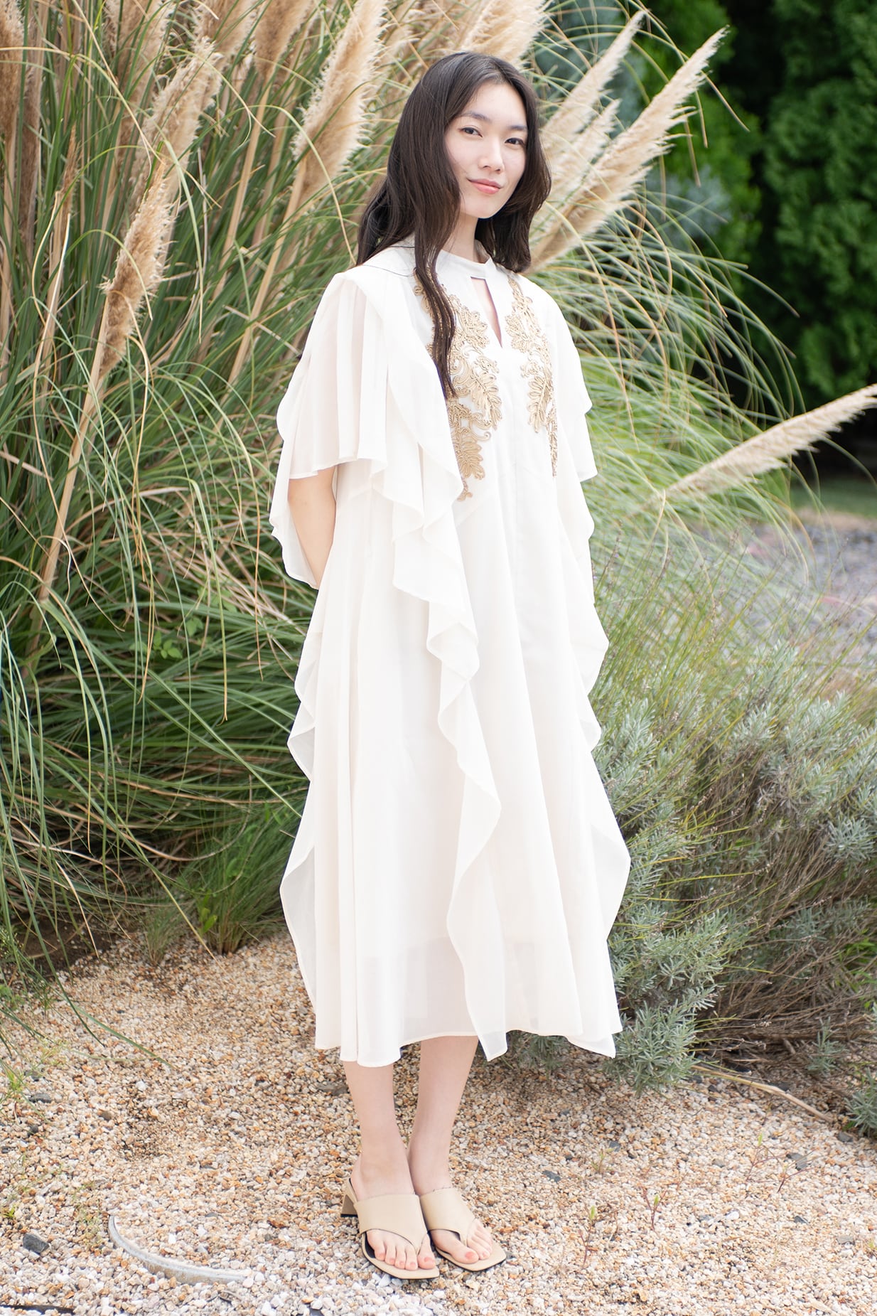 ゆったりとしたシルエットと風をまとうようなエアリーな美しさを演出する、繊細なクラフトマンシップと女性らしい優雅さが調和した一着です。