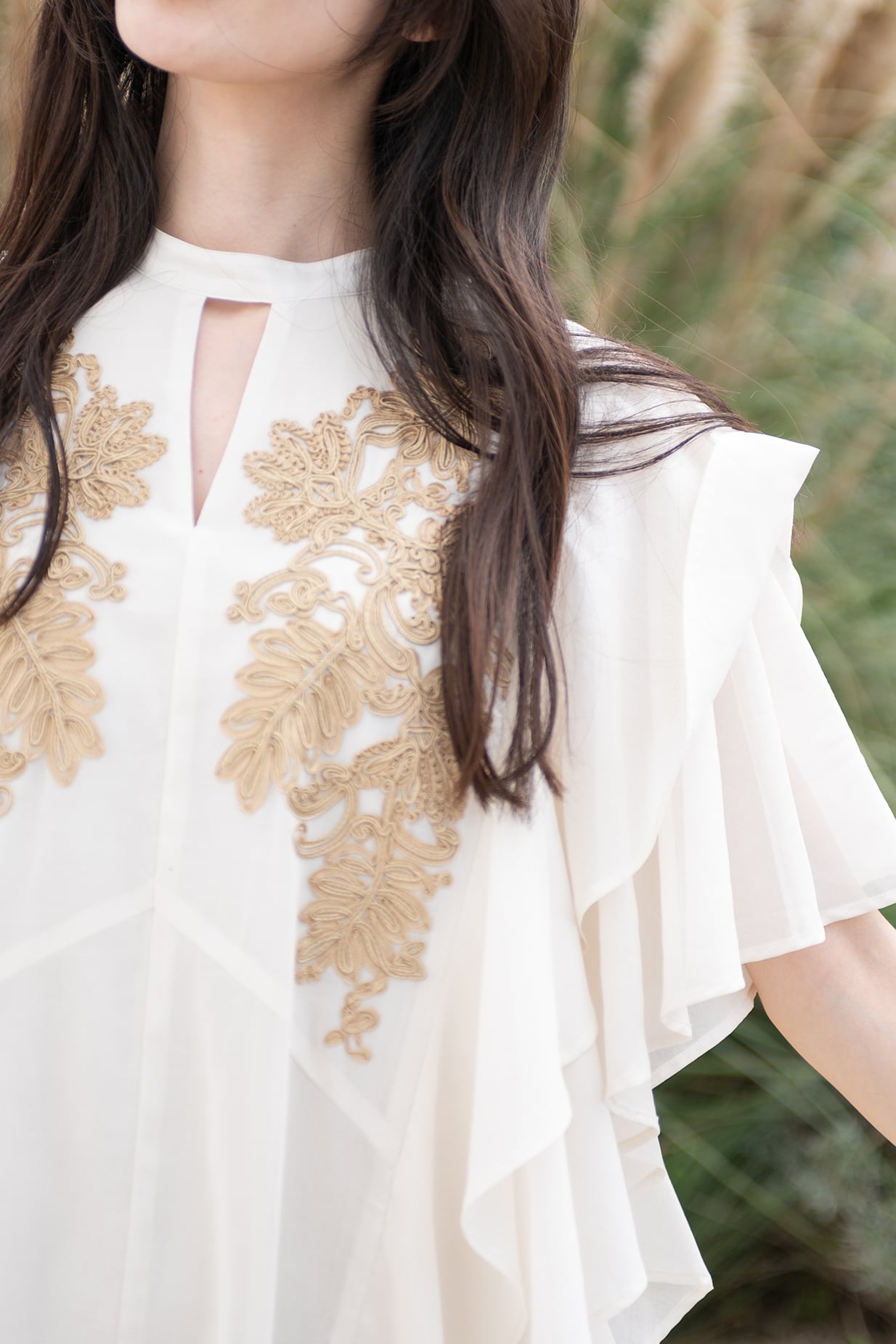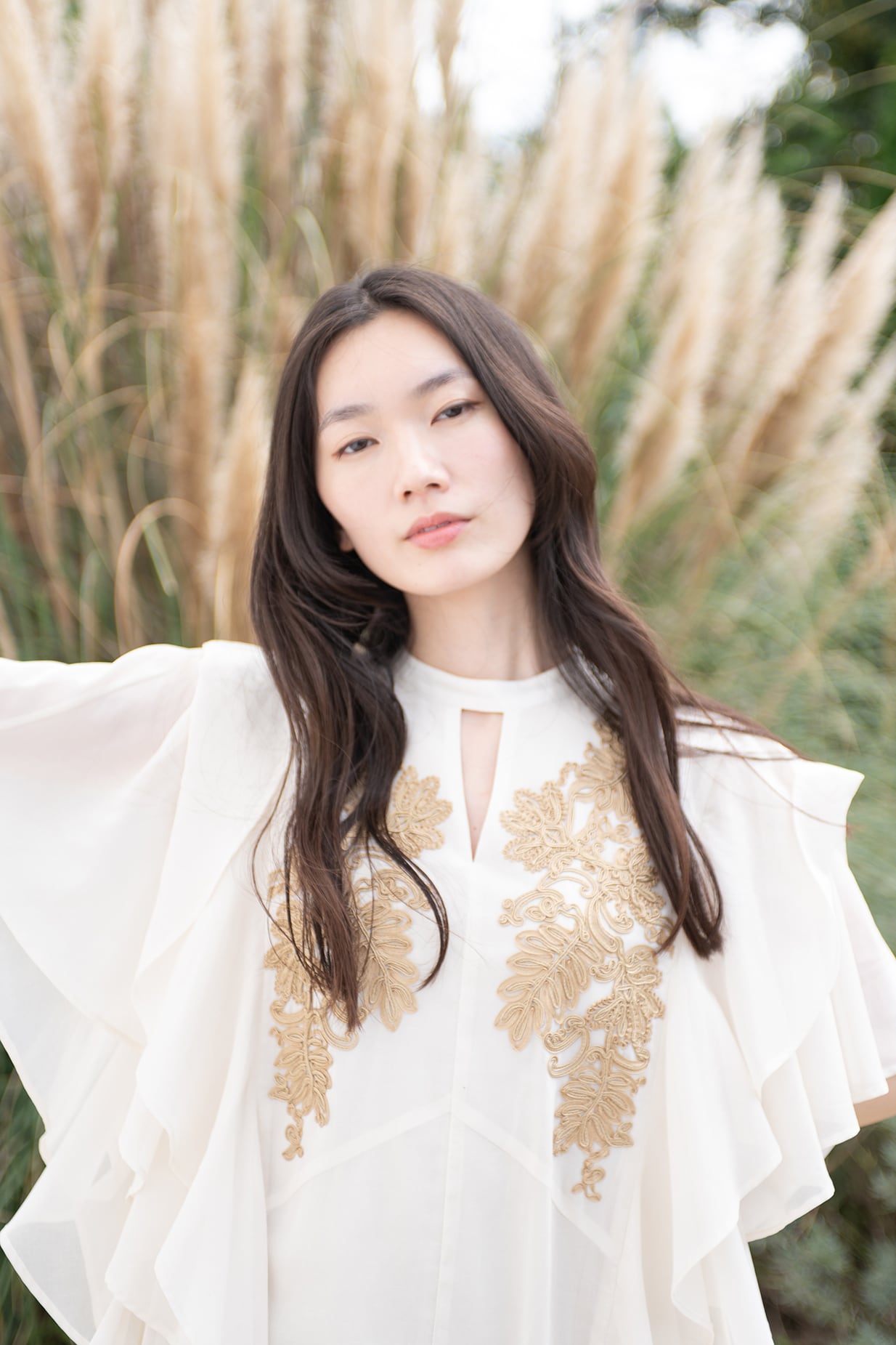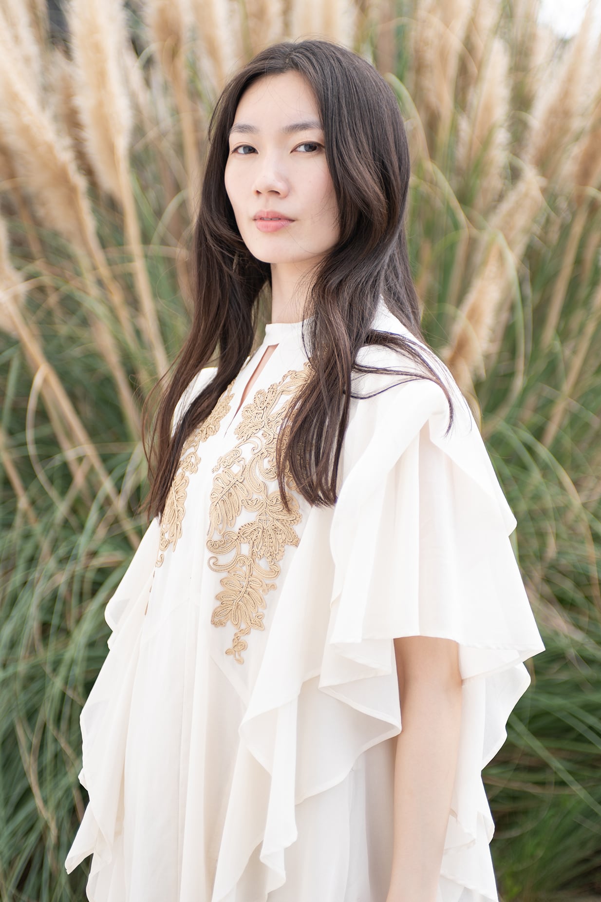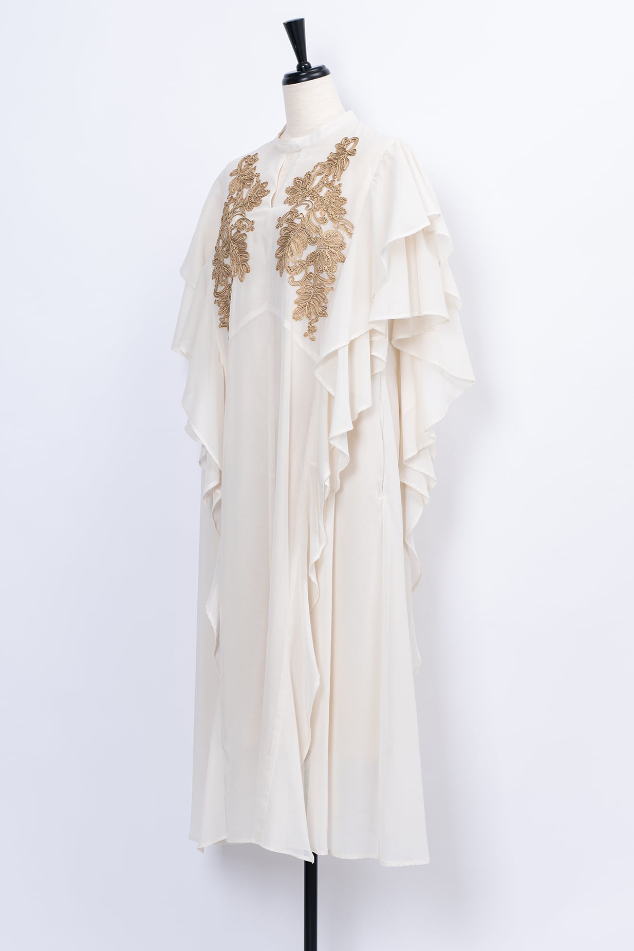 ゆったりとしたシルエットと風をまとうようなエアリーな美しさを演出する、繊細なクラフトマンシップと女性らしい優雅さが調和した一着です。