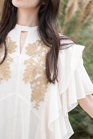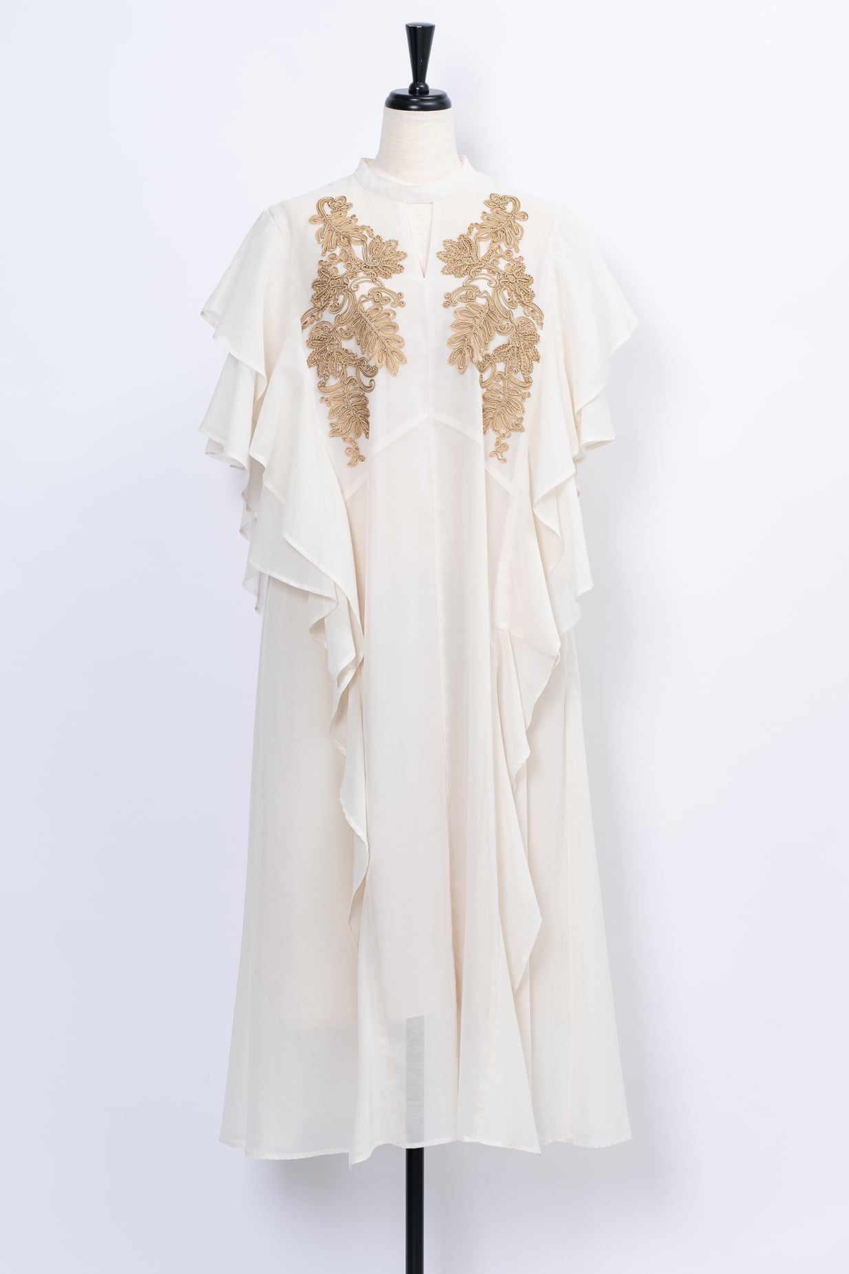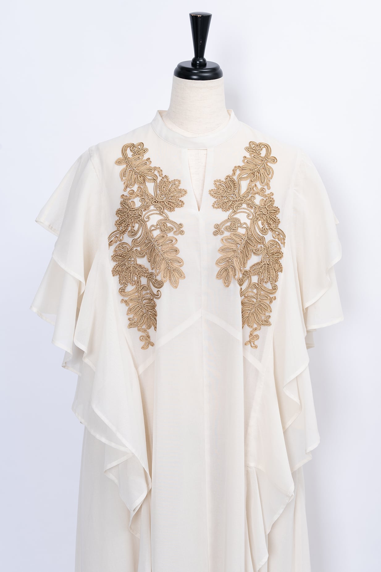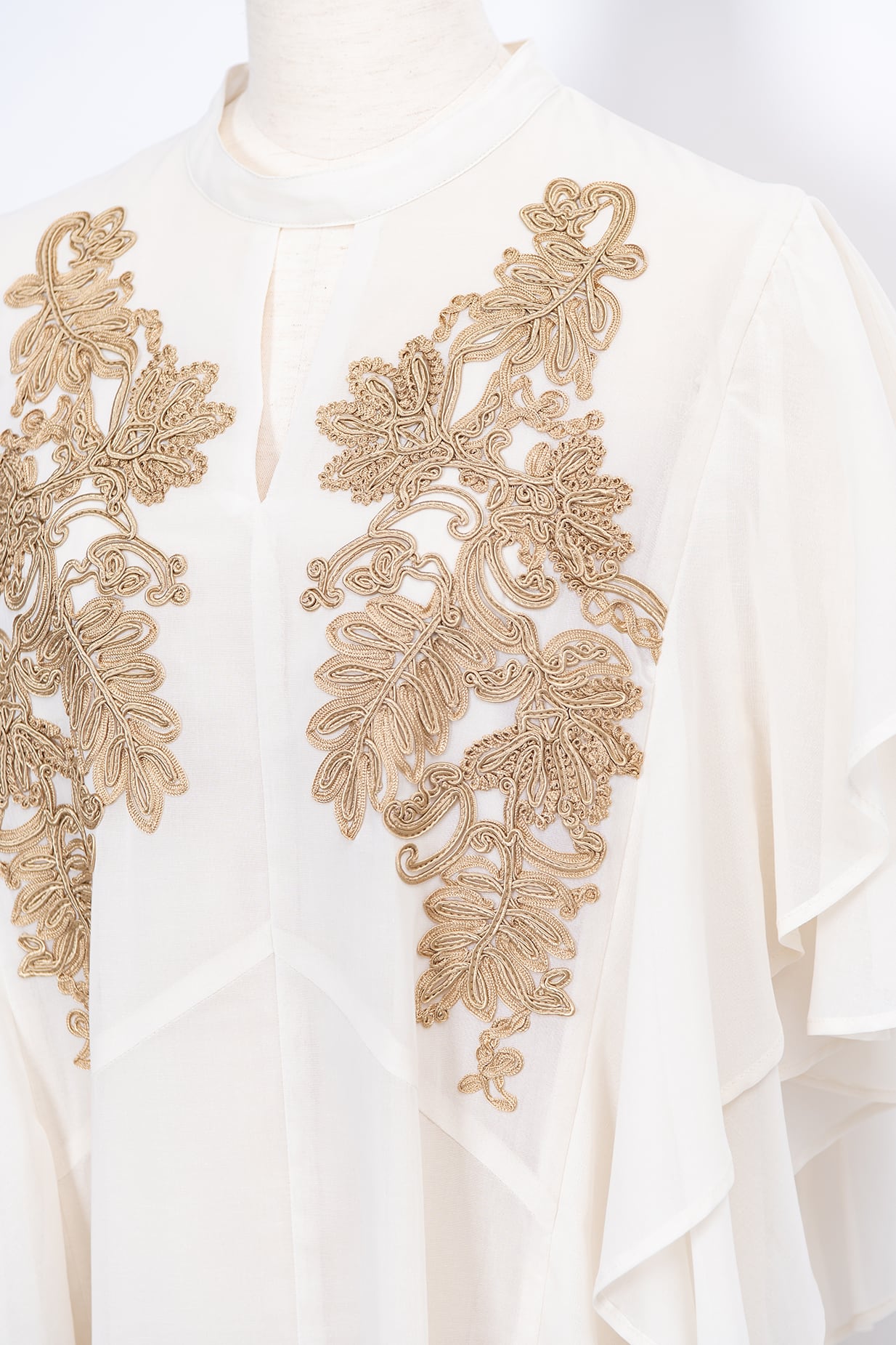 胸元には繊細なコード刺繍を贅沢にあしらい、上品な立体感と華やぎをプラス。