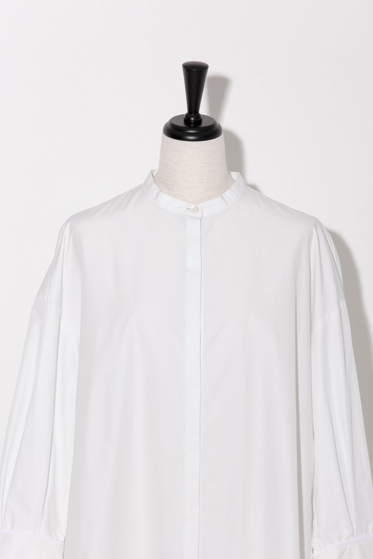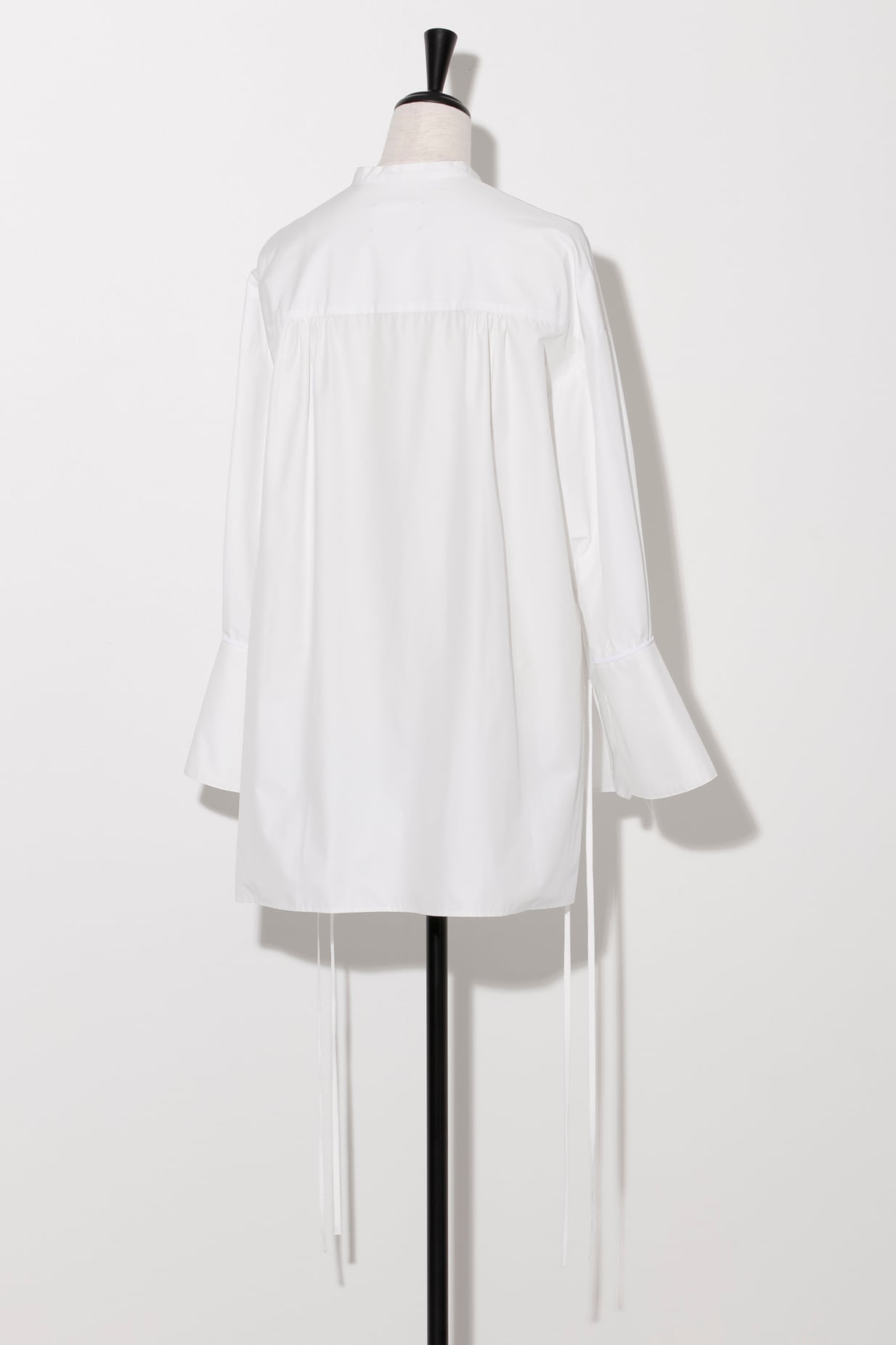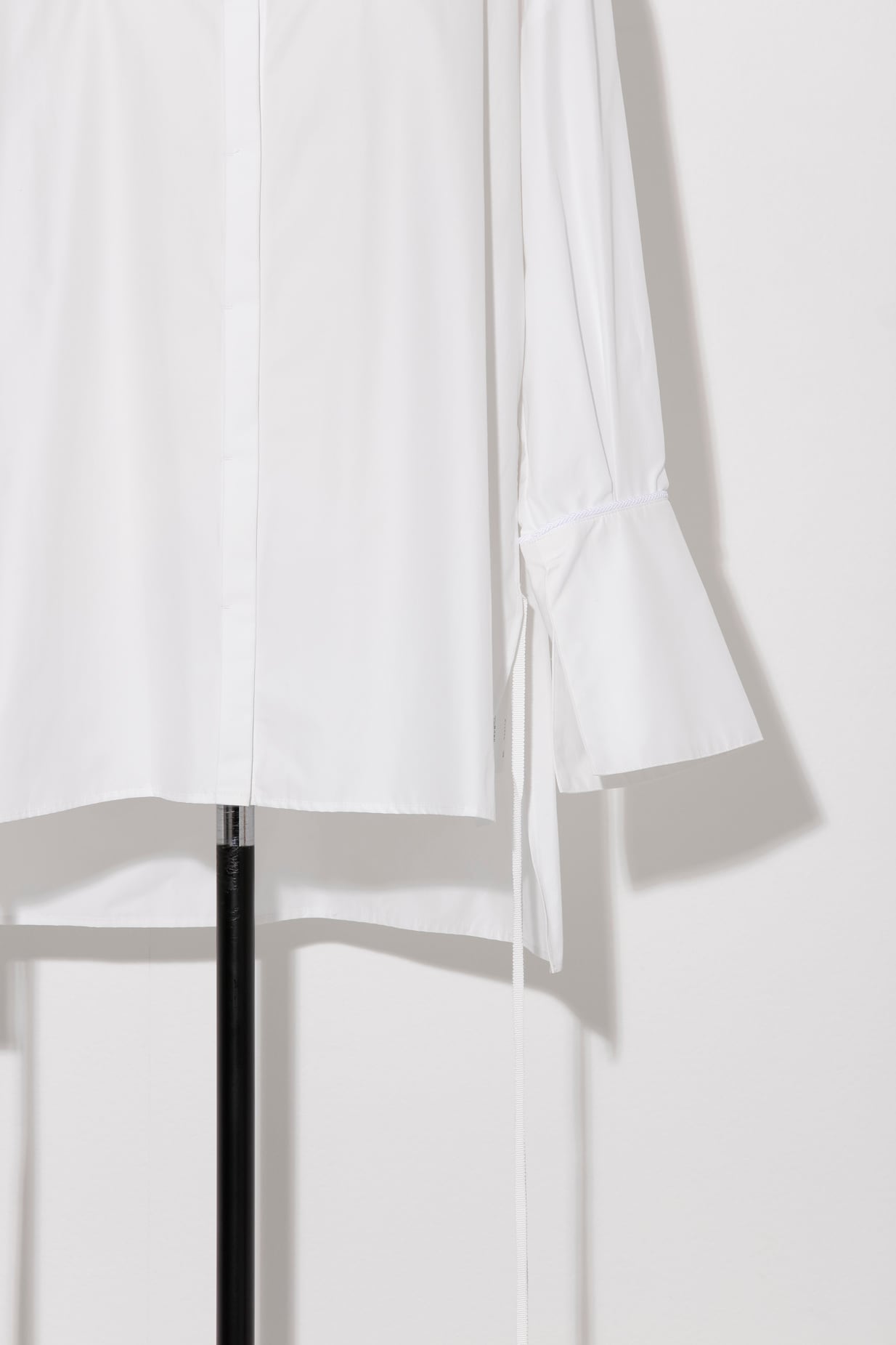 バンドカラーシャツをベースに、身頃は比翼仕立てでディテールを抑えてすっきりと。対して、裾近くに同色のグログランのロングテープを配しアクセントにしました。前はラウンドヘム、後ろはストレートヘムと変化をつけています。