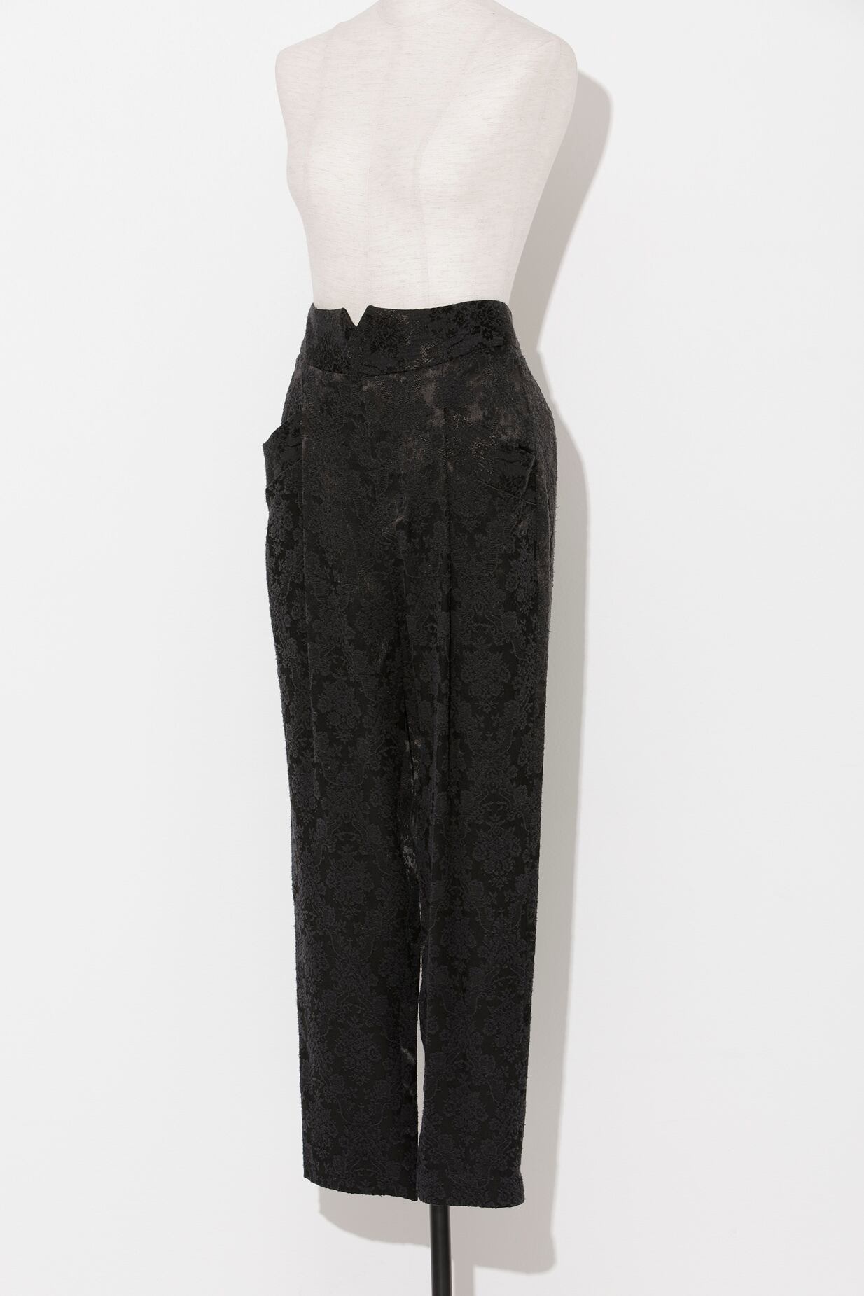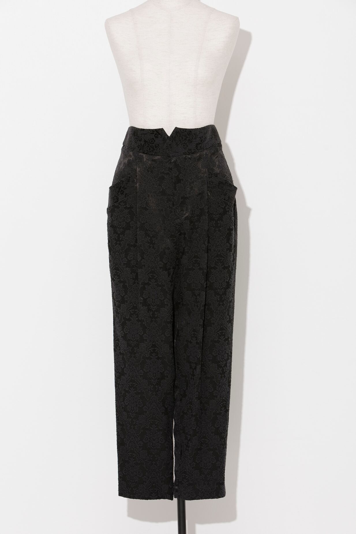 クラシカルなダマスク柄のテーパードパンツ。微光沢のある素材をベースに柄を立体的に表現したシルクとレーヨンのジャカード生地の、存在感のある1本です。