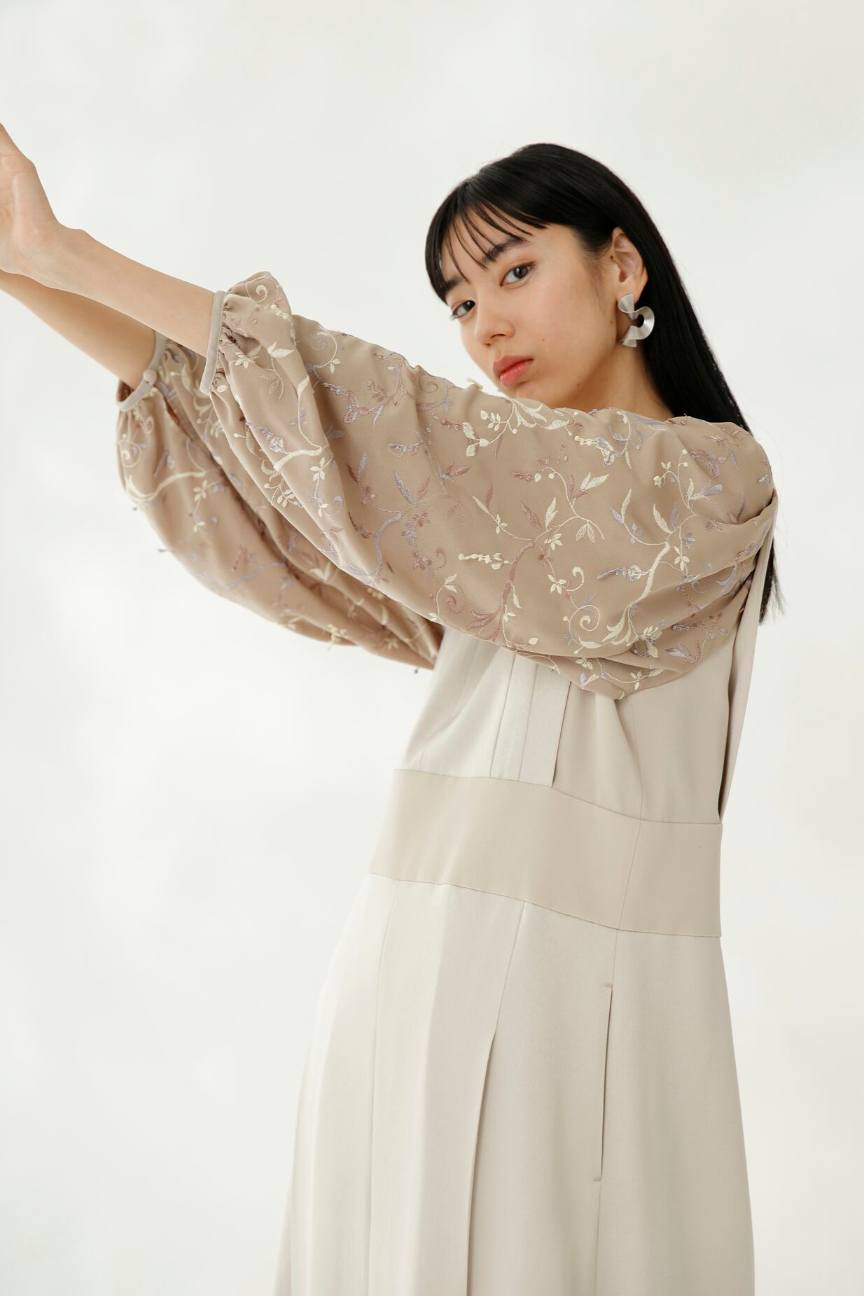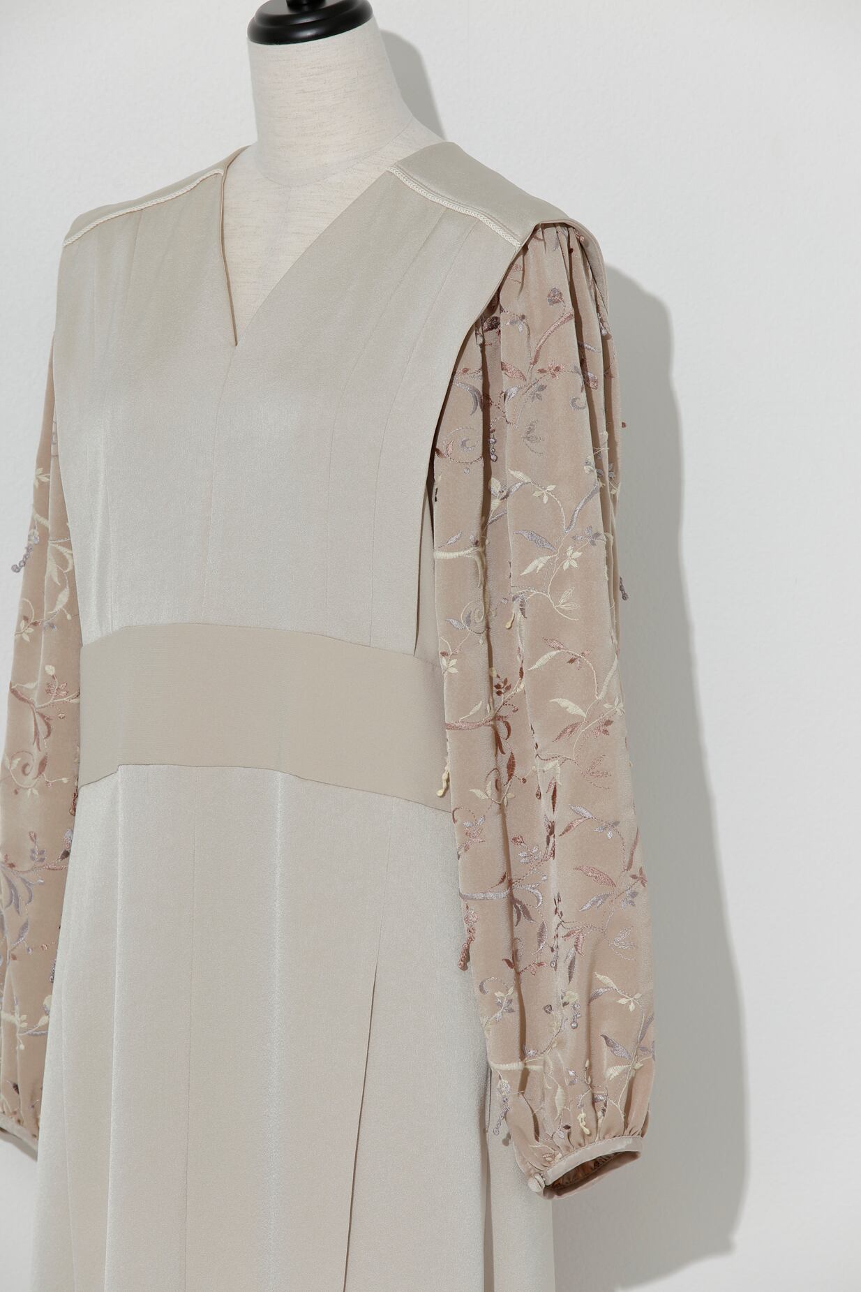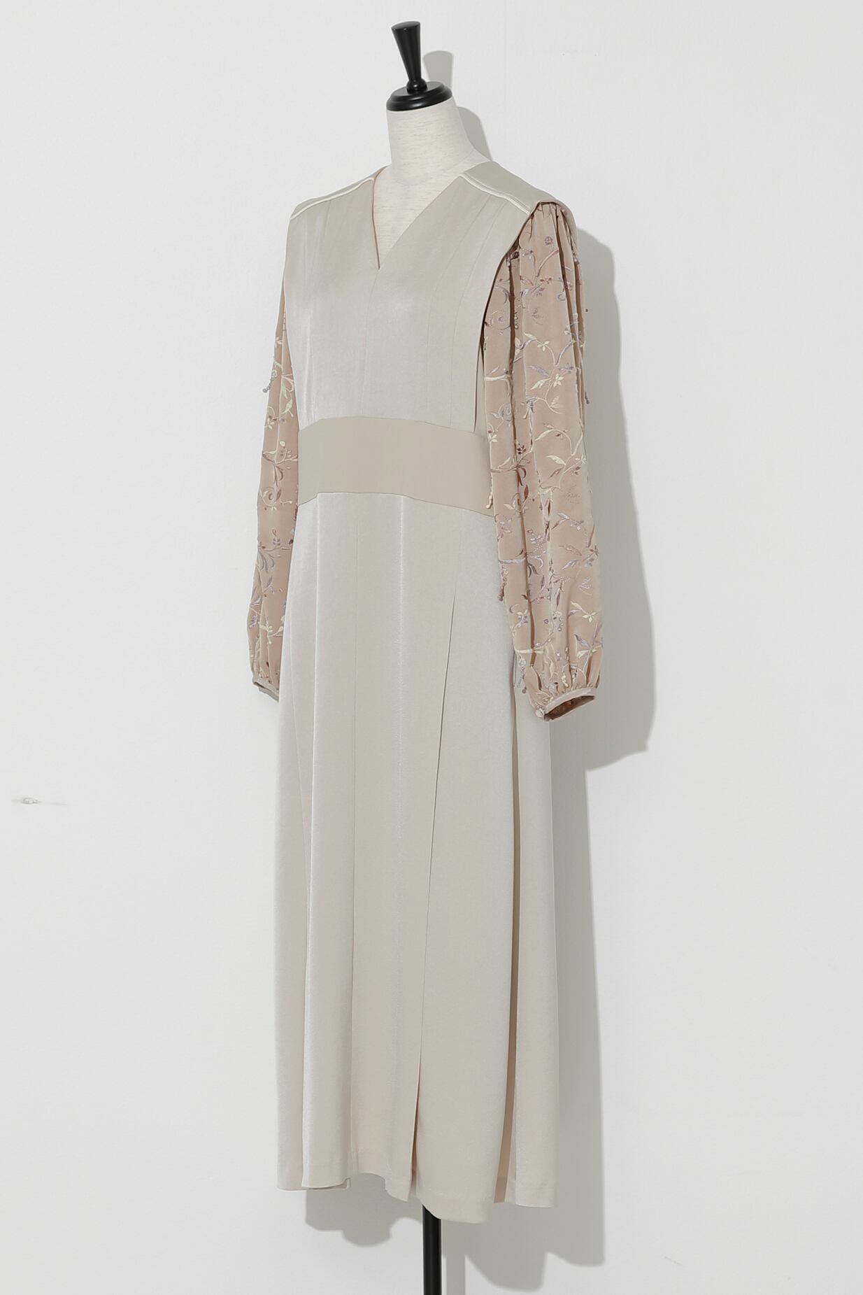 繊細なフラワー刺繍が印象的な袖コンシャスドレス。