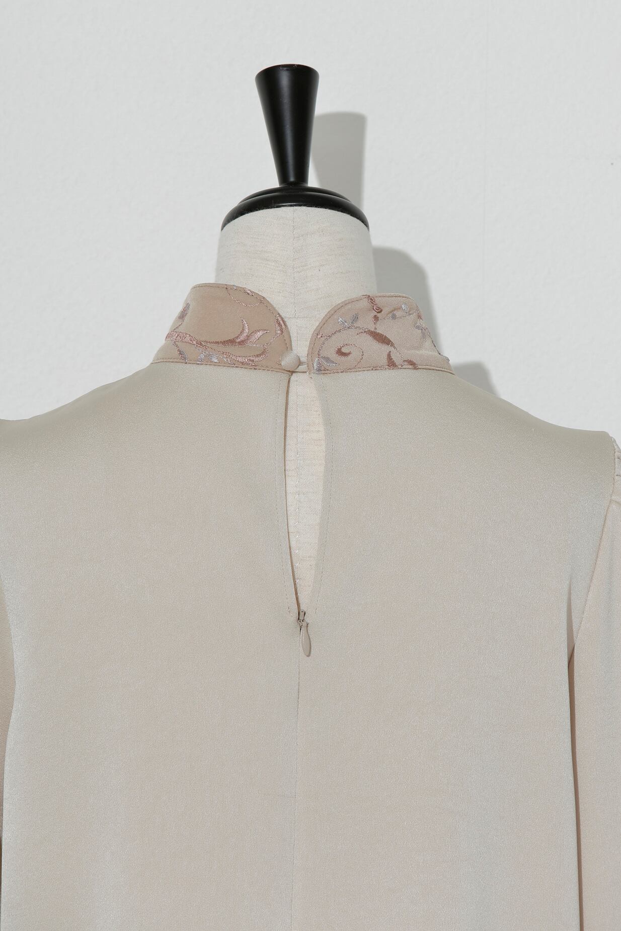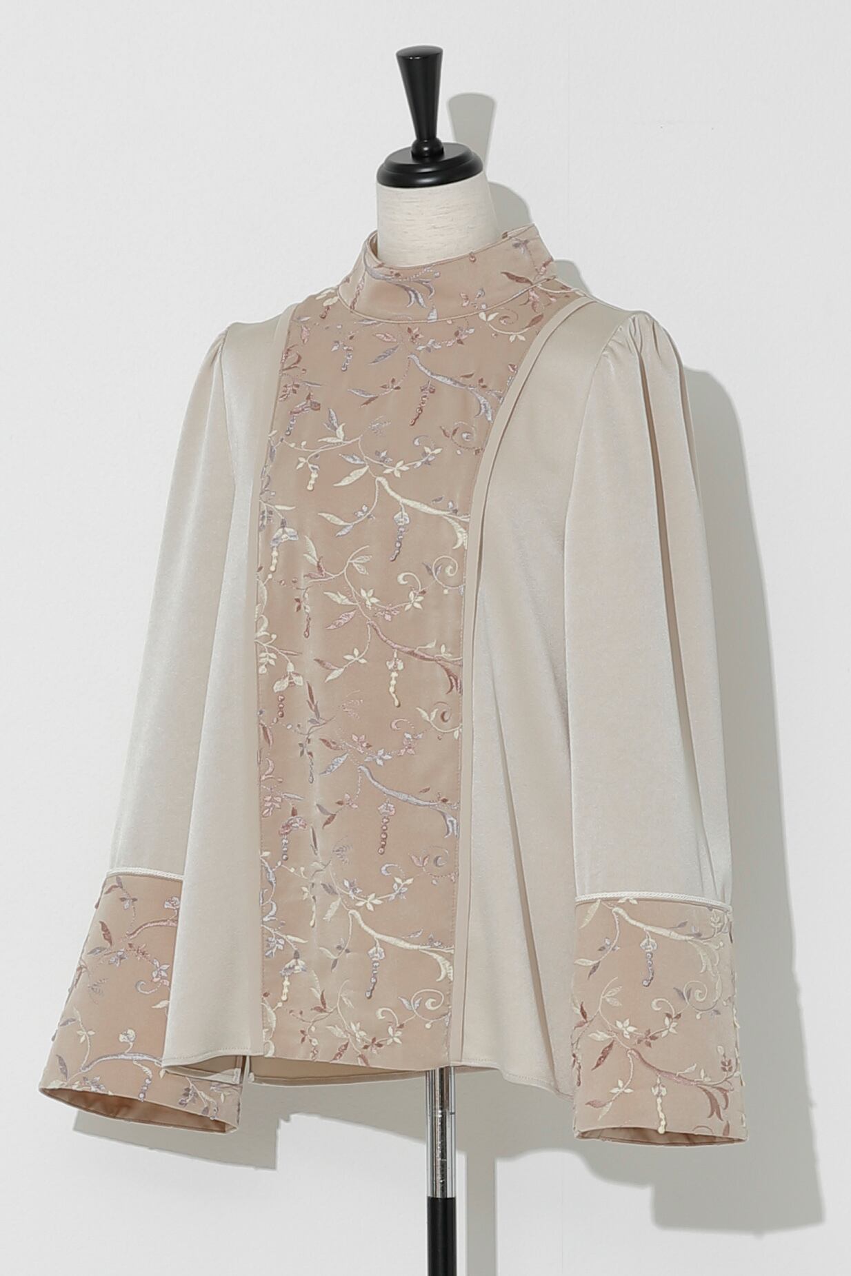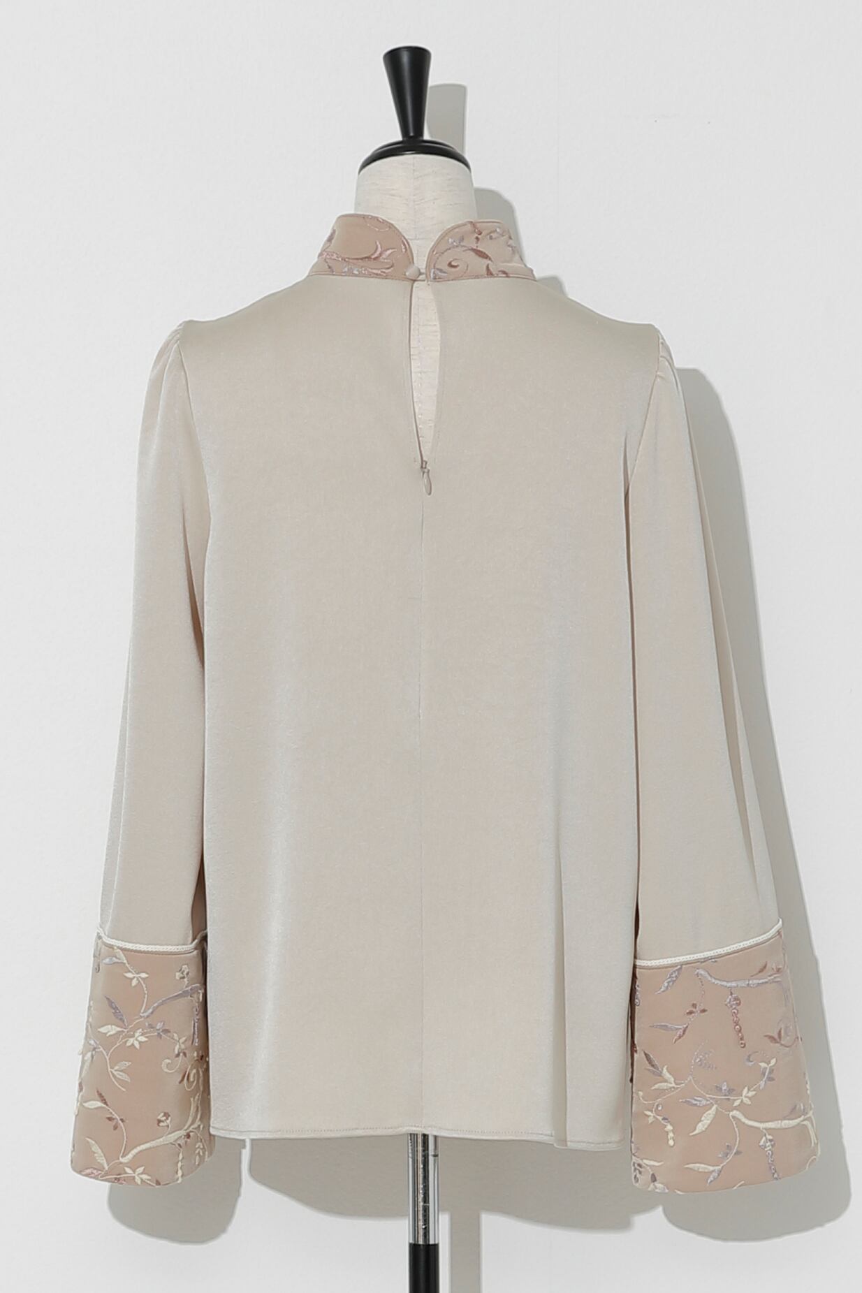 フロントとカフスにあしらった繊細なフラワー刺繍が印象的なスタンドカラーブラウス。