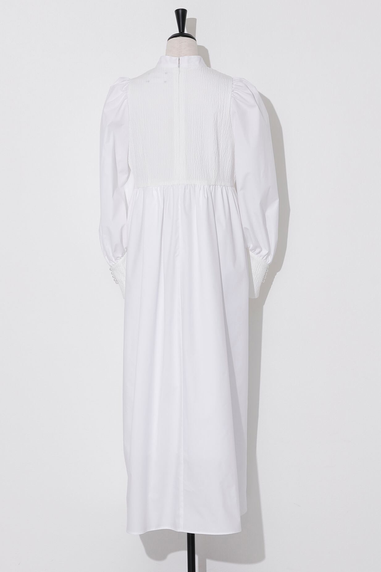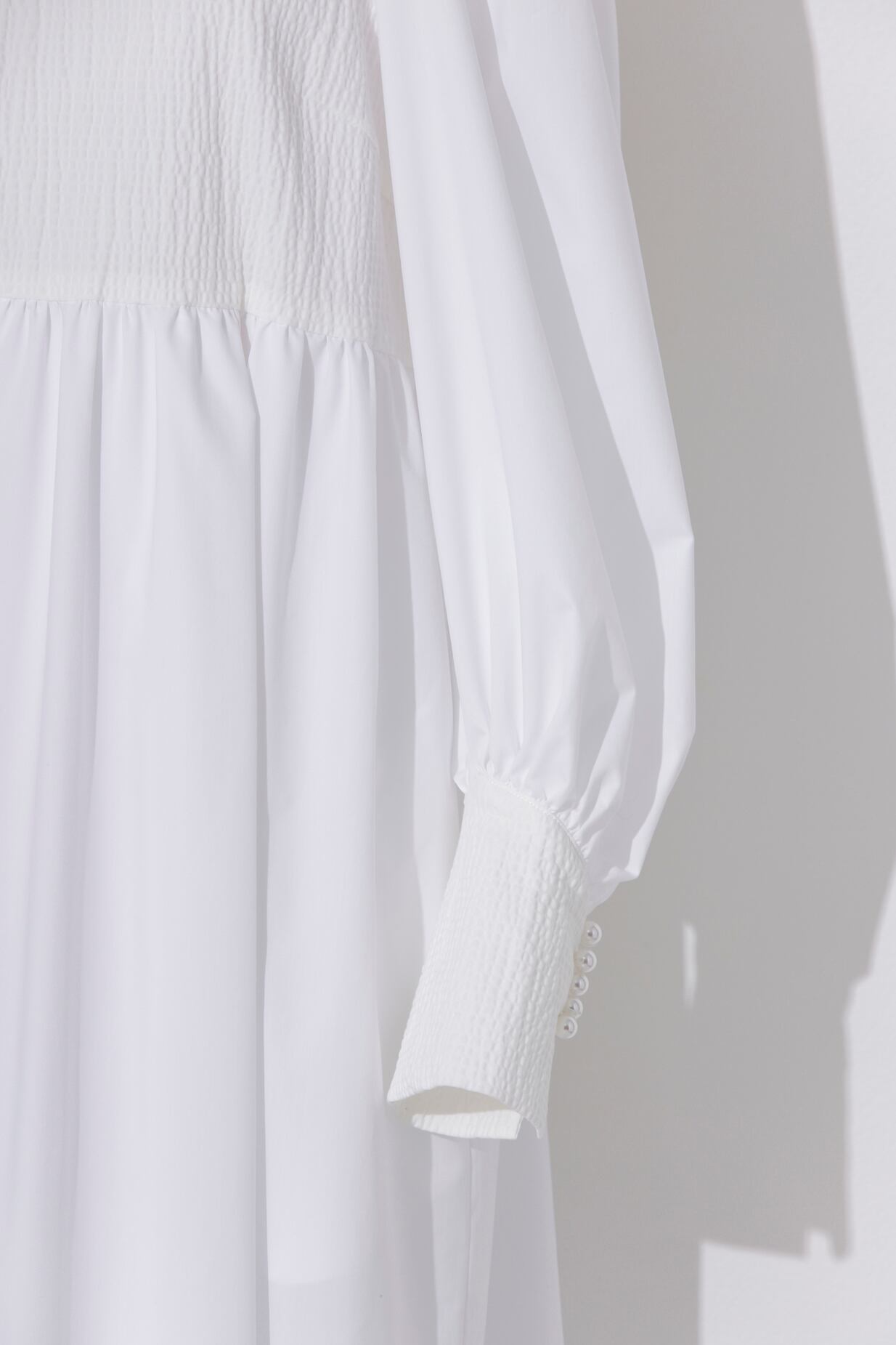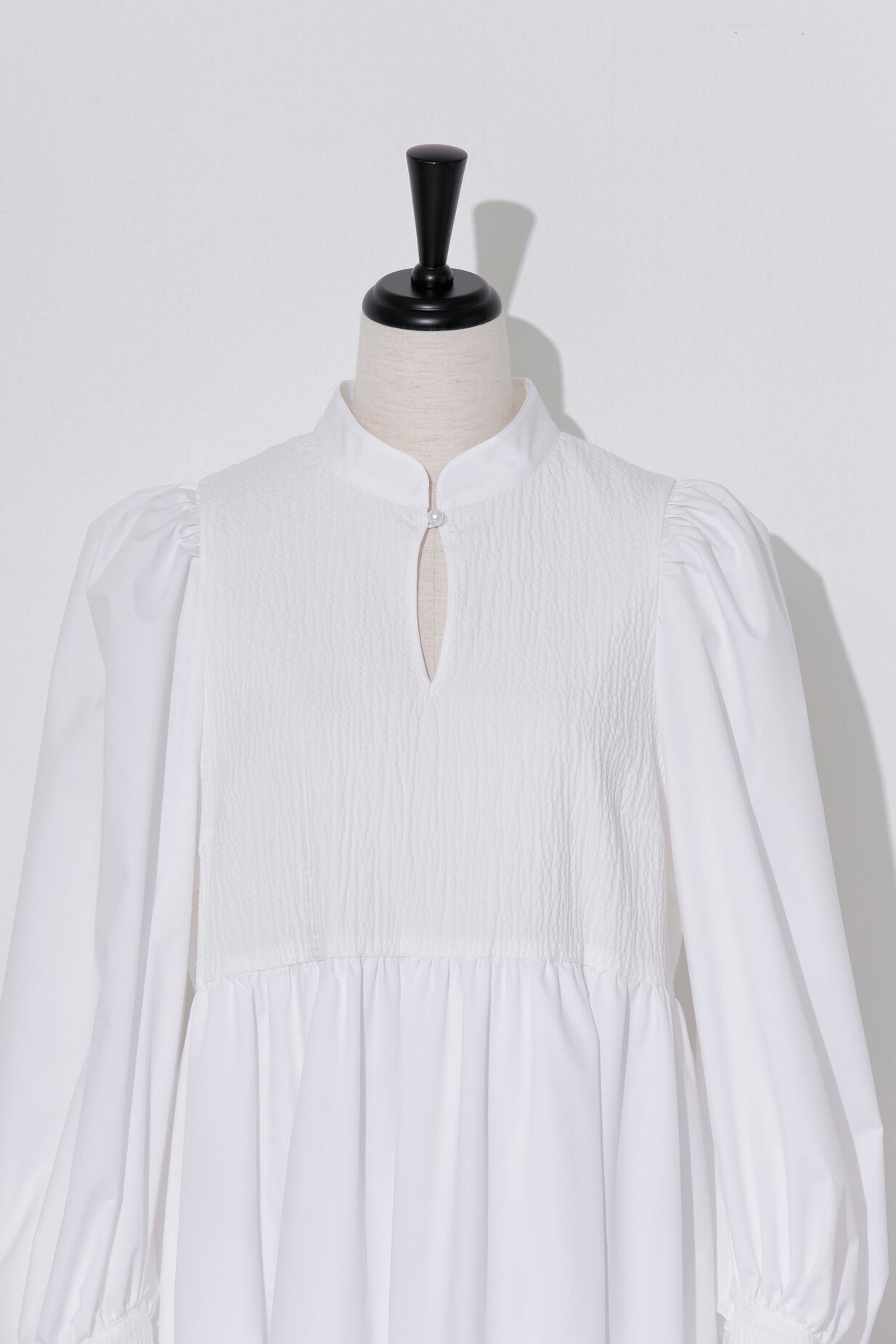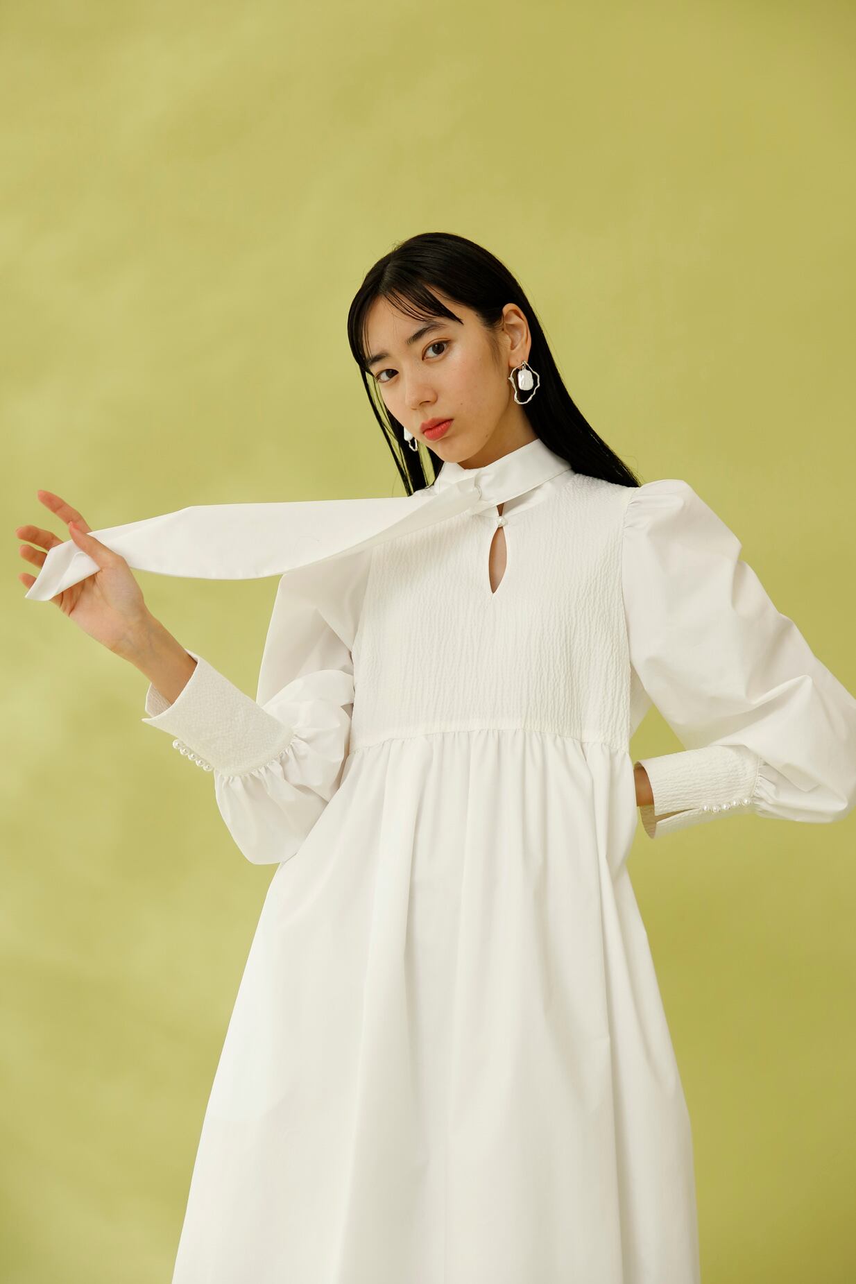 ワンピースはポコポコとした凹凸感のあるリップル加工を施した生地と、ハリのある高密のブロードを異素材で切り替え一枚で様になるデザインに。