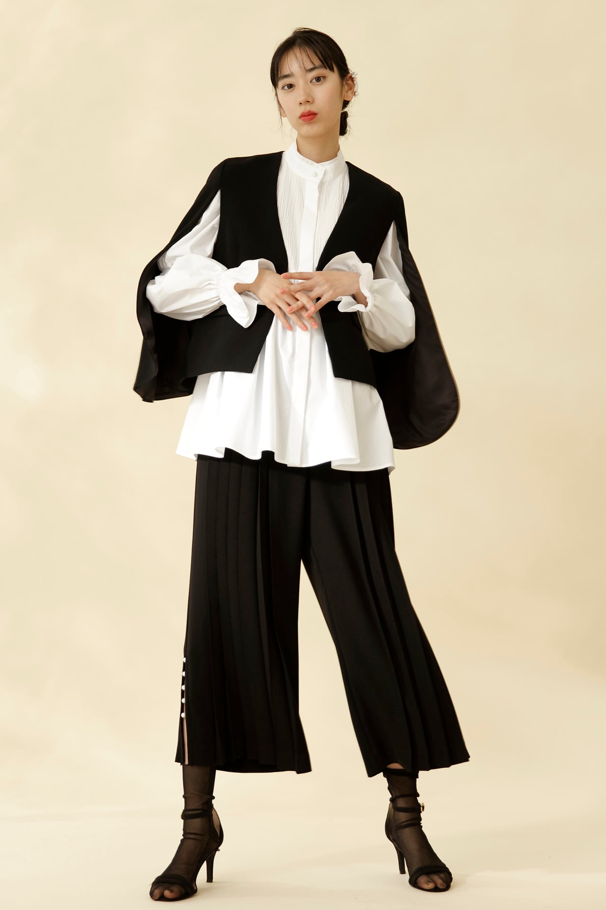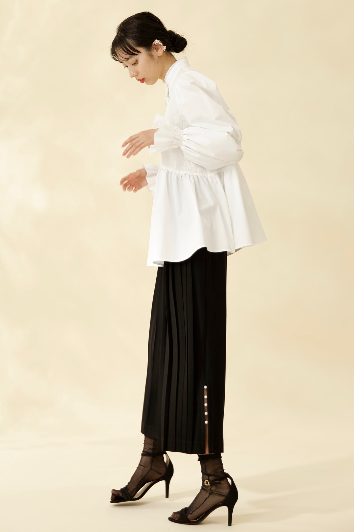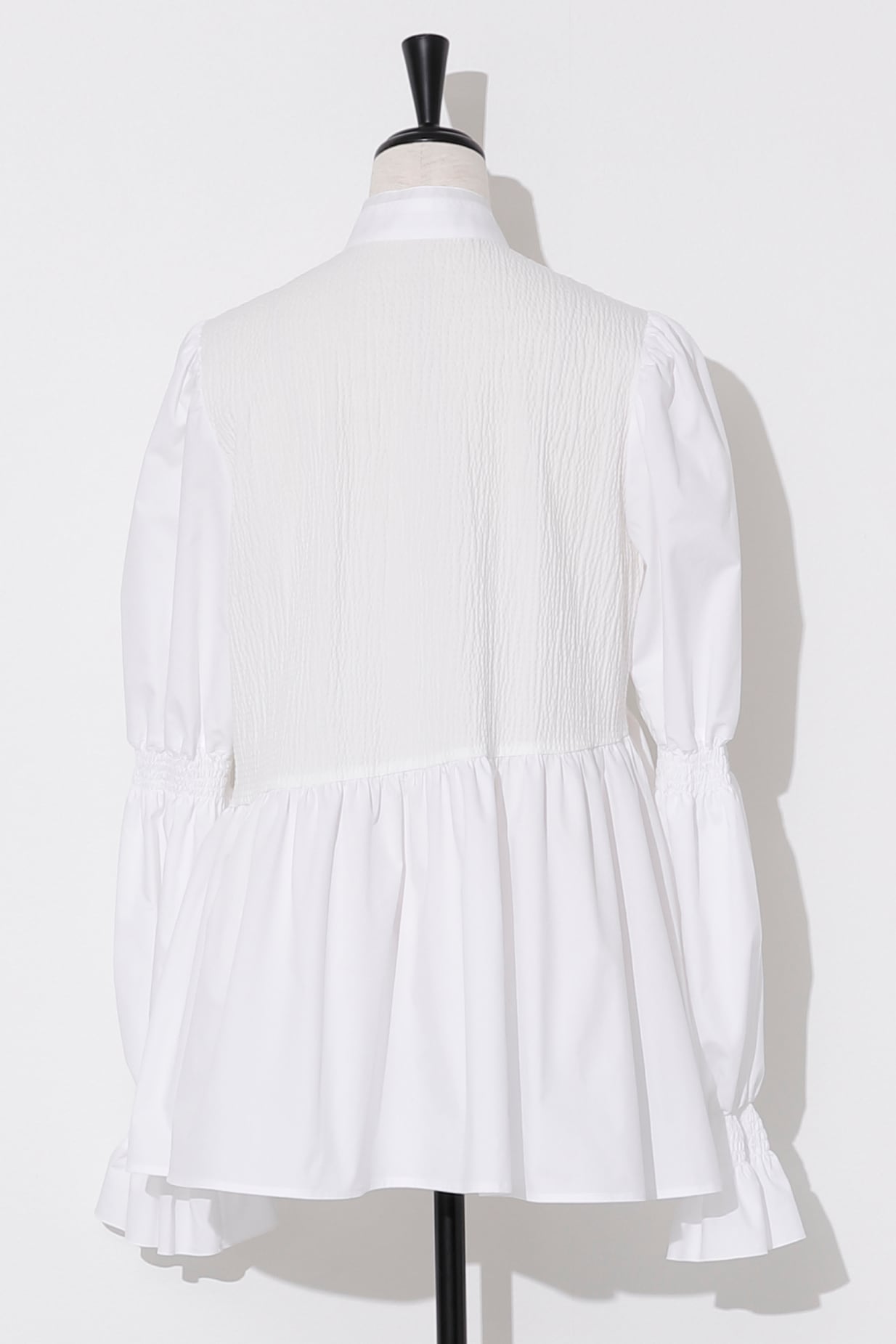 パール釦とスリーブに入ったシャーリングがポイントのパフスリーブブラウスは、凹凸感のあるリップル加工を施した生地と、ハリのある高密のブロードの異素材使い。