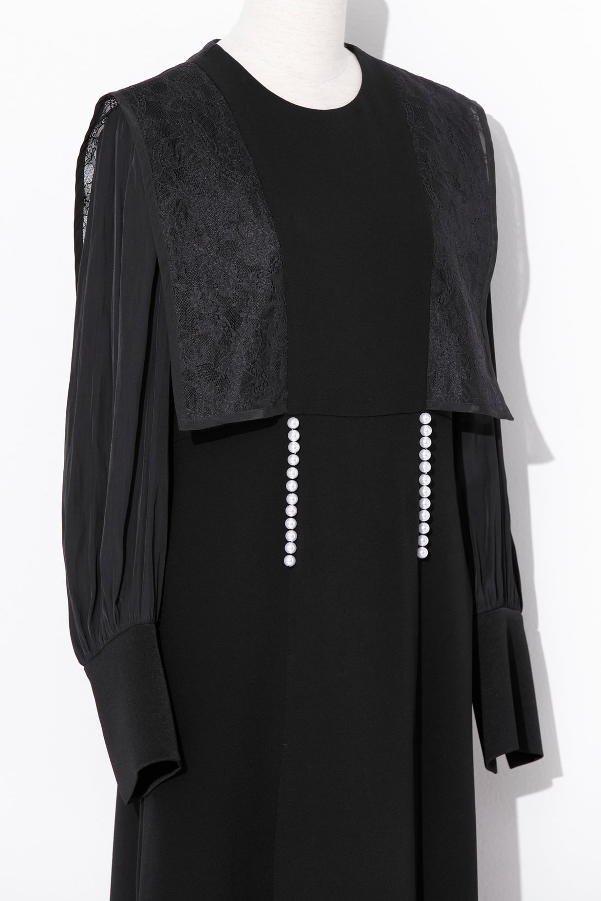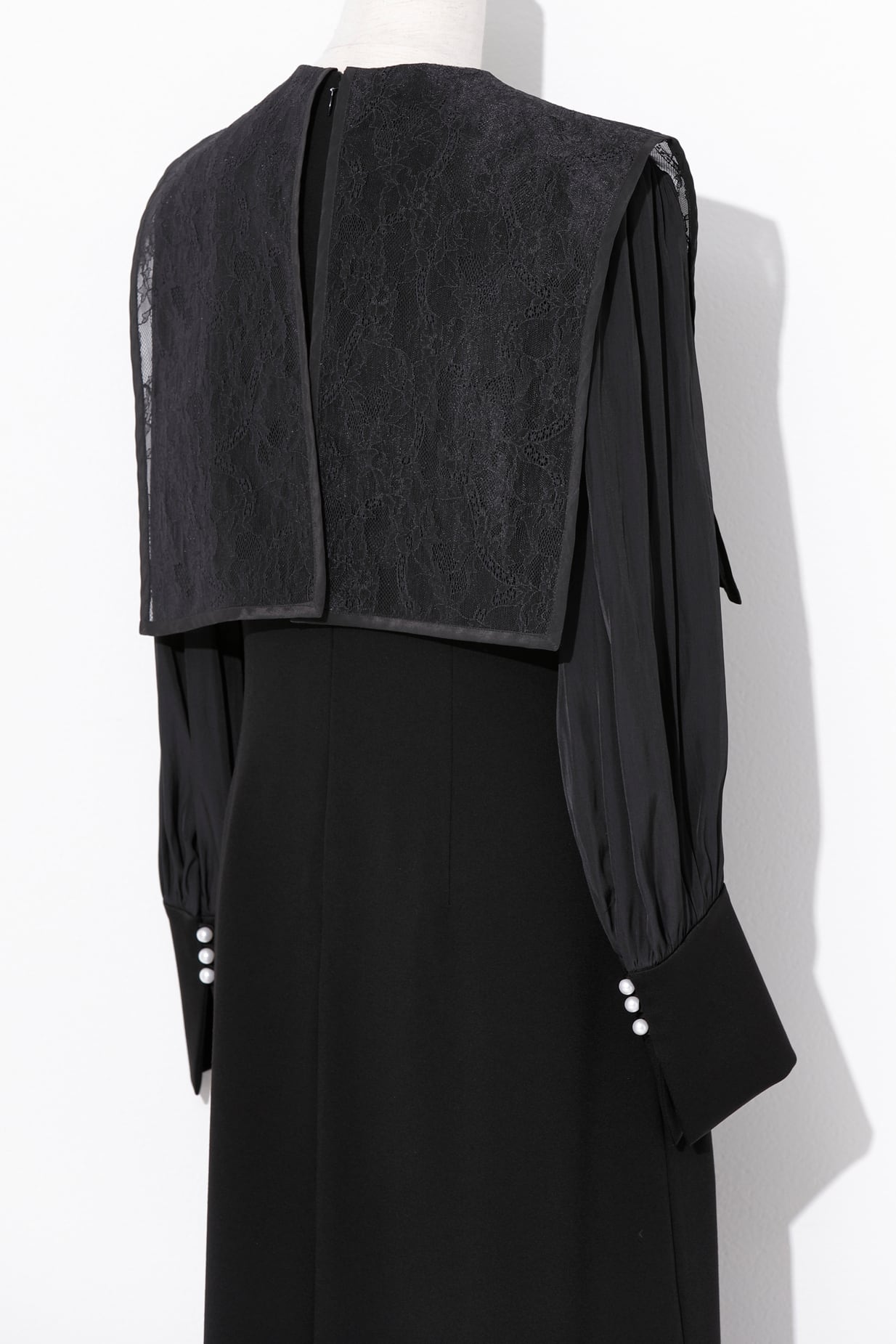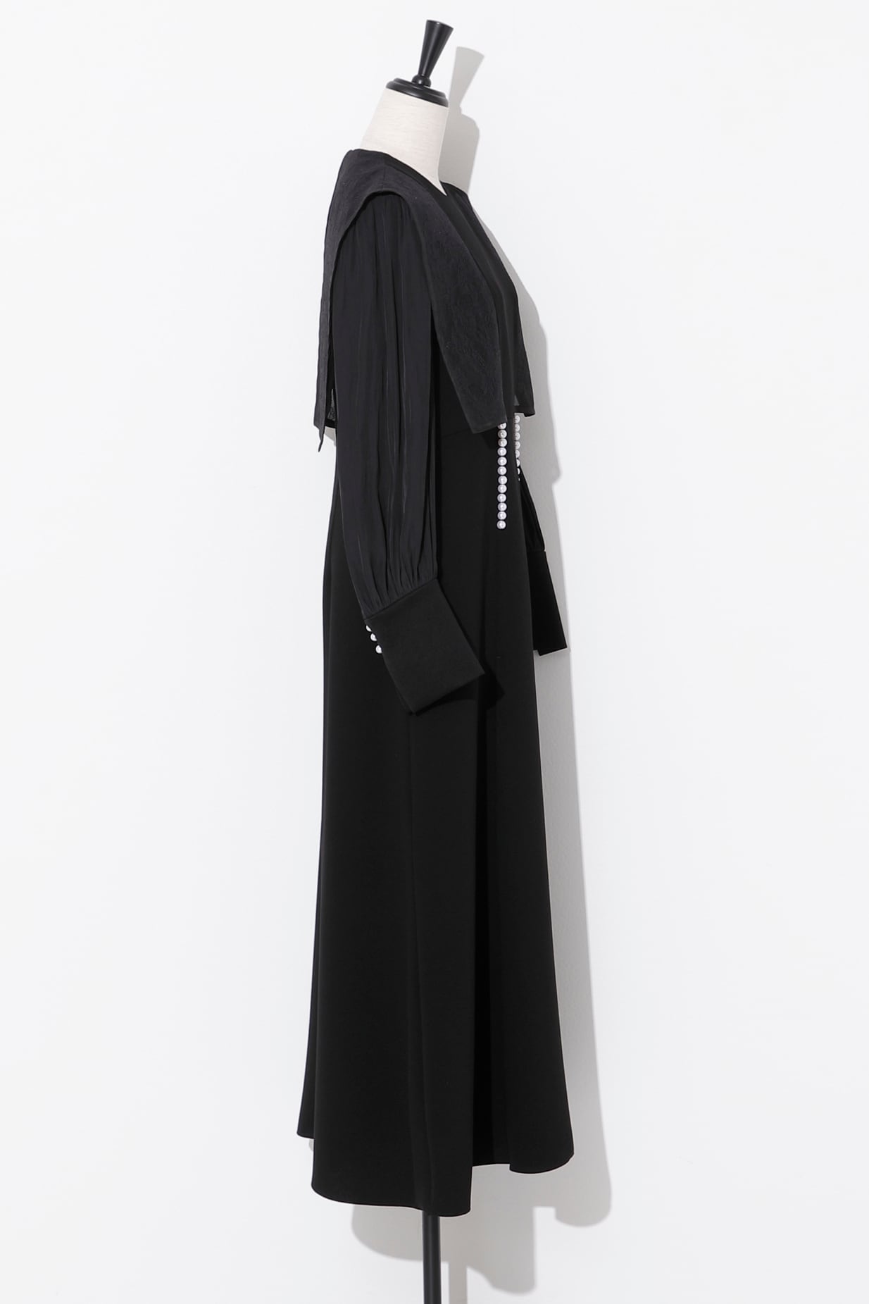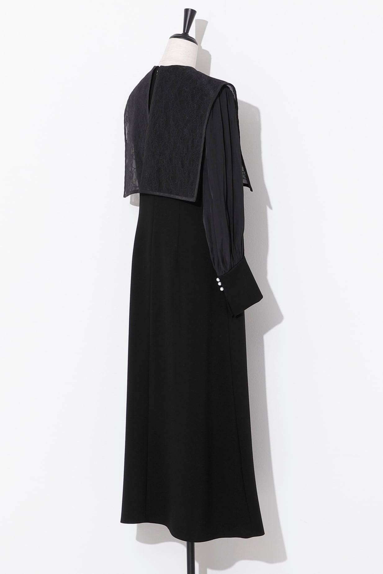 前見ごろと、カフスのスリット部分にあしらったパールが品良く映えるエレガントなドレス。