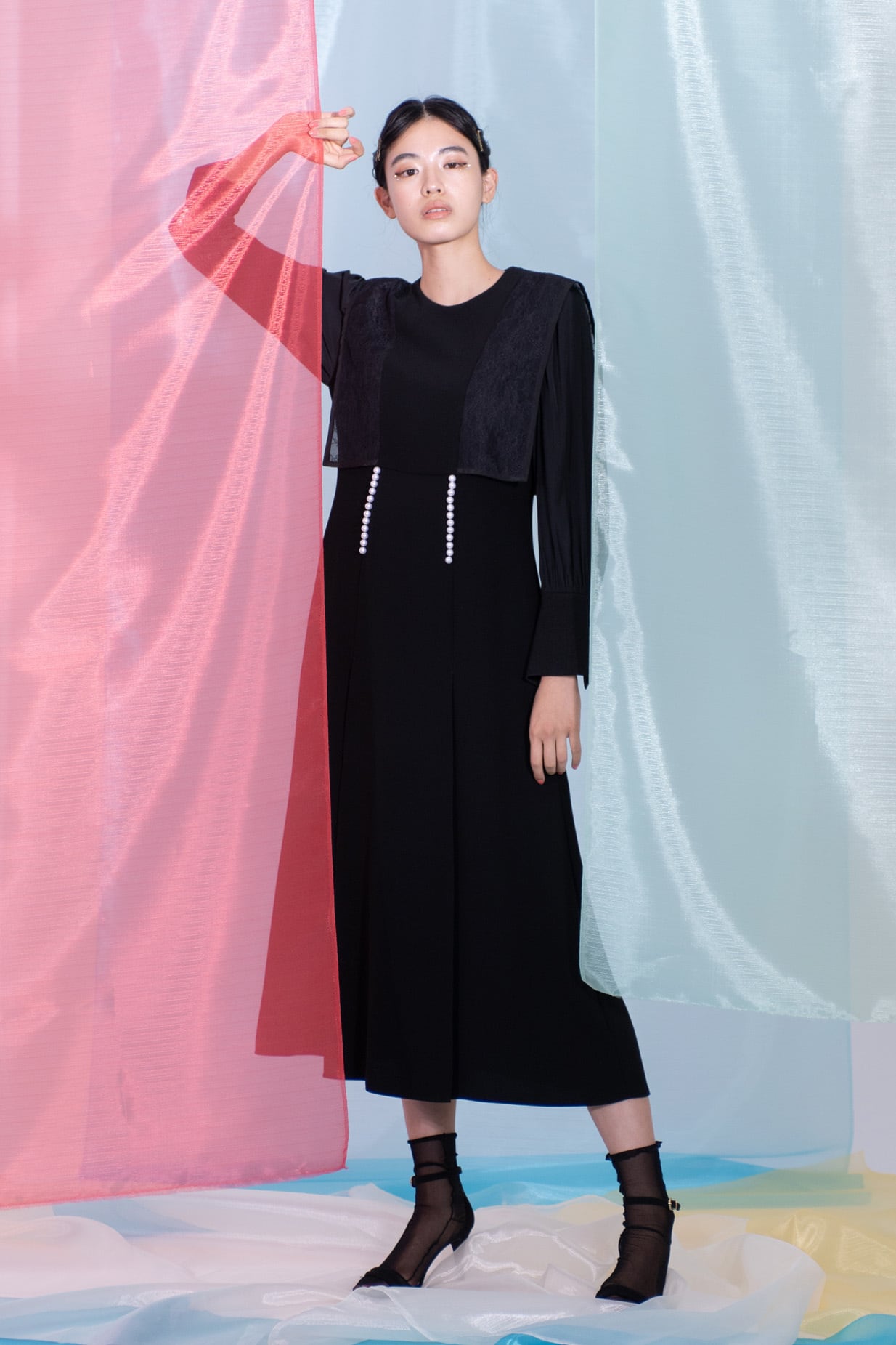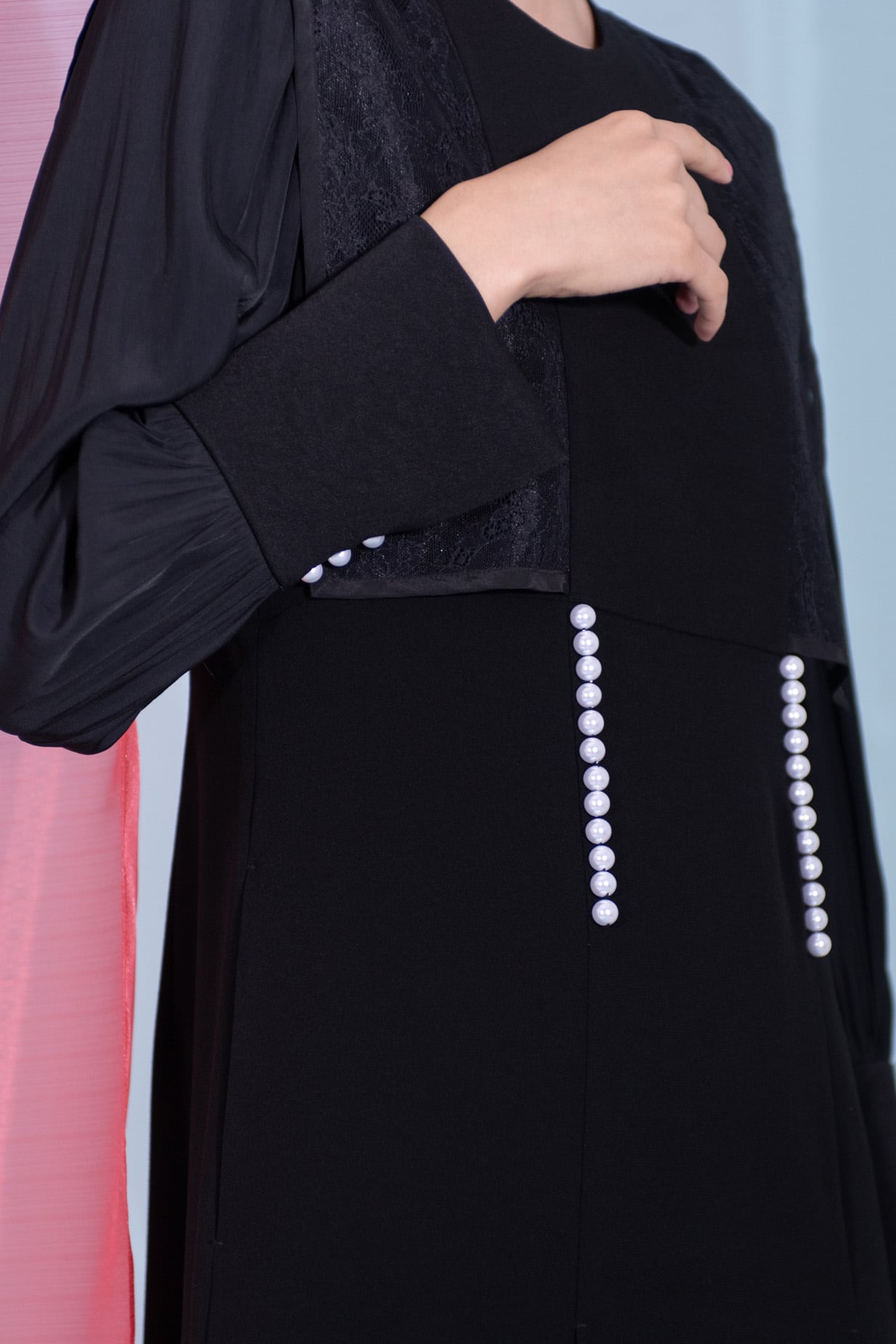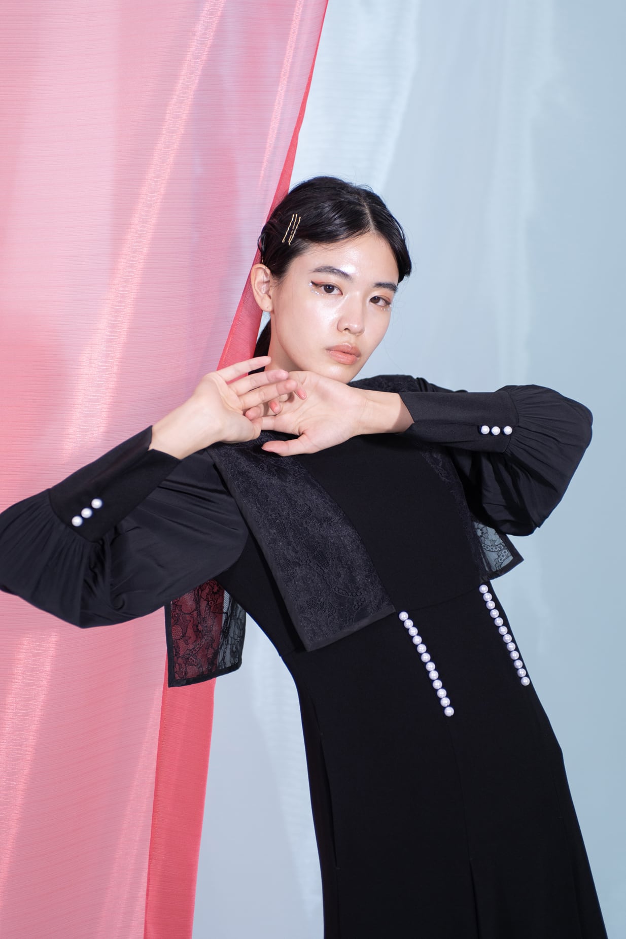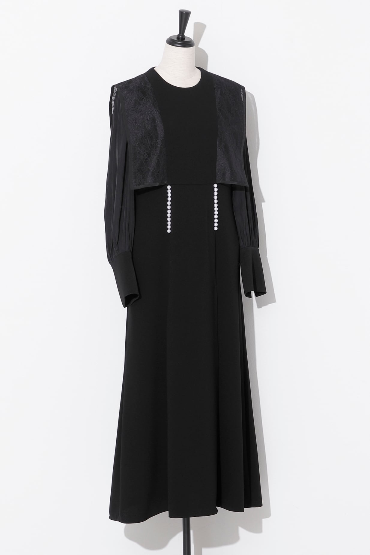 前見ごろと、カフスのスリット部分にあしらったパールが品良く映えるエレガントなドレス。